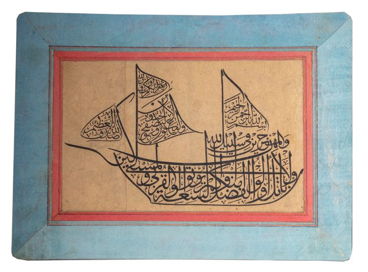 Arabic manuscript on paper, depicting verse 22 from Surah An-Noor in the form of the ship of the Prophet Nuh. Dimensions: 32 by 23.5 cm.