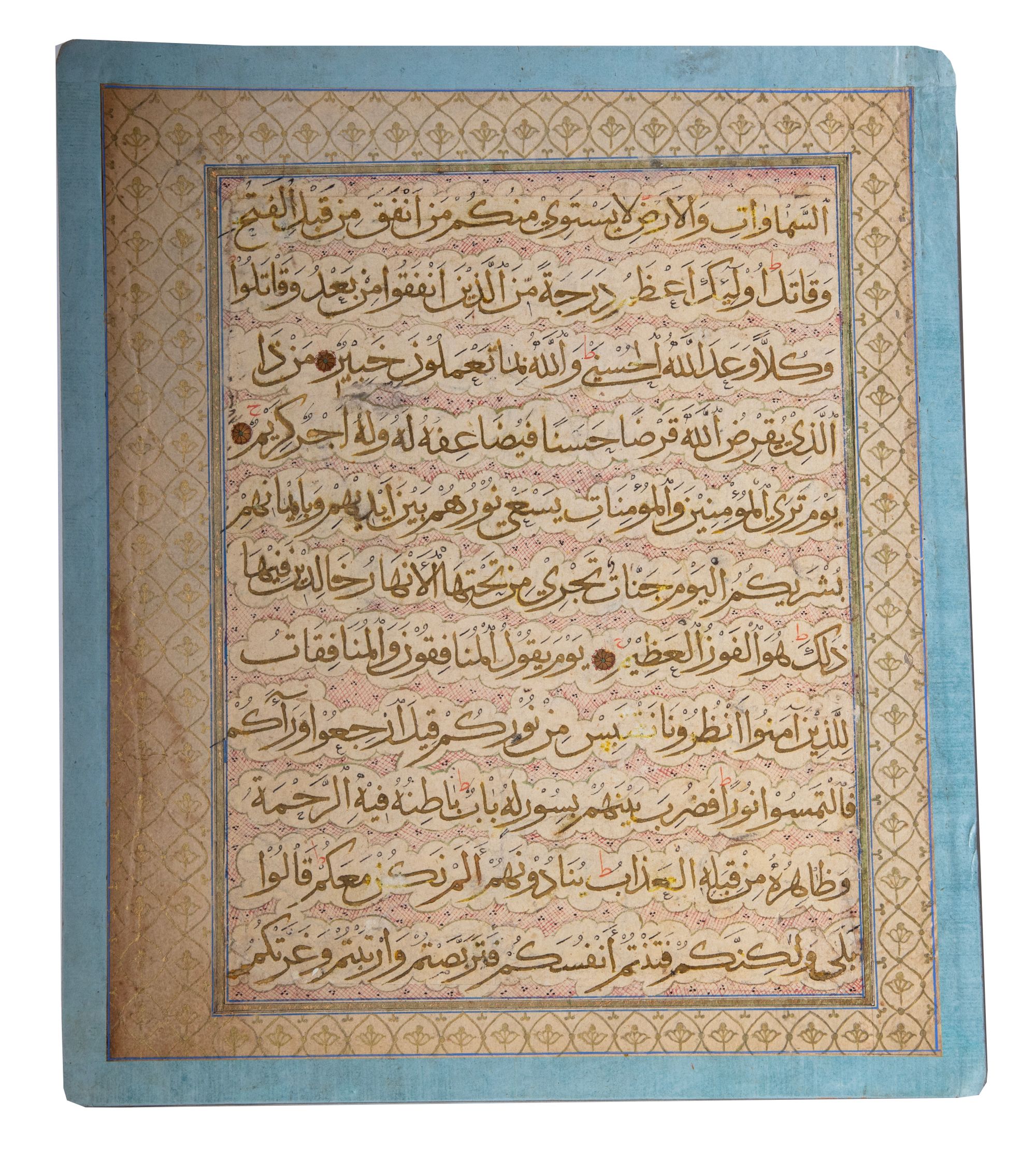 Arabic manuscript on paper, 11 lines in Muḥaqqaq script, with gold rosette verse markers, reserved within clouds, ruled with polychrome borders, and mounted on card.