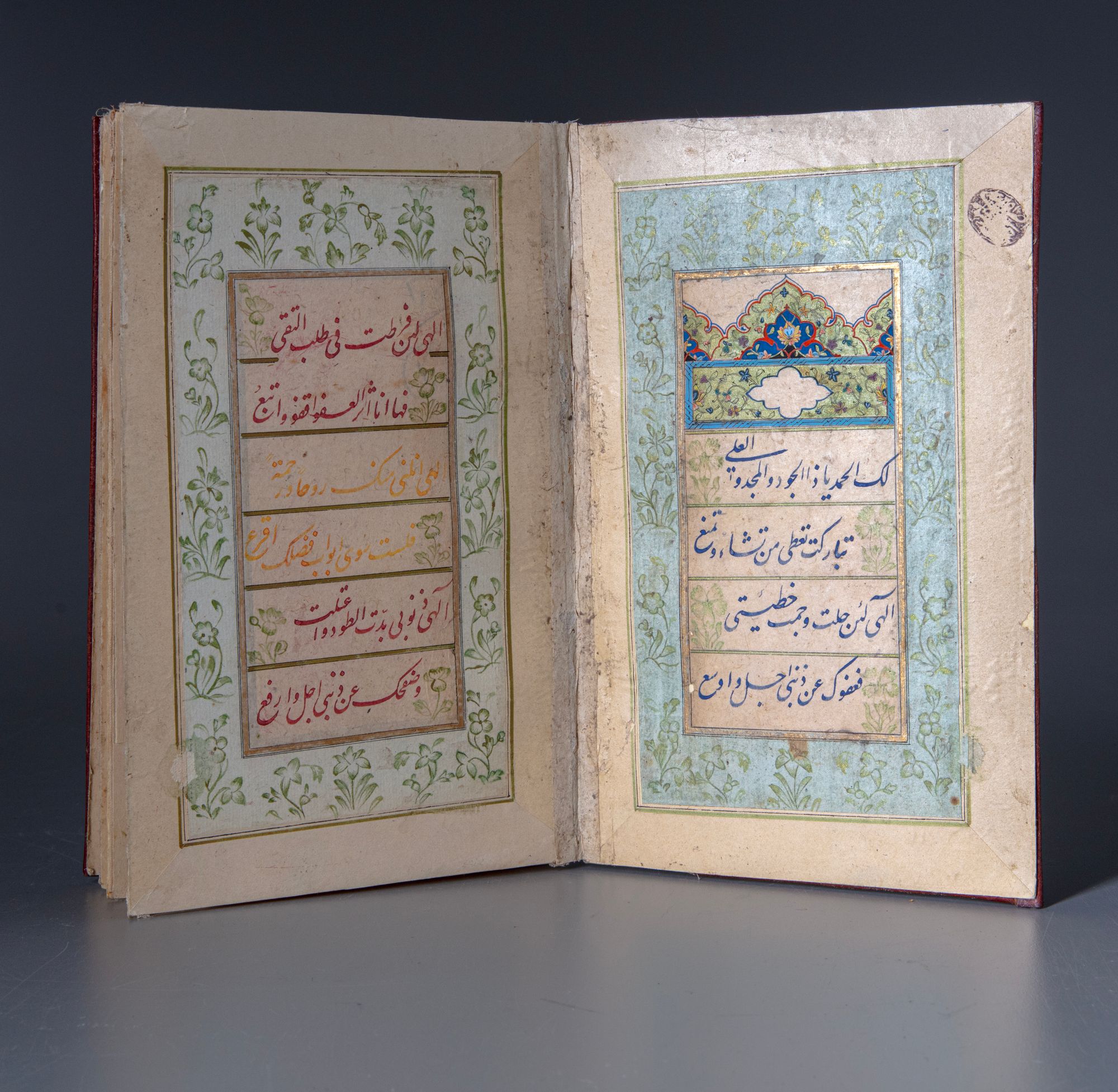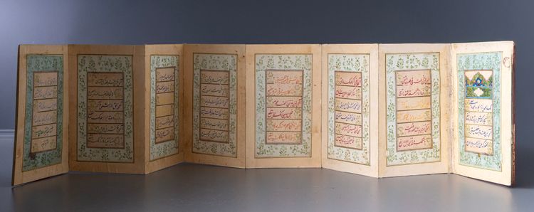 Arabic manuscript on paper, eight pages mounted on cards, depicting poems of Imam ʿAlī praising Allah. Each page contains six lines written in polychrome Nastaʿlīq script, ruled with polychrome borders, with margins embellished with polychrome floral decoration.
