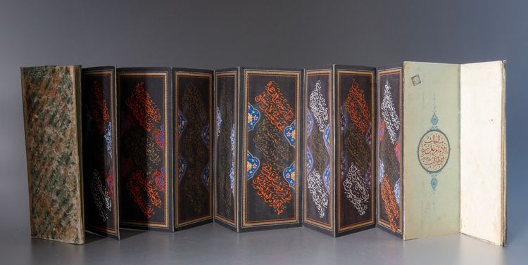 Arabic manuscript on paper, 10 pages mounted on cards, depicting prayers of Imam ʿAlī. Each page contains six lines written diagonally in polychrome Thuluth script, ruled in gold with polychrome borders, and embellished with polychrome floral decoration and ownership seals.