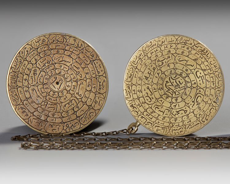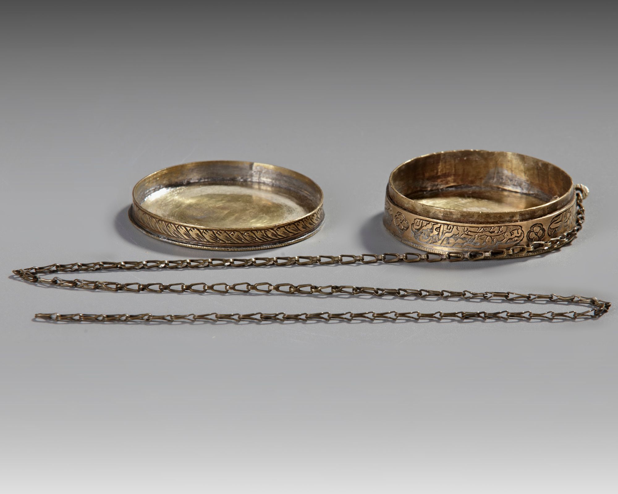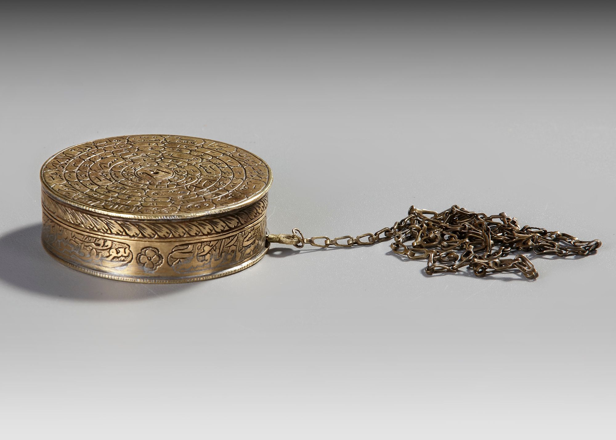 A finely worked Persian brass box of circular form, richly engraved with concentric bands with inscriptions and decorative motifs. The sides are ornamented with calligraphic panels and floral elements, and the box retains its original hinged lid and suspension chain. 5 by 2 cm.