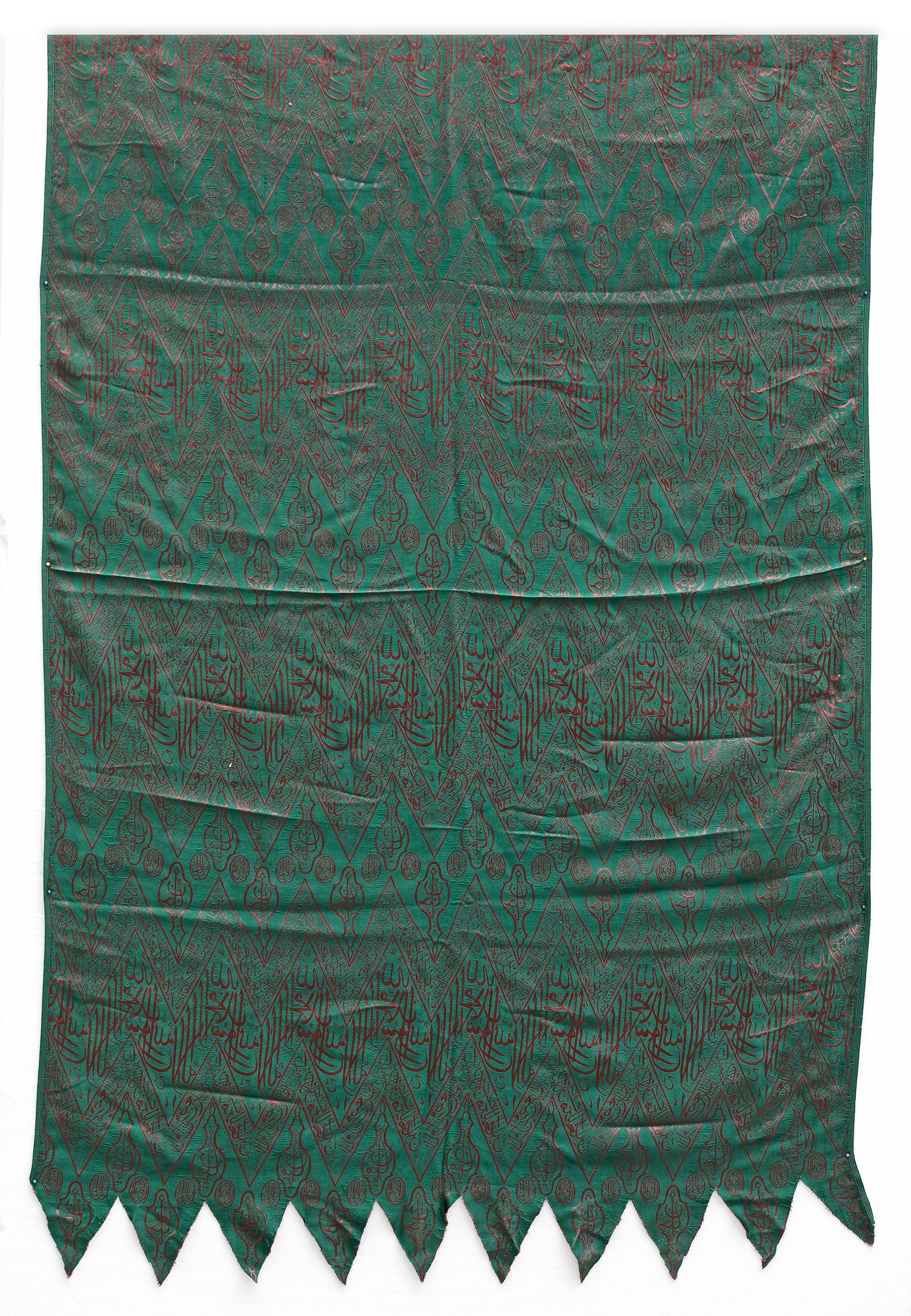 A fragment of the inner curtain of sacred kiswa for the inner wall of the Kabaa with an inscribed weave in green-color over a dark red ground. The crests of the chevrons are embellished with lamp motifs with circular medallions in between. Embellished with two groups of three undulating bands which assume the form of a continuous chain made up of number ‘7’s. The bands run from the beginning to the end of the cloth. The central band with prominent Inscription of ‘Kalimaat al-Tawhid, There is no God but Allah and Muhammad is his Prophet’, repeating in the middle of the kiswa between the two zigzag bands. The two expressions, ‘Ya Mannan’ (O, the All-Bounteous) inside the upright lantern, and ‘Ya Hannan’ (O, the Most-Compassionate) inside the reversed lantern are also repeated with ‘Praise be to Allah’ (O, The All-sovereign) inside the circles. On the upper undulating band, there is a verse from the Quran 2 surah Al-Baqarah verse-144. The lower undulating band encloses another inscription of v.96 from surah Al-Imraan. 155 by 90 cm.