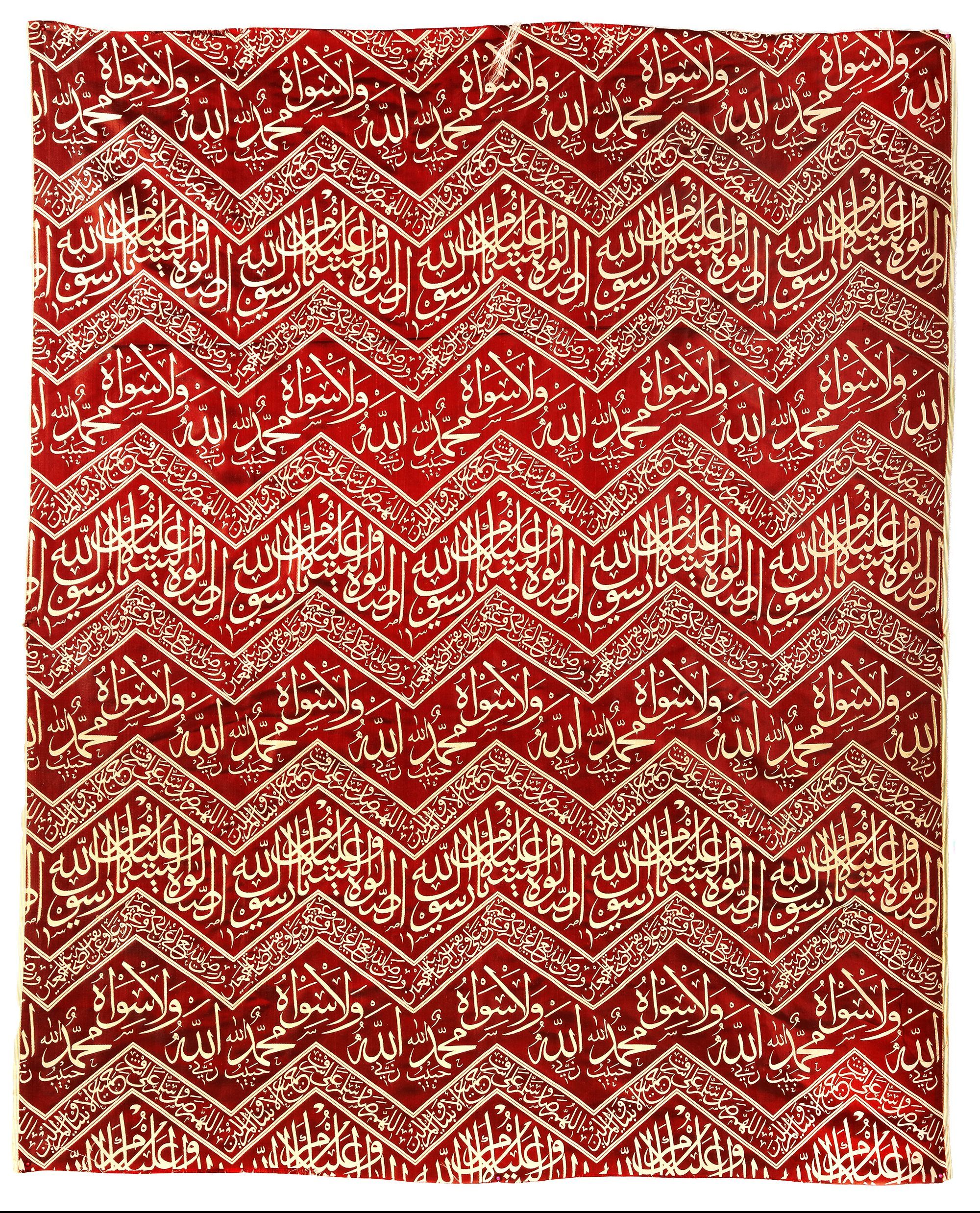 A fragment of silk hanging panel of the inner kiswa, with an inscribed weave in cream color over a red silk ground.