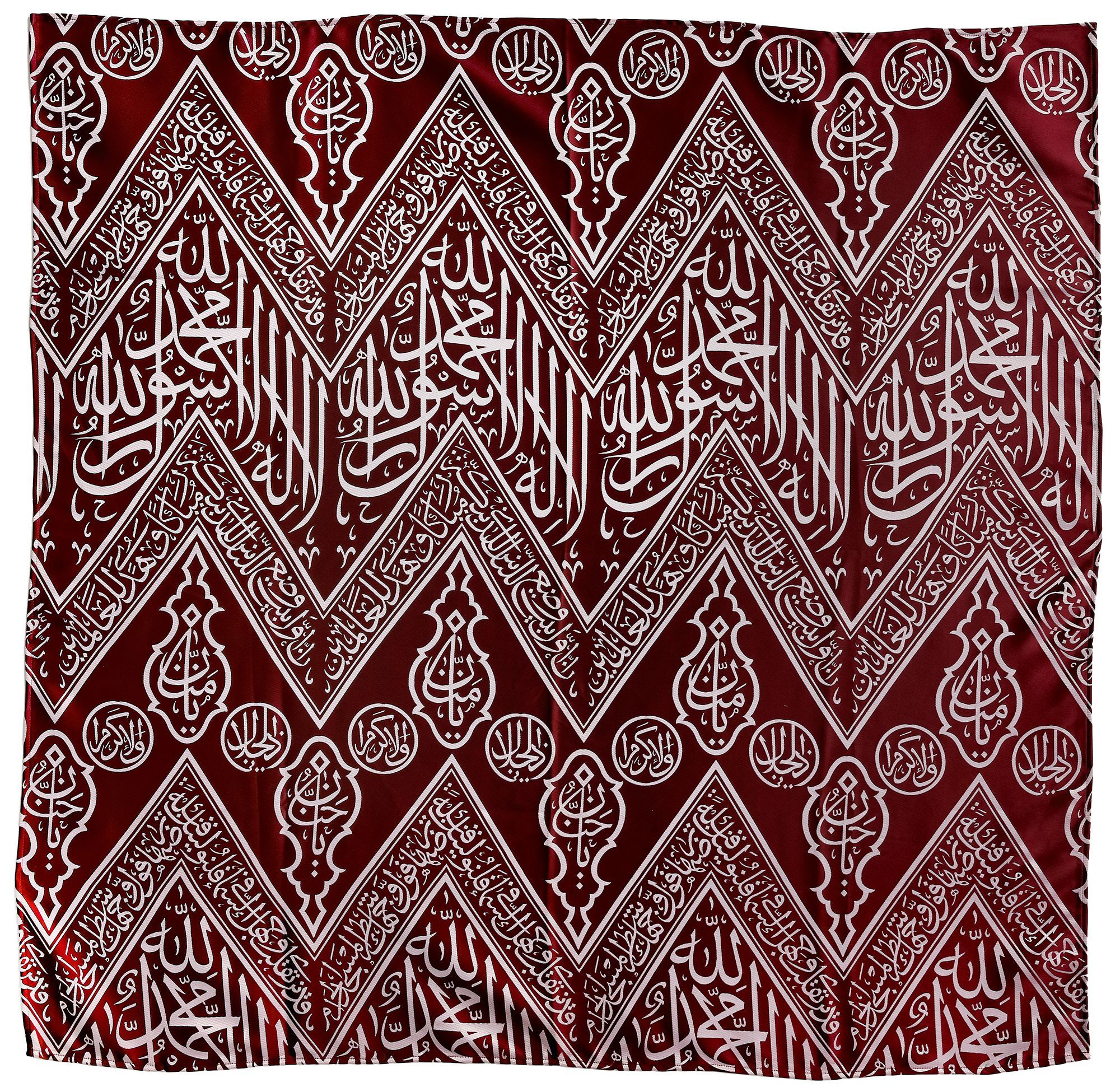 A fragment of the inner curtain of sacred kiswa for the inner wall of the Kabaa with an inscribed weave in cream-colored silk over a dark red ground. The crests of the chevrons are embellished with lamp motifs with circular medallions in between. Embellished with two groups of three undulating bands which assume the form of a continuous chain made up of number ‘7’s. The bands run from the beginning to the end of the cloth. The central band with prominent Inscription of ‘Kalimaat al-Tawhid, There is no God but Allah and Muhammad is his Prophet’, repeating in the middle of the kiswa between the two zigzag bands. The two expressions, ‘Ya Mannan’ (O, the All-Bounteous) inside the upright lantern, and ‘Ya Hannan’ (O, the Most-Compassionate) inside the reversed lantern are also repeated with ‘Praise be to Allah’ (O, The All-sovereign) inside the circles. On the upper undulating band, there is a verse from the Quran 2 surah Al-Baqarah verse-144. The lower undulating band encloses another inscription of v.96 from surah Al-Imraan.