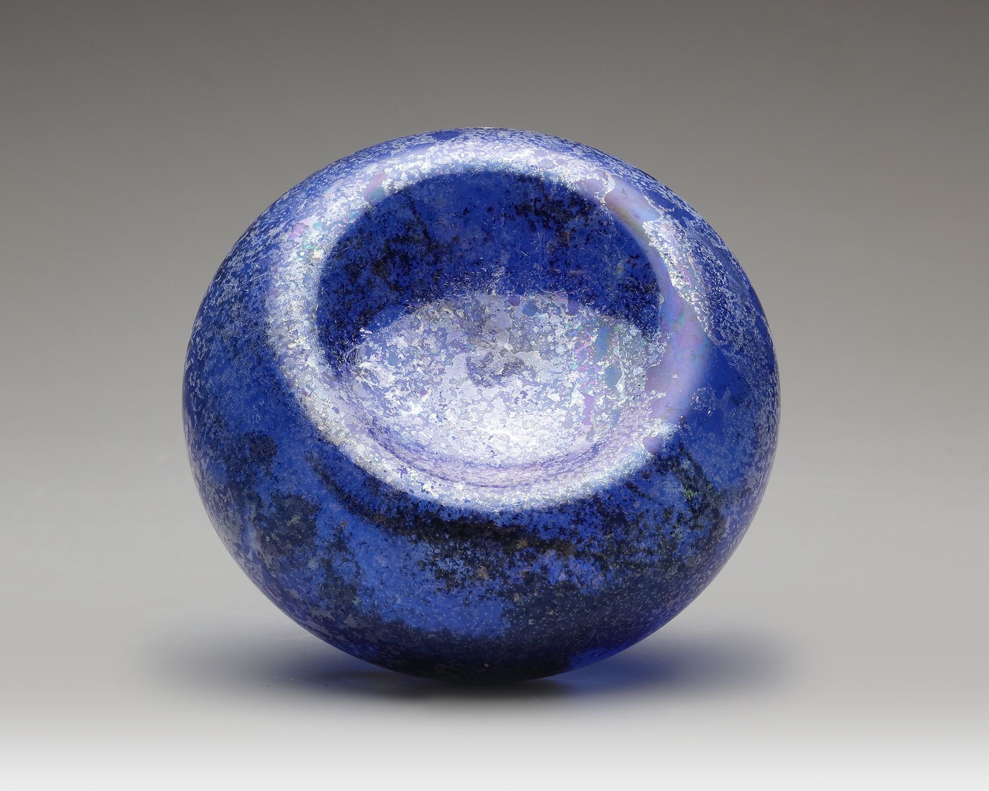 Deep blue glass bottle with a flattened globular body and short, slightly flaring neck. The surface displays extensive weathering and iridescent encrustation, enhancing the rich cobalt tone of the glass.