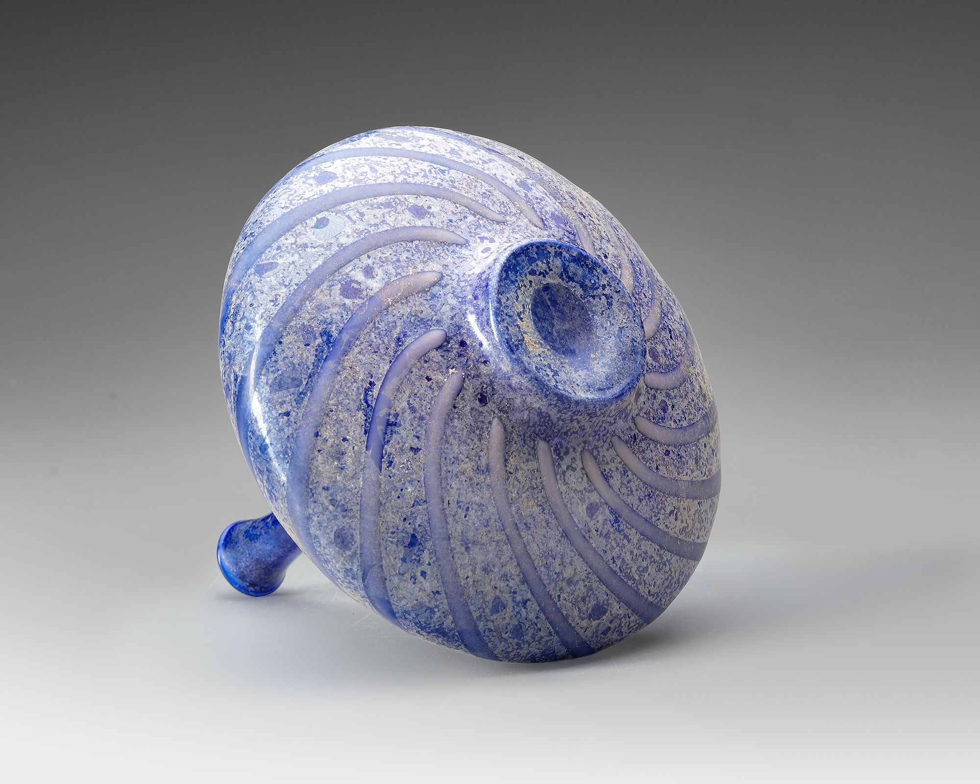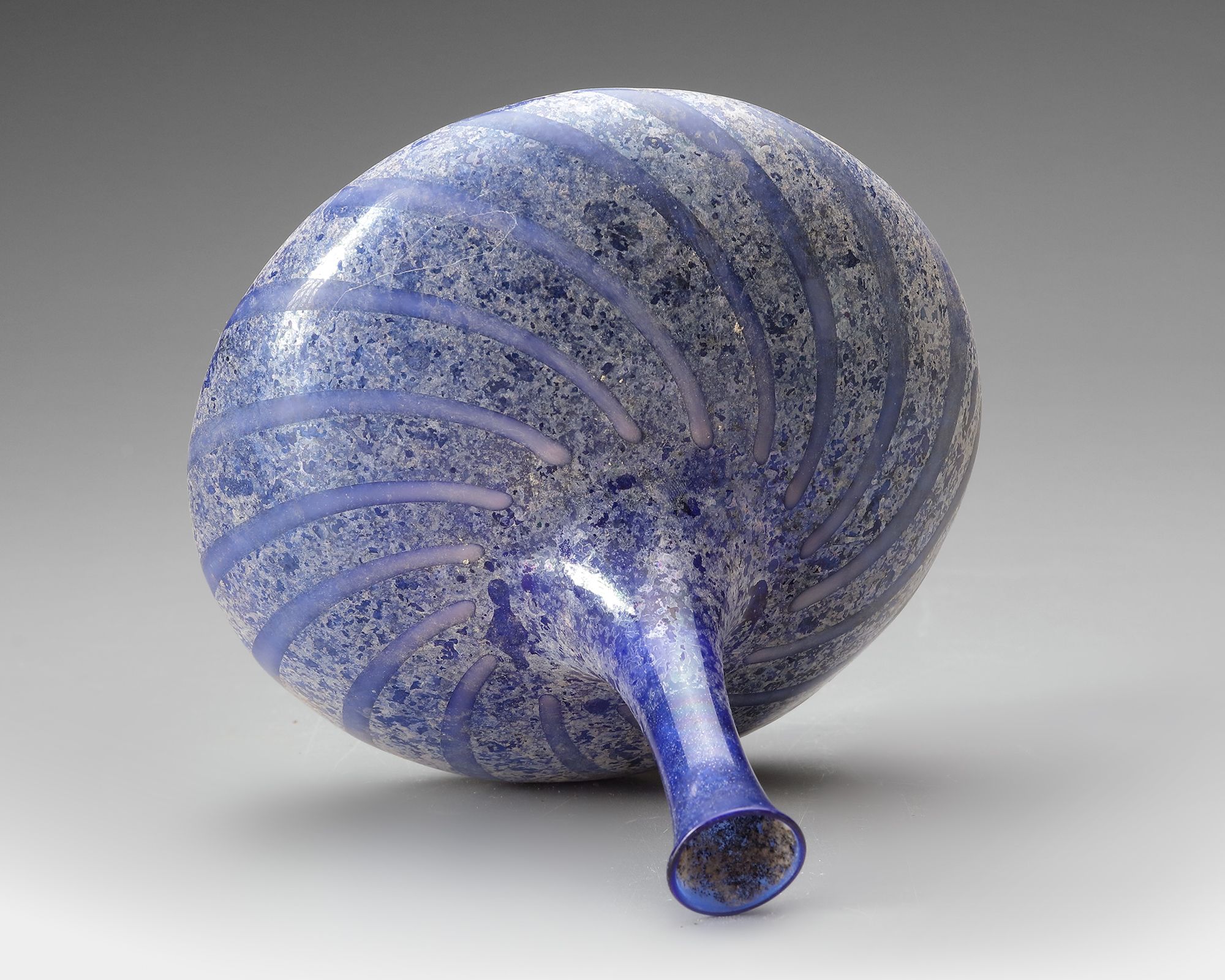 Free-blown blue glass bottle with a globular body and a tall, narrow neck. The surface is decorated with applied spiral trails in darker blue, creating a rhythmic swirling pattern around the vessel. The form suggests use as a container for precious liquids such as perfumes or oils, typical of the Seljuk-period Islamic world H. 17 cm.