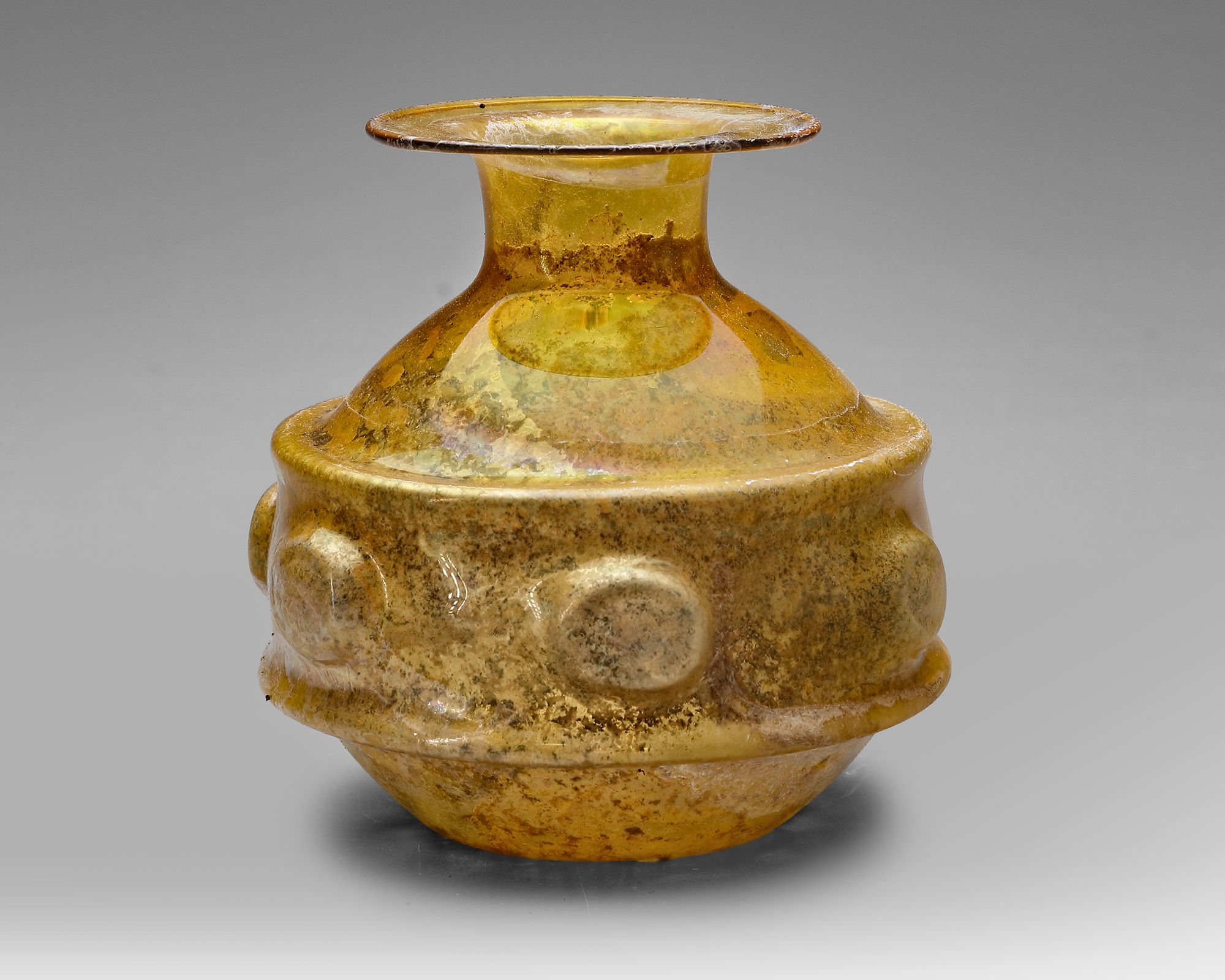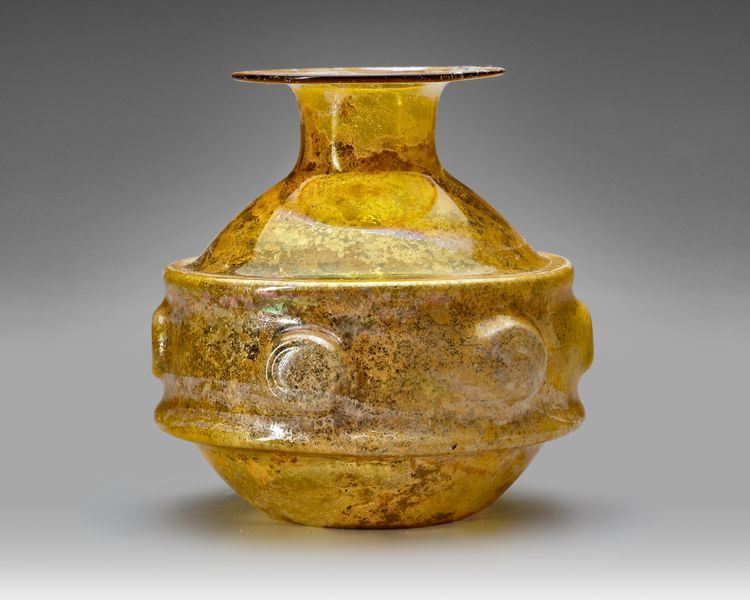 Free-blown amber glass vessel with a compressed globular body and short, flaring neck. The body is encircled by a raised applied band with rounded bosses, providing both decoration and grip.