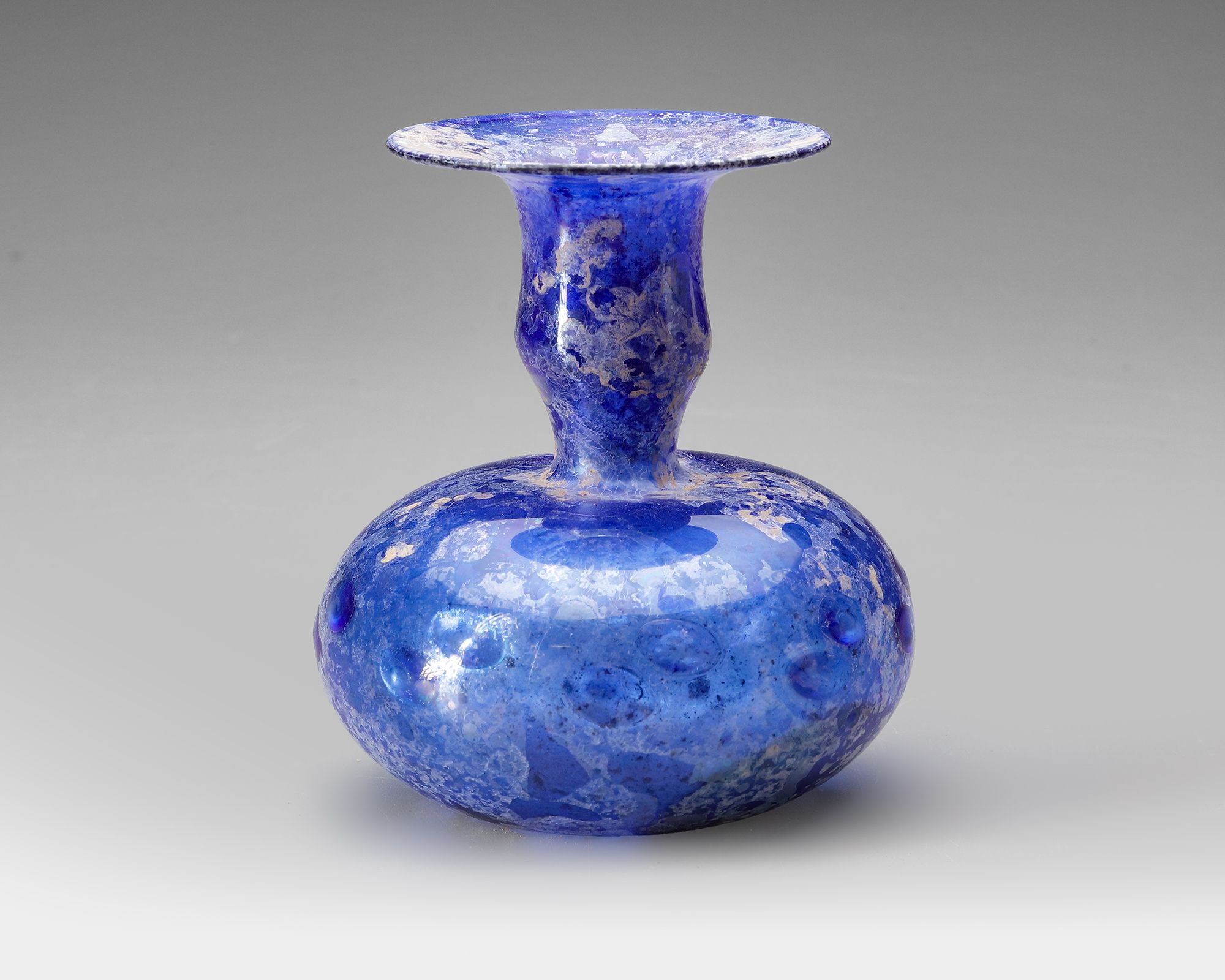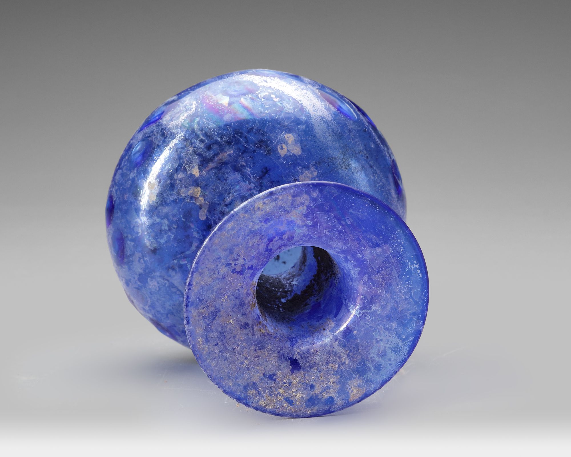 Free-blown cobalt-blue glass bottle with a flattened globular body and a wide, flaring mouth set on a short neck. The vessel is decorated with applied rounded bosses around the shoulder, a characteristic ornamental feature of medieval Islamic glass. enhancing the depth and luminosity of the blue glass.