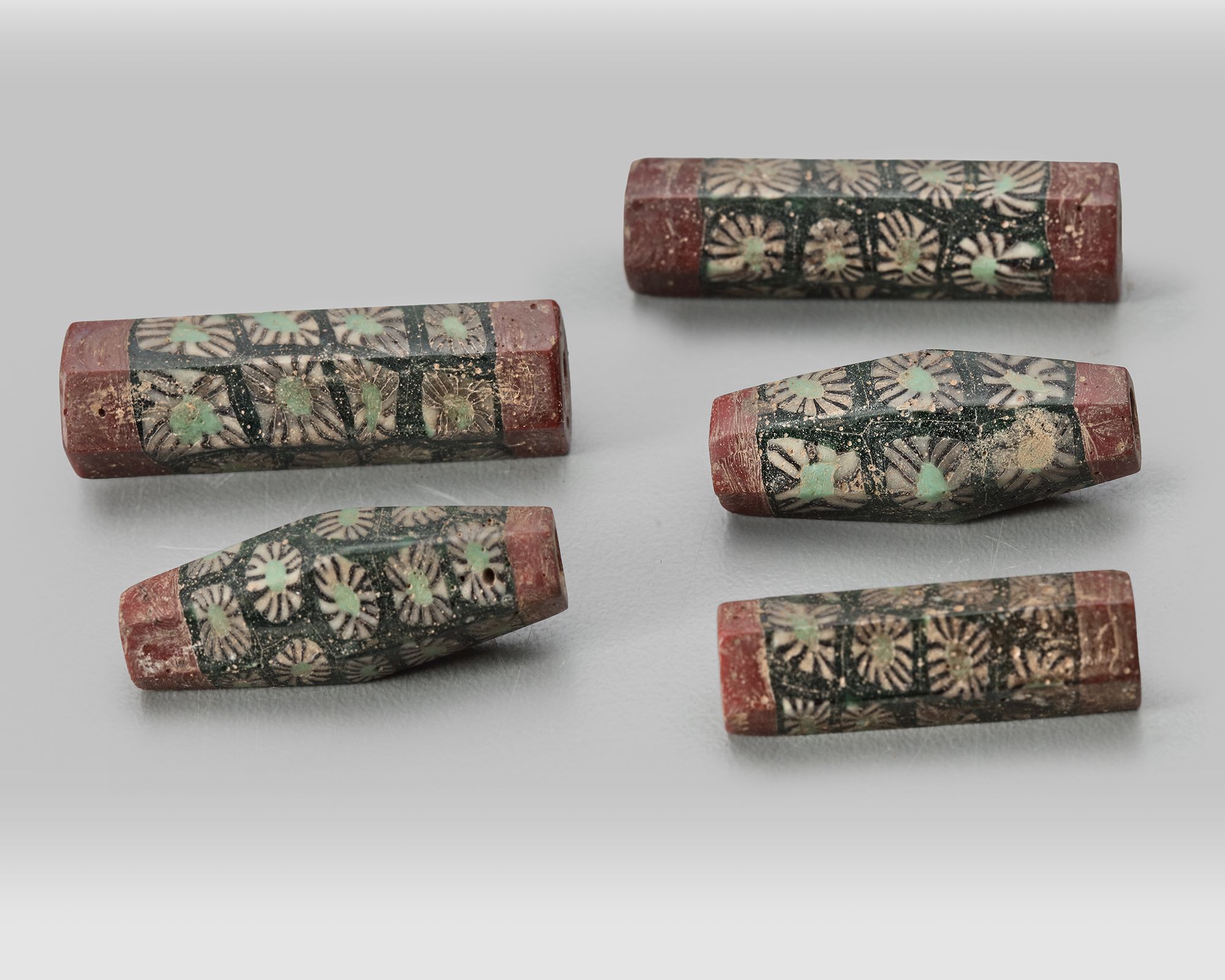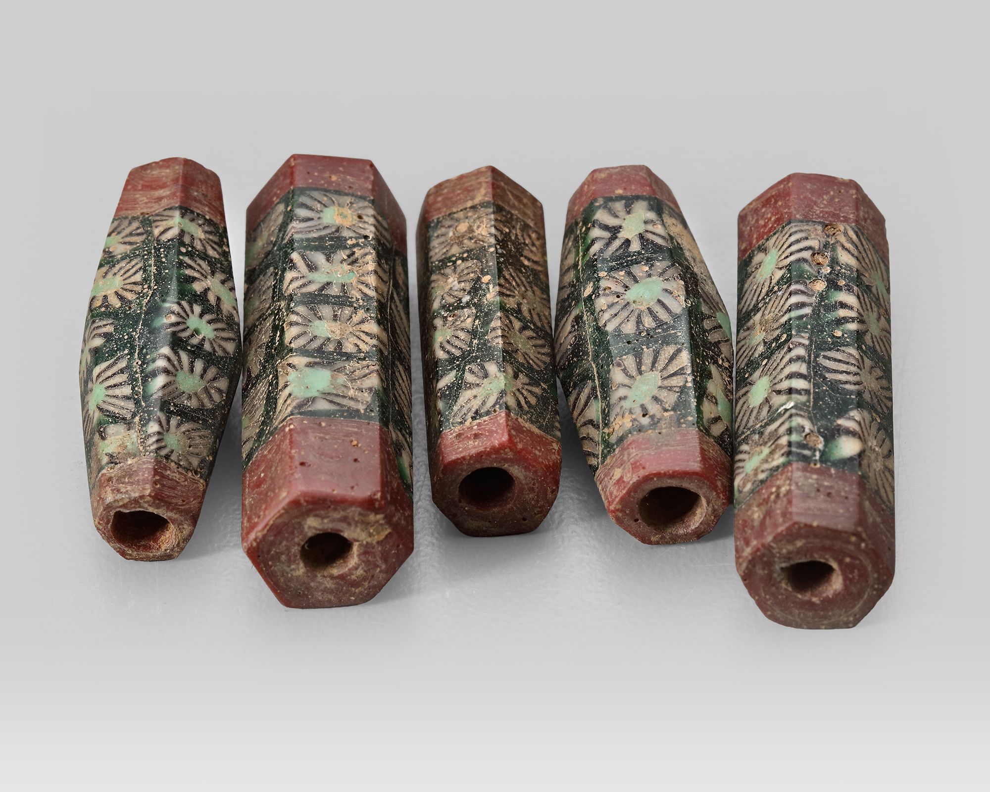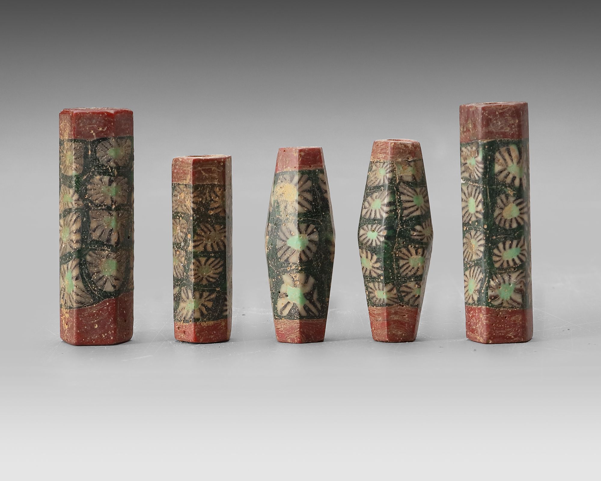 Group of five elongated mosaic glass beads, decorated with repeated floral and rosette motifs formed from polychrome glass canes. The beads display a characteristic combination of dark green, cream, red, and yellow tones, with surface wear consistent with age and use. Produced using advanced mosaic and cane-slicing techniques, used as elements of necklaces or other personal adornments, they illustrate the continuity and refinement of ancient glass working traditions. Length between 3.0 and 3.8 cm.