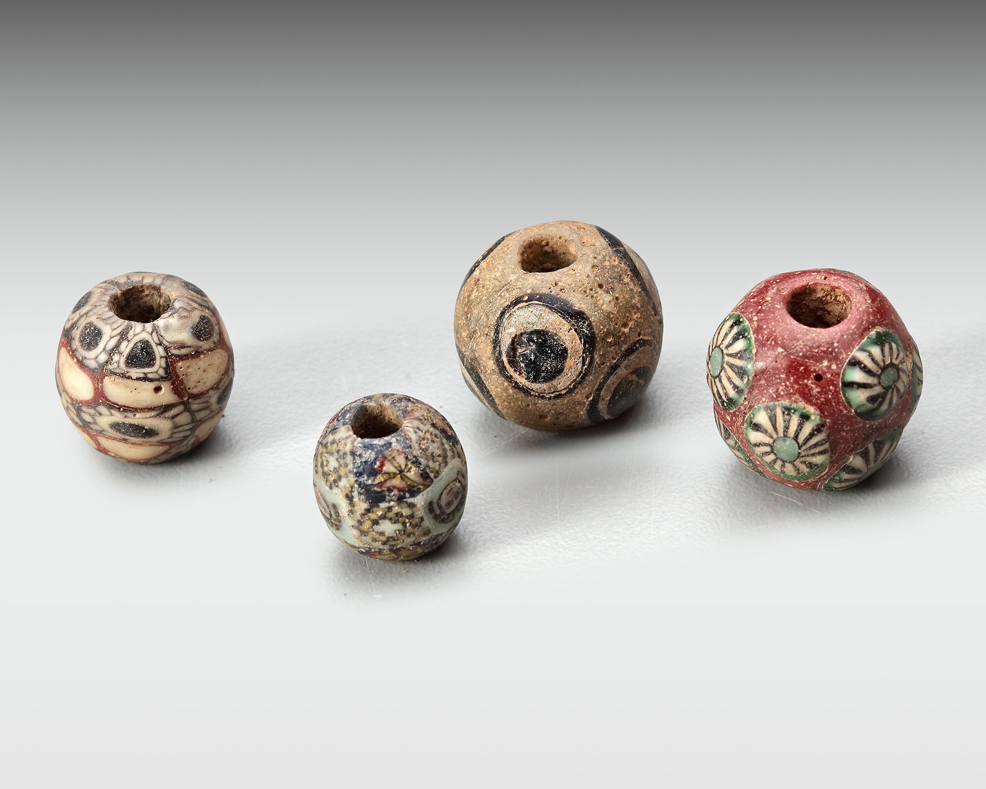 Group of four polychrome glass beads of varying sizes, decorated with complex mosaic and eye motifs in contrasting colors. Formed using advanced glassworking techniques, the beads display layered canes and applied ornamentation typical of Roman decorative traditions. Surface wear and minor pitting attest to age and use. Such beads were commonly worn as jewelry or amulets, reflecting both personal adornments 17 -10 mm. in diameter