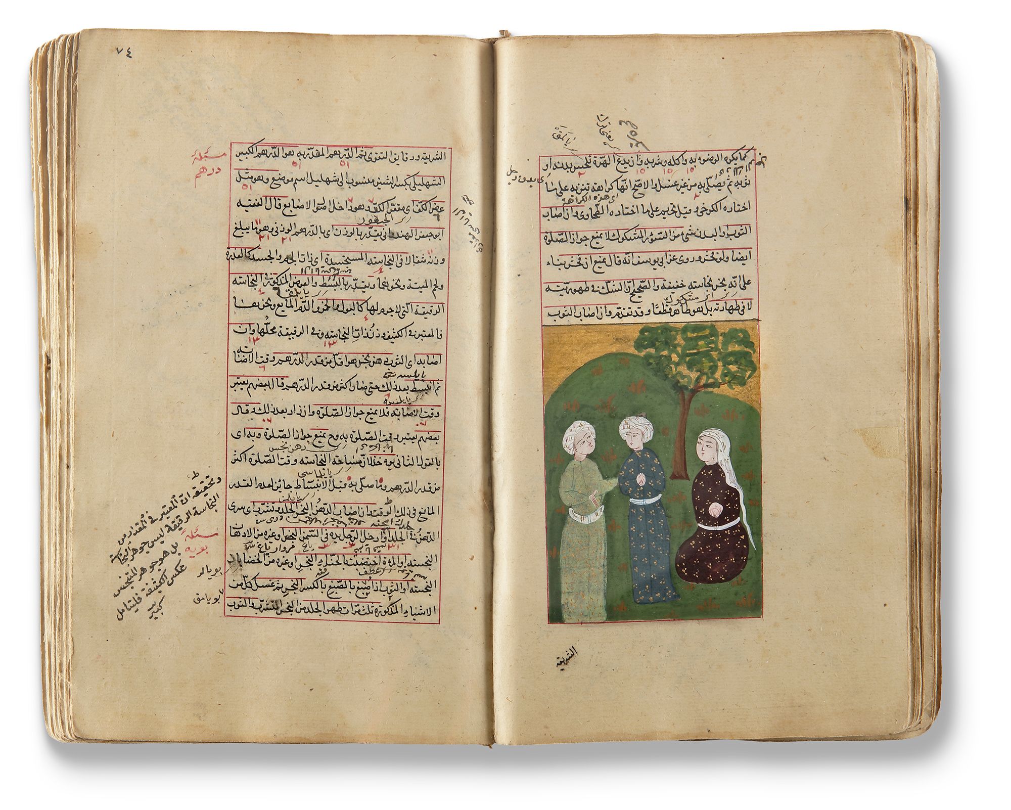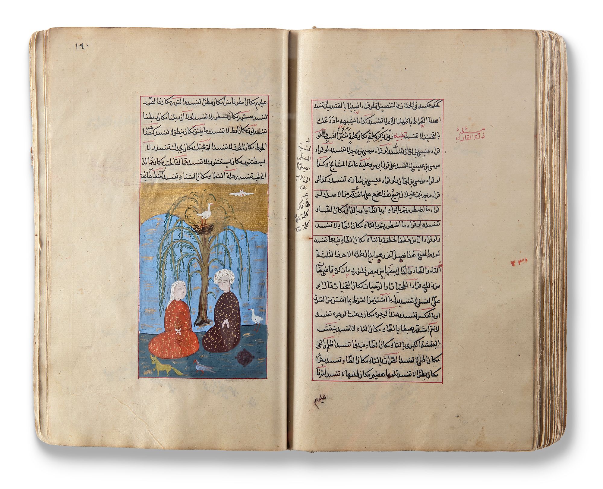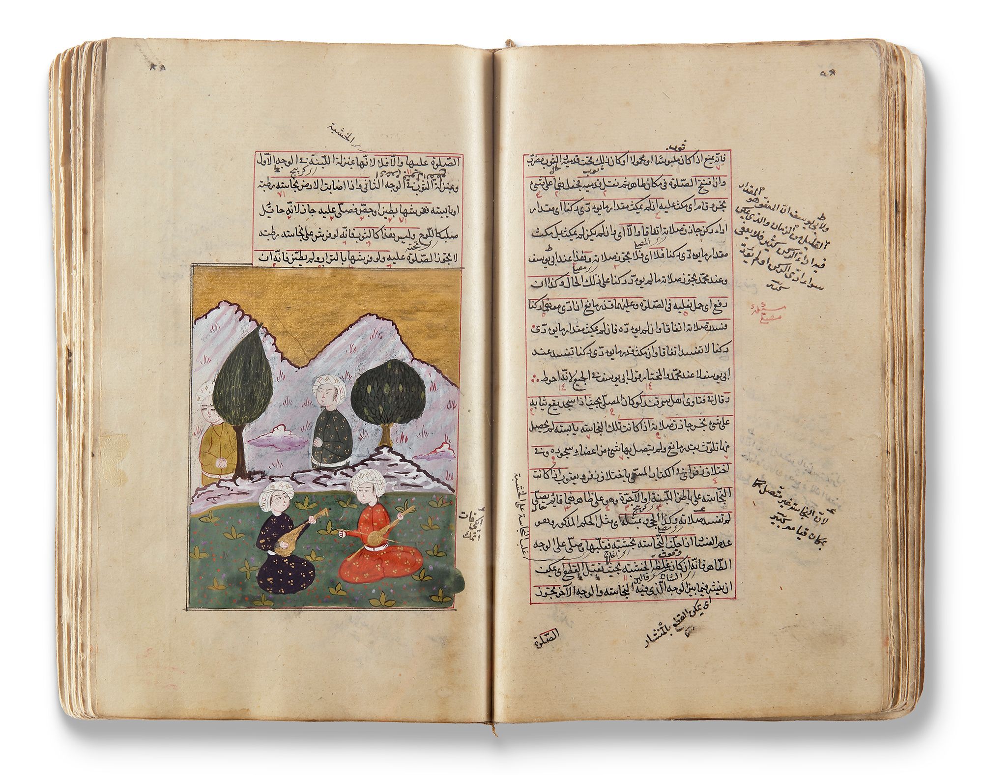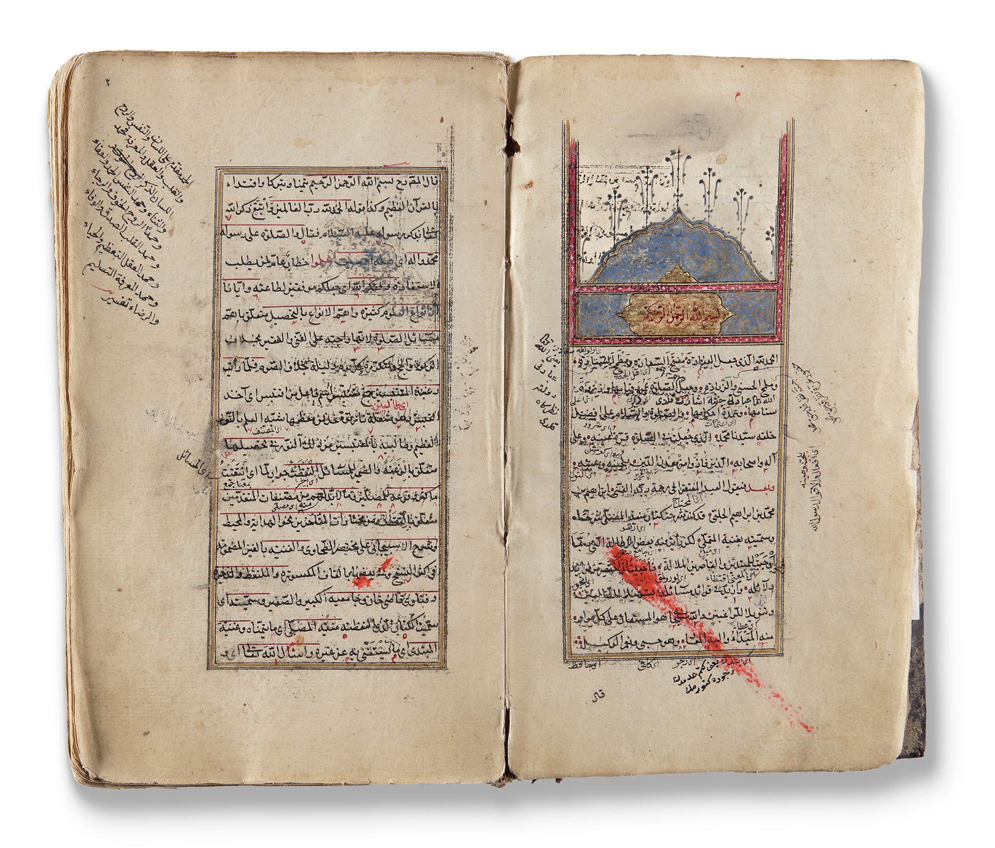An Arabic manuscript on paper, each page comprising 19 lines in neat black naskh script, with text framed by ruled red borders. Titles and catchwords are inscribed in red ink, while occasional marginal notes and commentaries appear throughout. Select passages are underlined in red. The opening page is adorned with gold and blue illumination, and the manuscript contains three miniatures and four side paintings executed in opaque colors heightened with gold. ownership statement and seals of 1245 AH/1829 AD.