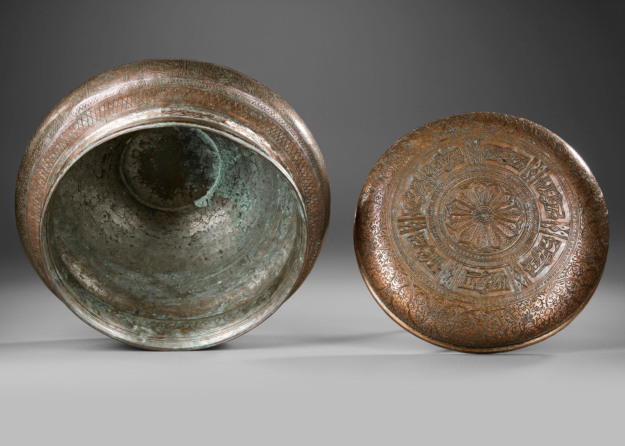 A finely crafted Qajar-period metal pot with a fitted cover, richly decorated with intricate engraved floral patterns and elegant bands of Persian calligraphy. The domed lid features a central rosette medallion surrounded by stylized vegetal motifs, Diameter 35 cm. 3.08 KG.