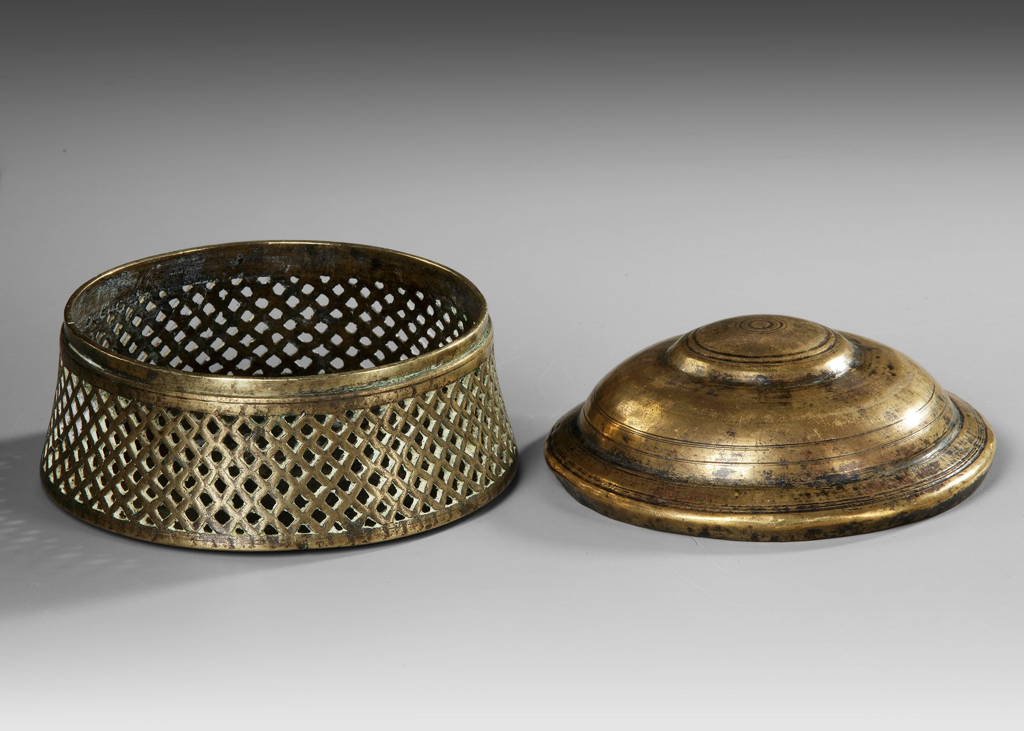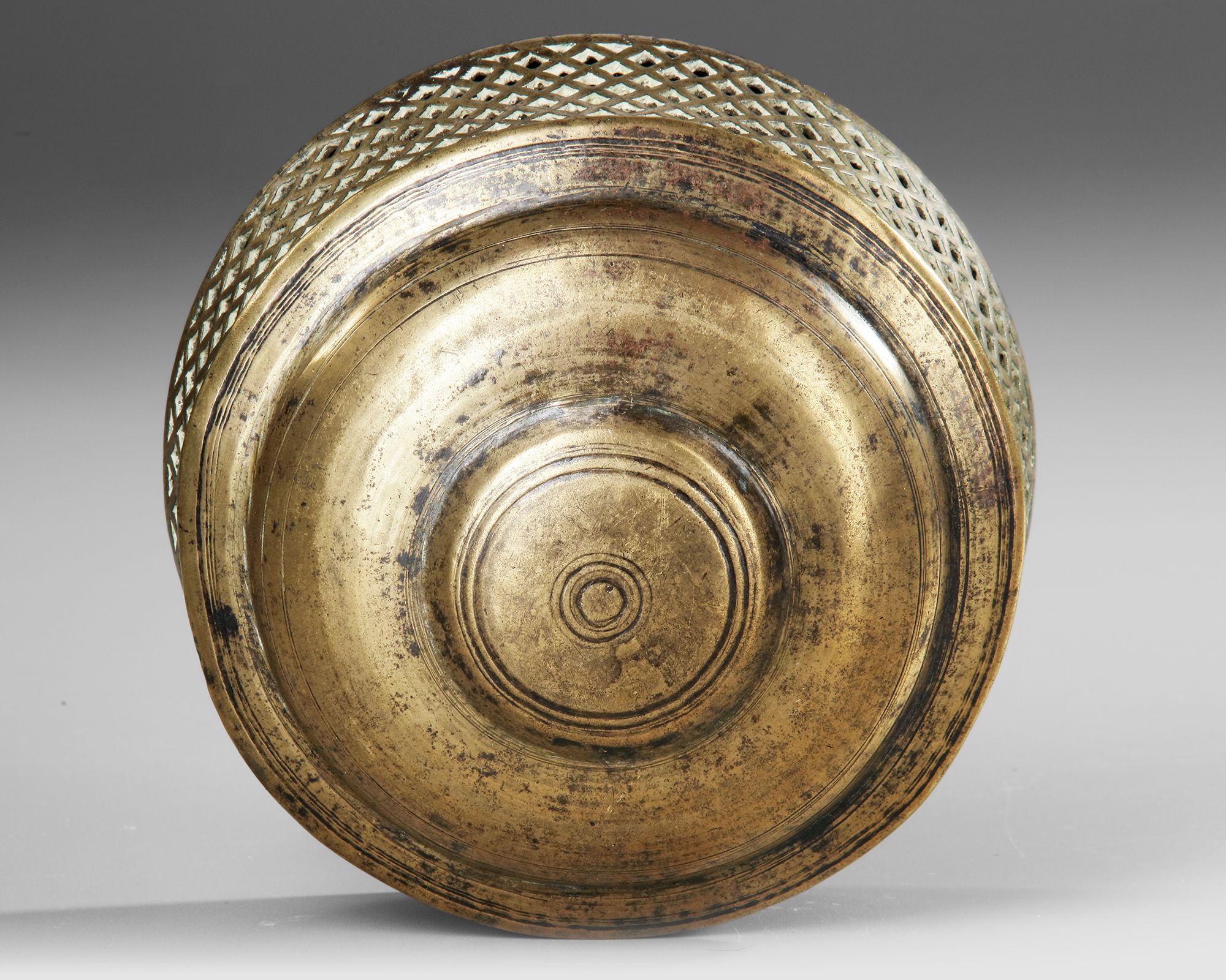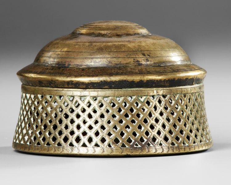 Brass incense burner of domed form, featuring a beautifully pierced lattice body designed to diffuse aromatic smoke. The stepped lid and circular base are accentuated with concentric ring decoration,