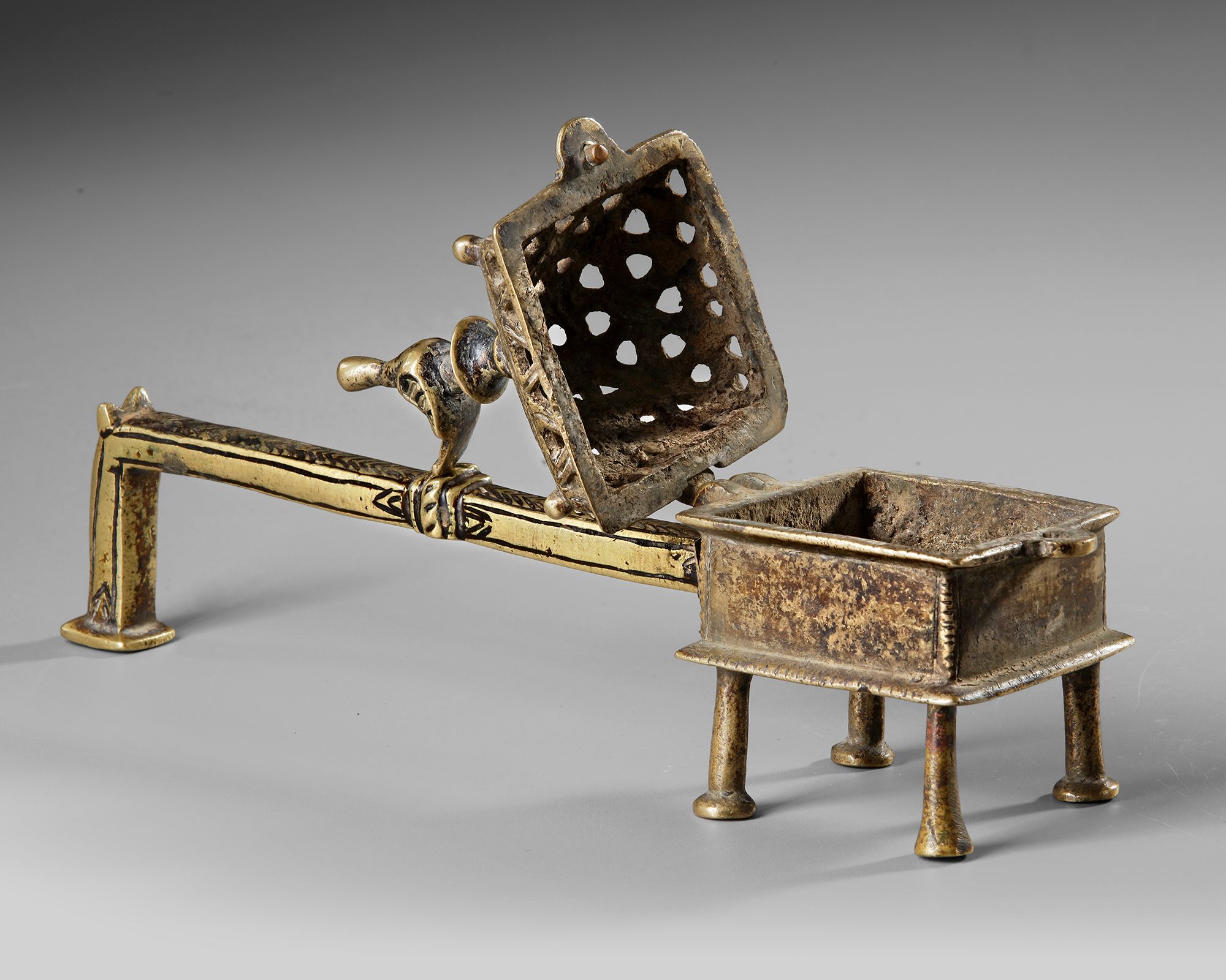 A finely cast 15th-century Yemeni incense burner in brass, raised on four slender legs and fitted with a long handle for safe handling. The rectangular body is surmounted by a pierced pyramidal lid decorated with geometric openwork, allowing fragrant smoke to escape during use. A small bird-shaped finial crowns the top, Length 26 cm 823 gr.