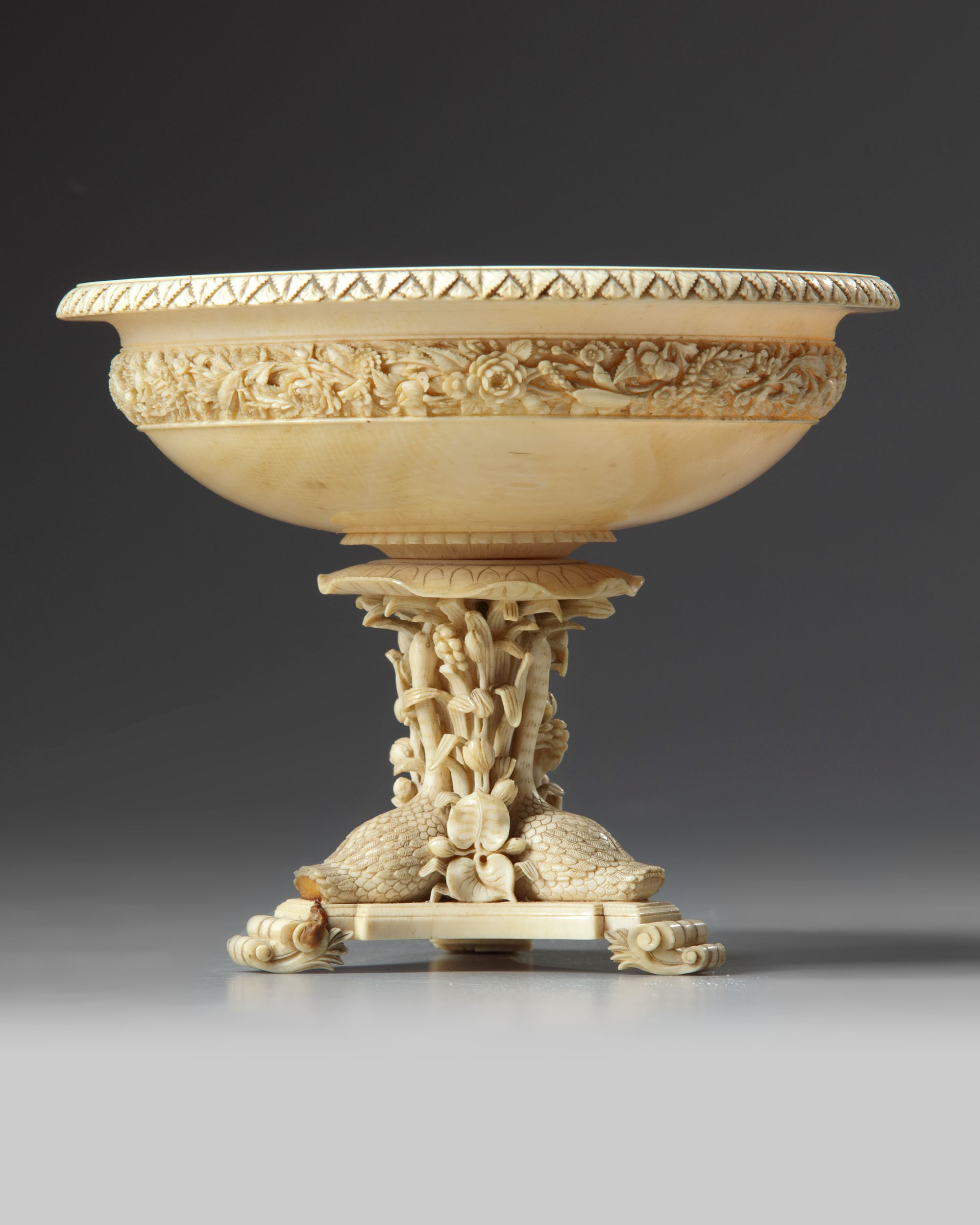 A stem-bowl consisting of carved geese amongst foliage and flowers forming the stem on a base, the bowl with shallow sides and a band of carved flower scrolls.