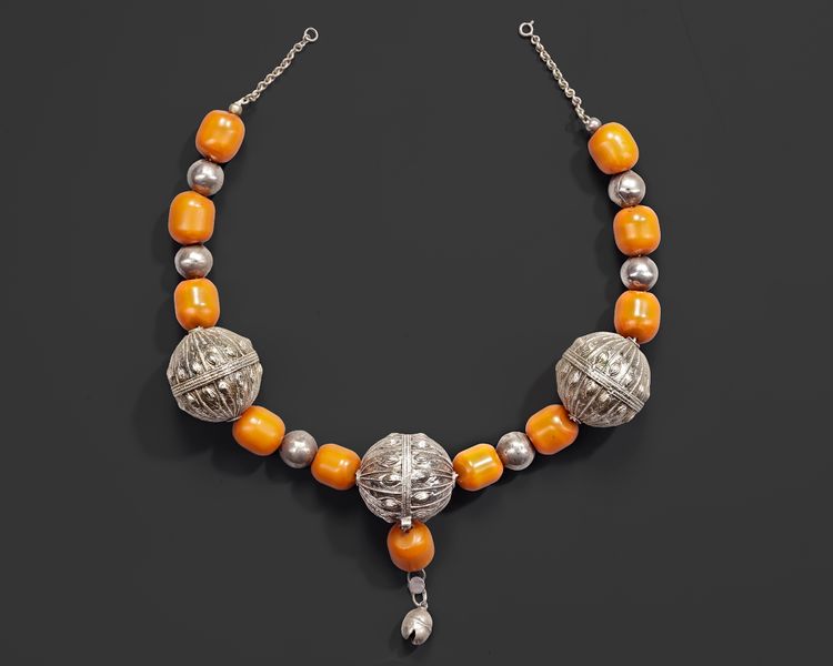 A 19th-century Yemeni necklace composed of large amber beads separated by silver beads and three prominent engraved silver globular elements. The central silver bead supports a small pendant drop
