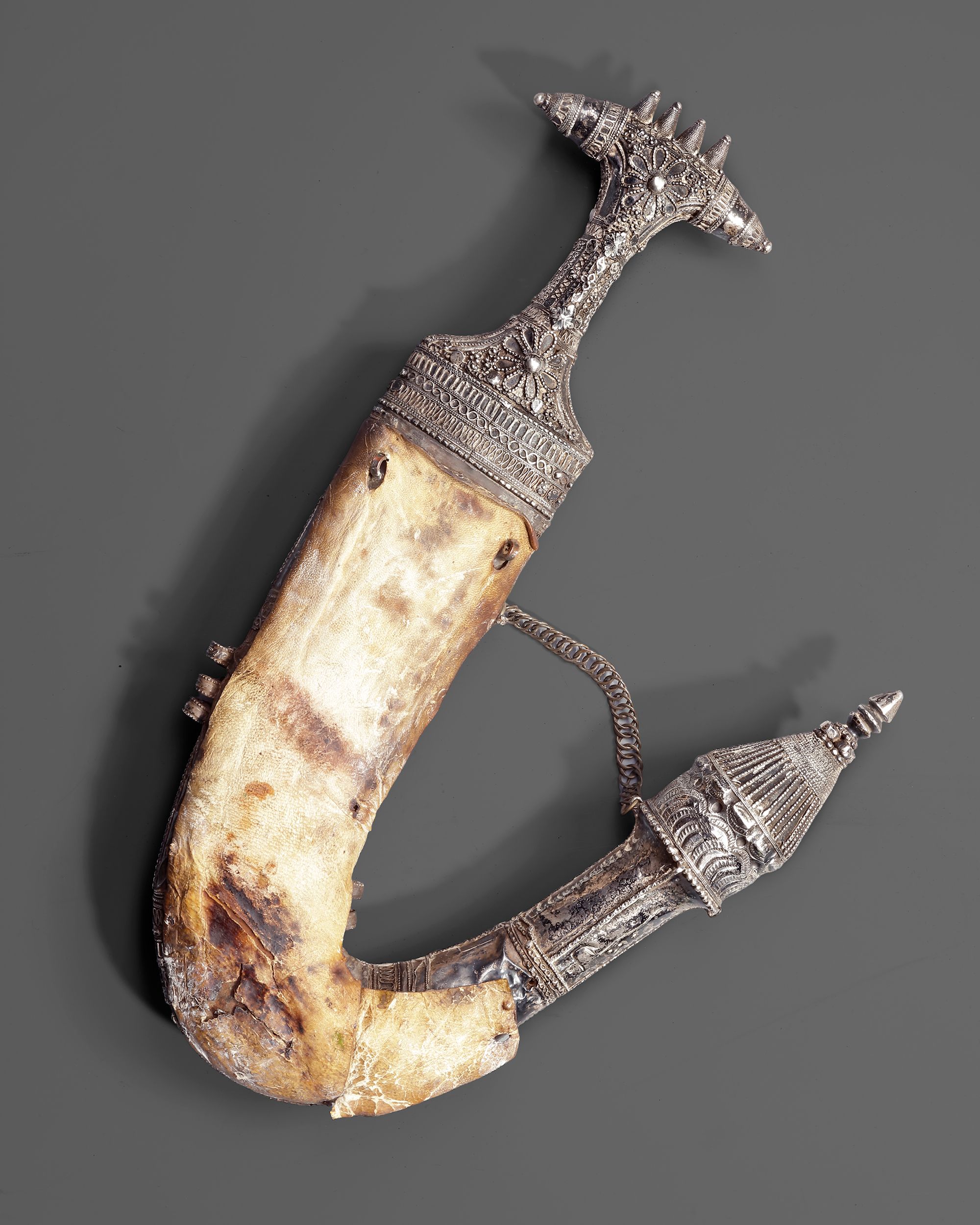 An ornate Yemeni janbiya featuring a strongly curved blade and an elaborately decorated silver scabbard. The surface is richly embellished with intricate geometric and floral motifs, complemented by decorative chains linking the scabbard elements. The hilt is finely worked with raised ornament and distinctive finials 33 cm. 689 gr.