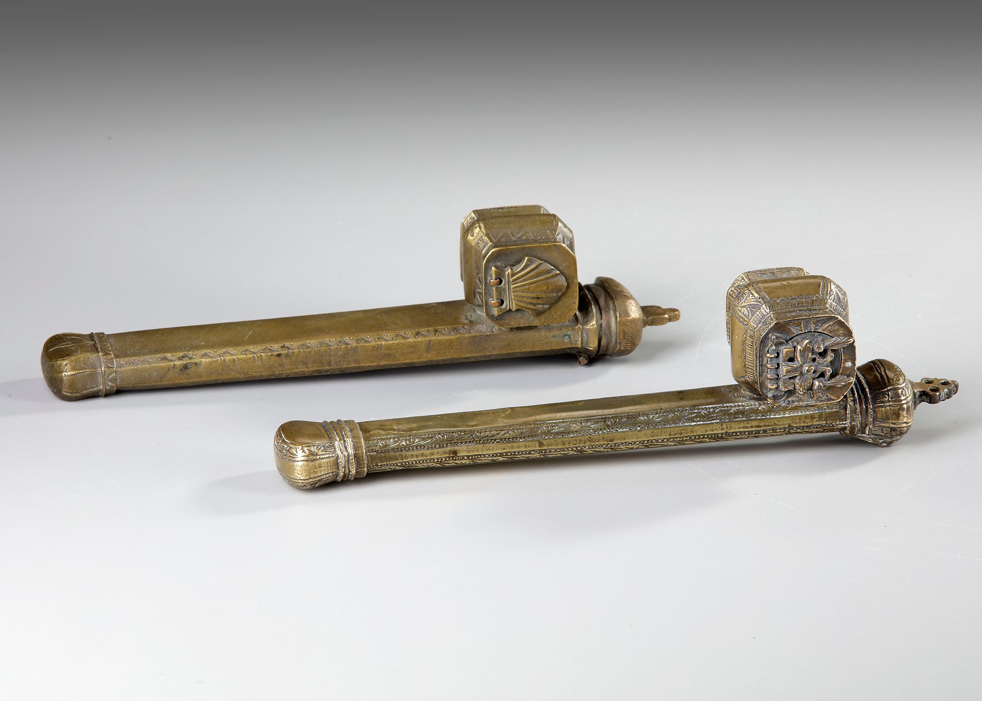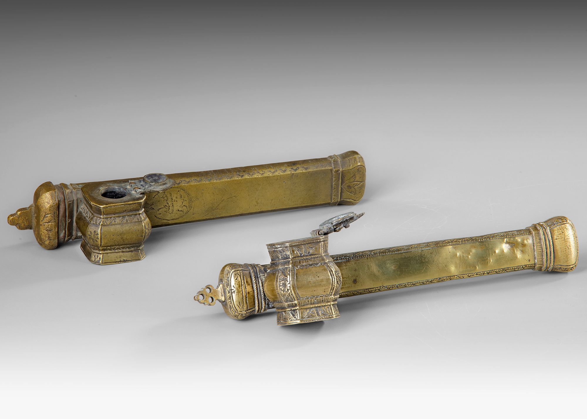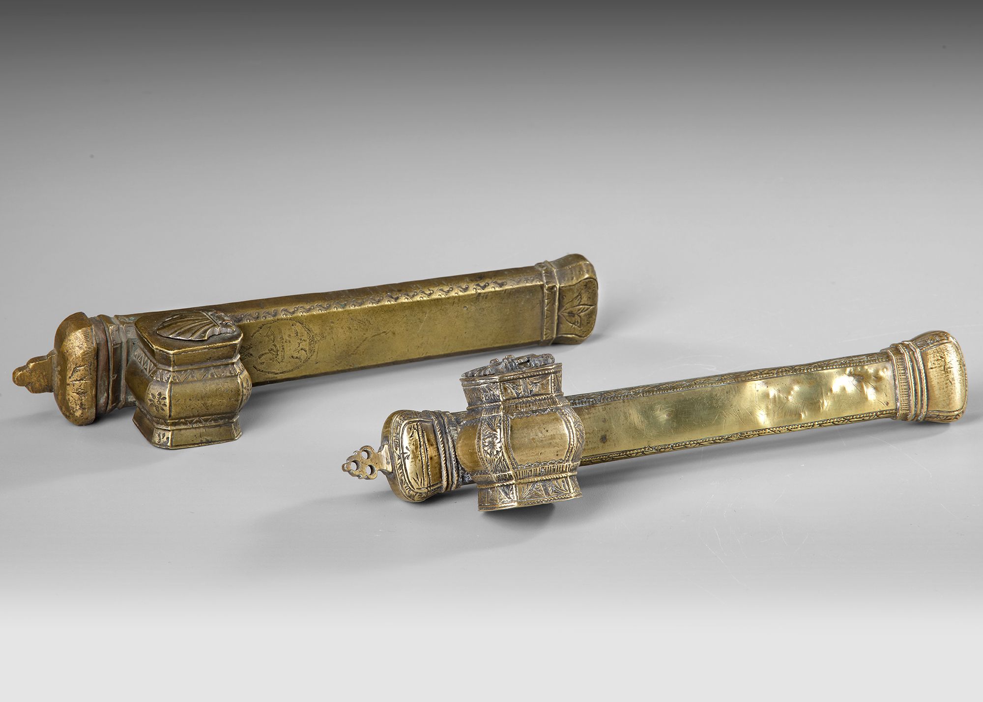 Two Ottoman divit qalamdans represents traditional writing equipment worn by scribes and officials in the Ottoman Empire. Each piece consists of a long tubular pen case (qalamdan) attached to a small hinged inkwell (divit) mounted near one end.