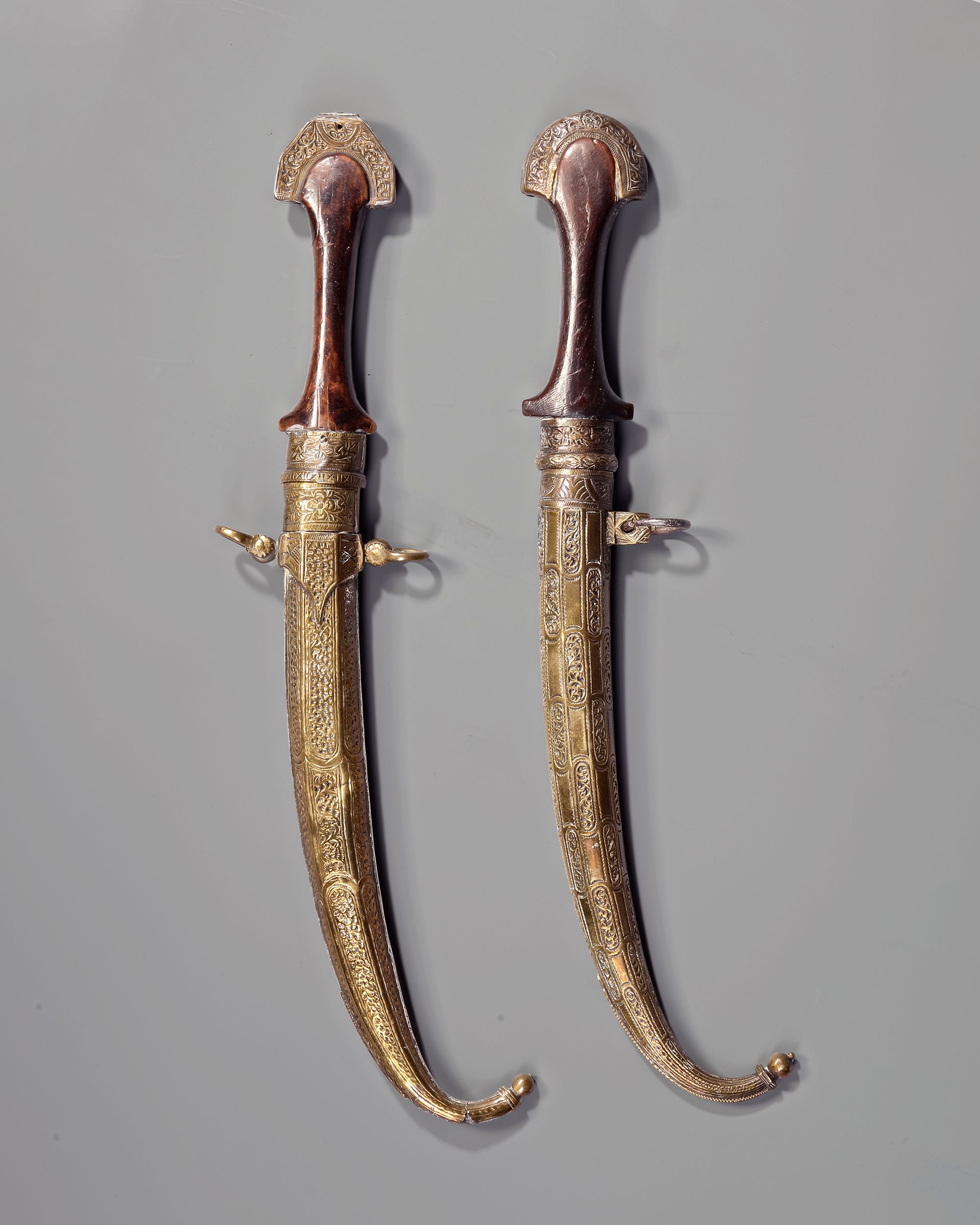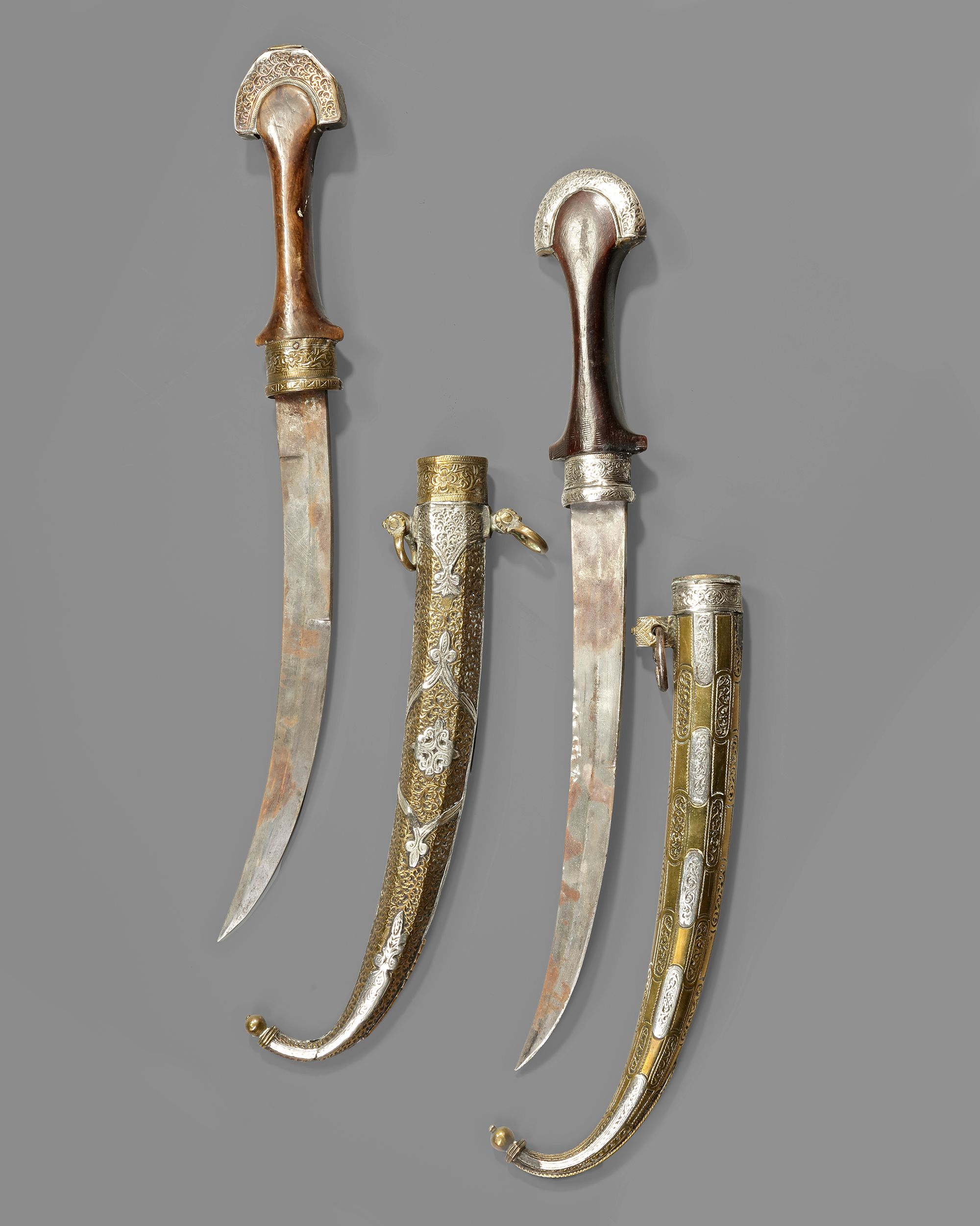 With a curved blade, wooden hilt, and scabbard richly decorated in silver and gilt designs. 1. L. 42,5 cm. 444 gr. 2. L. 40,5 cm. 408 gr.