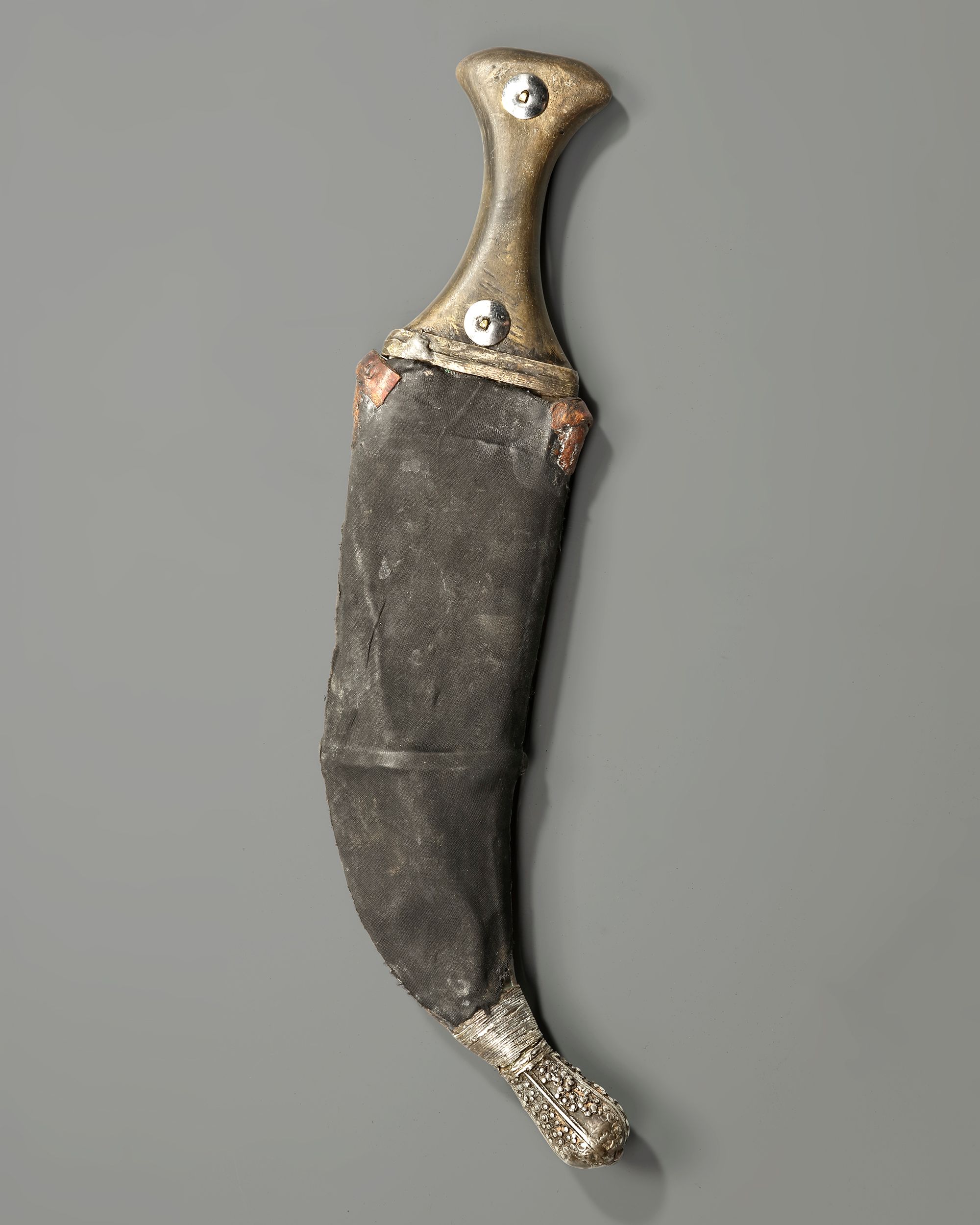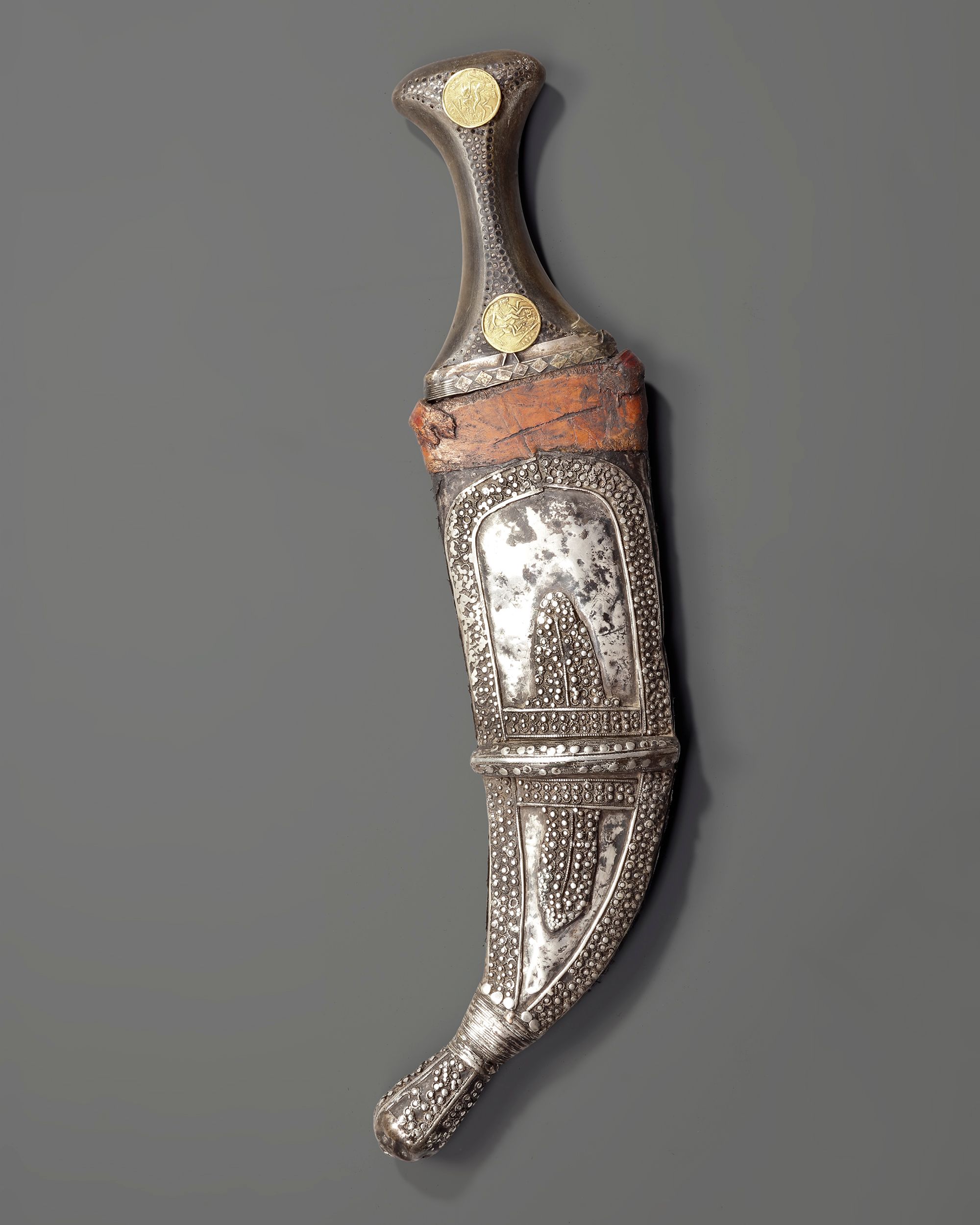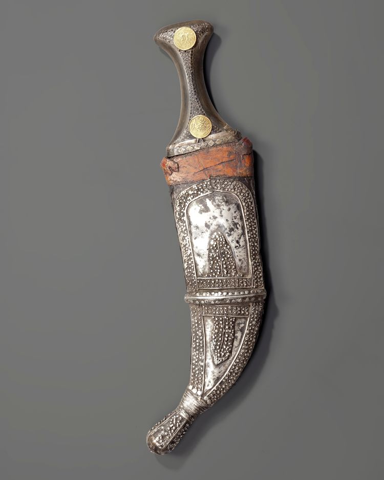 A finely crafted Yemeni dagger (jambiya) from the early 20th century, featuring a steel blade and a richly decorated silver hilt adorned with traditional granulation and rosette motifs.