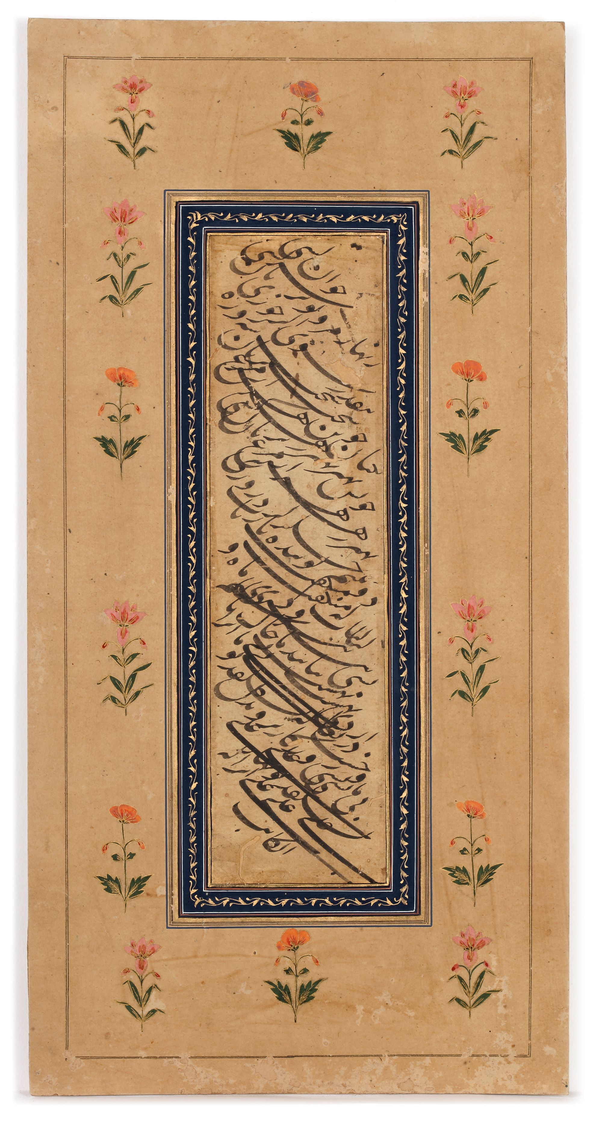 Persian manuscript page on paper, finely written in black ink in diagonal lines of nastaʿlīq script within a narrow panel, framed by a deep blue border richly illuminated with gilt floral scrolls, the wide margins delicately painted with symmetrical stylized blossoms.