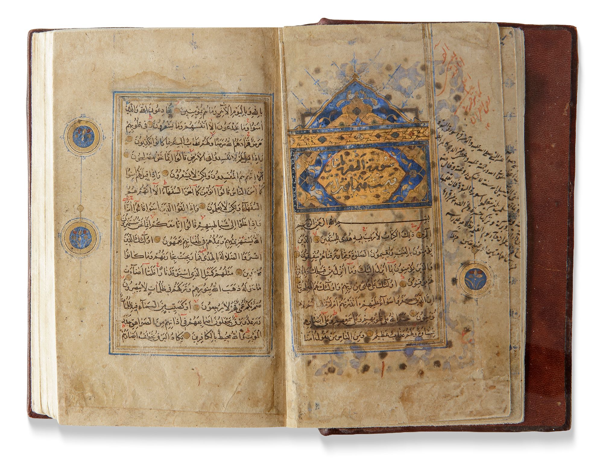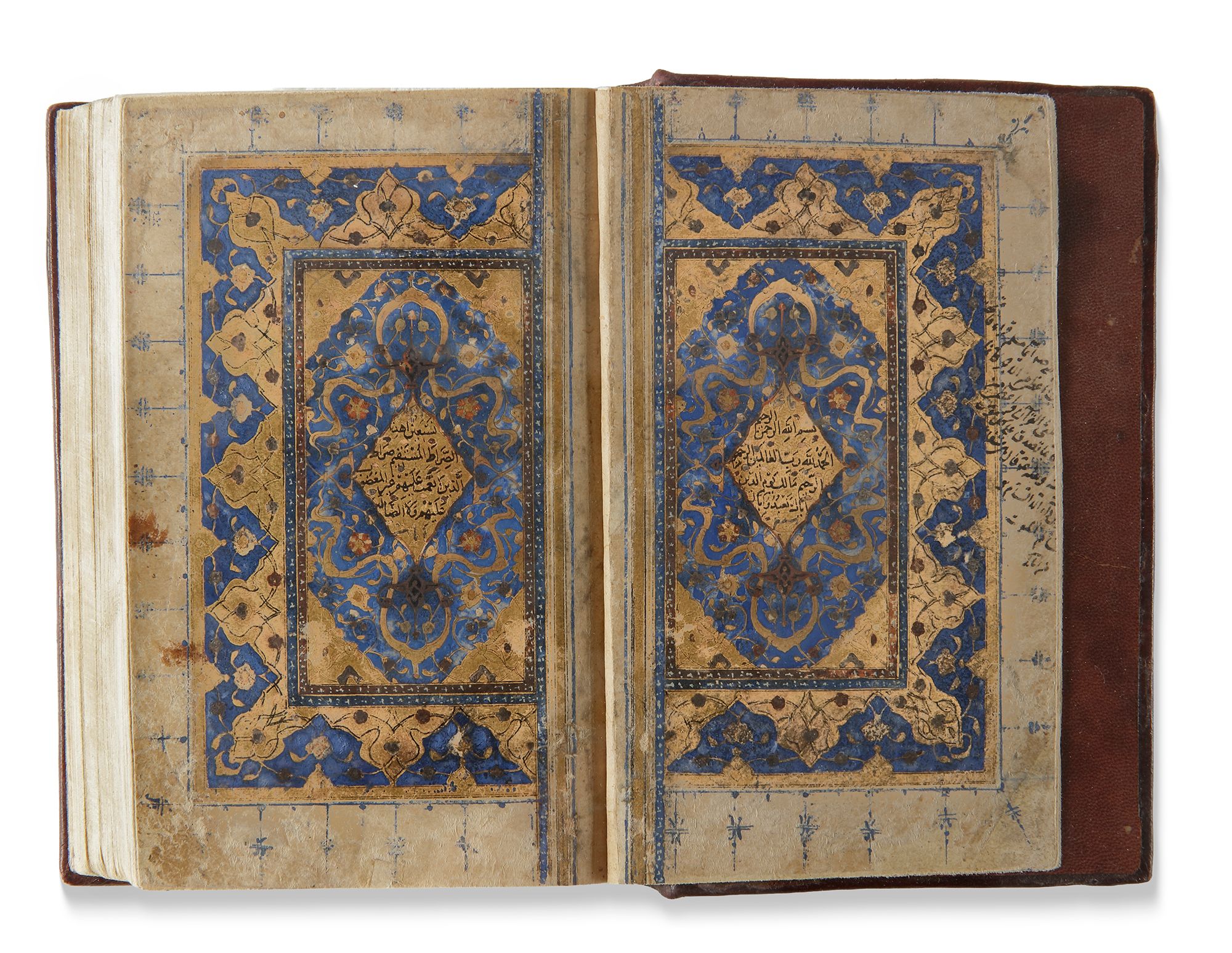 The illuminated opening bifolia, with their intricate interlacing vegetal motifs in gold and blue, relate closely to manuscript production in centres such as Shiraz and Tabriz during the 16th century. The use of white thuluth for sūrah headings against a gilt ground further underscores the manuscript’s high level of craftsmanship.