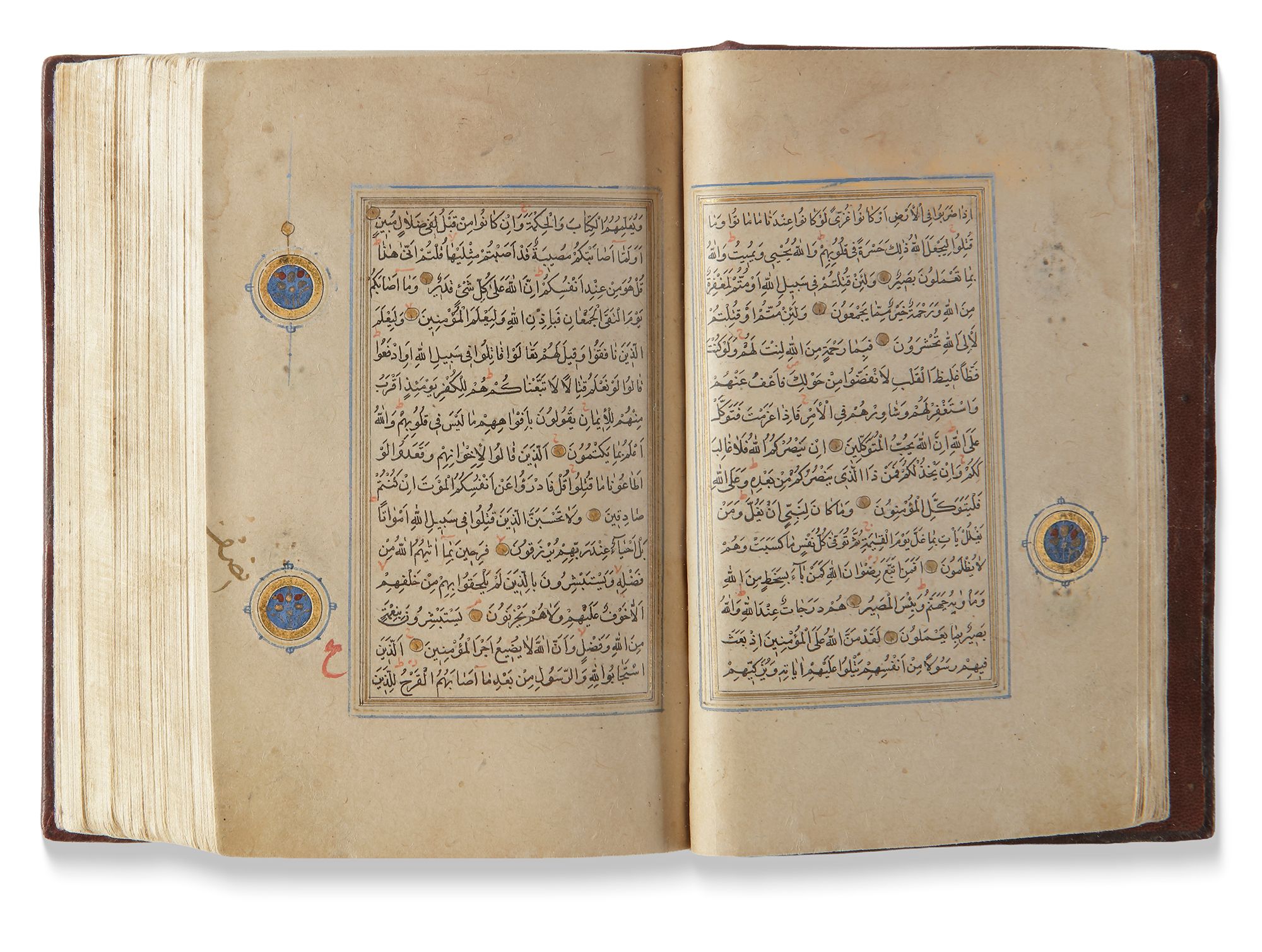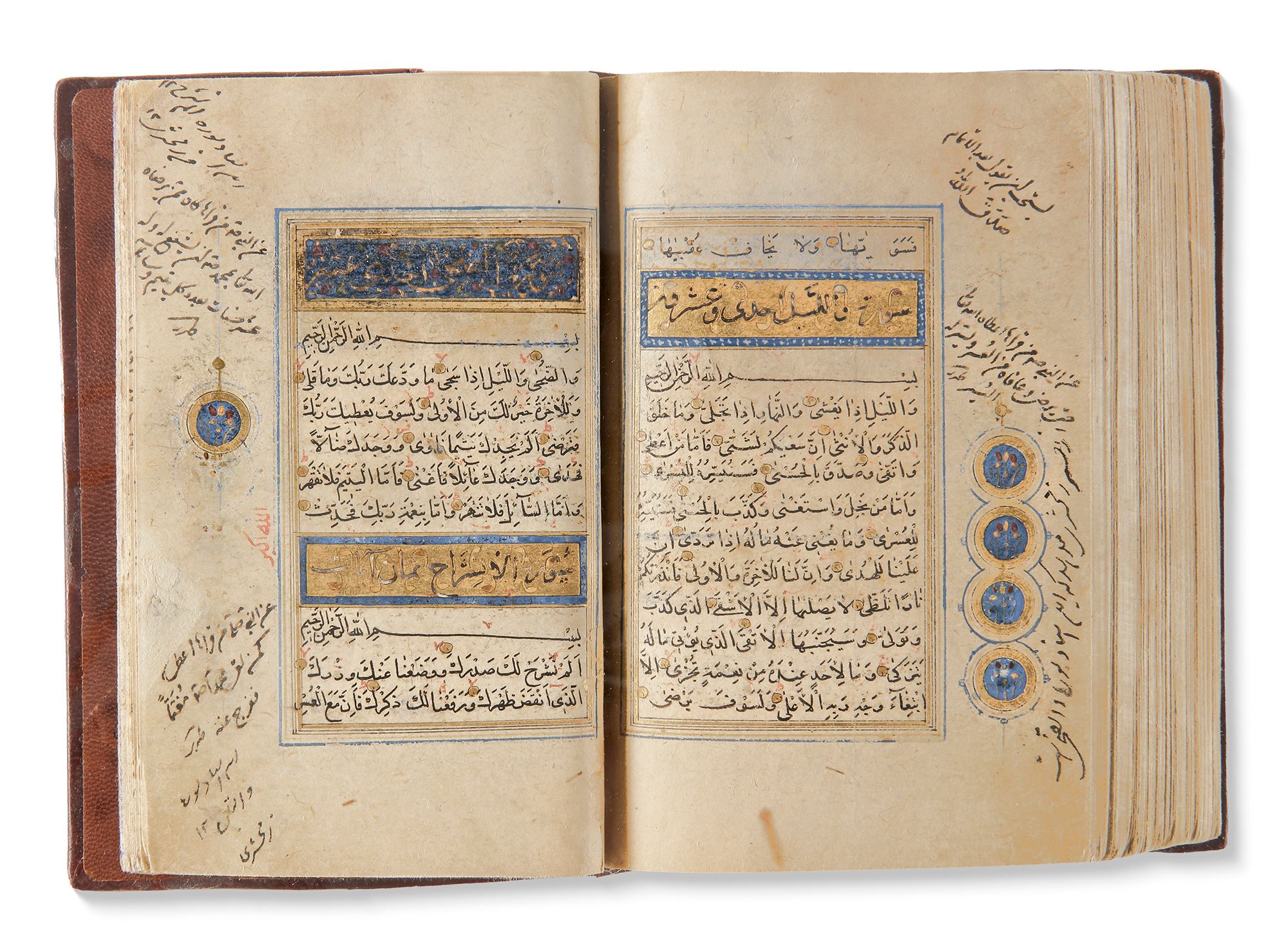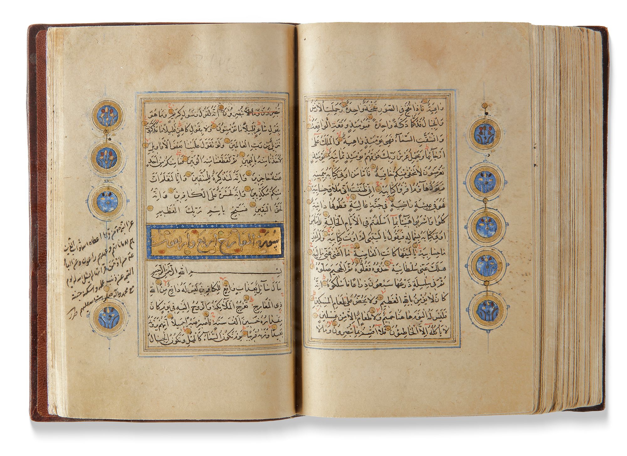 A complete Quran, Arabic manuscript on cream paper, comprising a complete Quran, each page with 15 lines of elegant black naskh script within gold and blue ruled borders, gold roundel verse markers outlined in black, vocalisation and tajwīd in red; surah headings in white thuluth reserved against a gilt ground within illuminated panels; margins with gold and polychrome roundels indicating juzʾ and ḥizb, with occasional marginal annotations and commentaries.