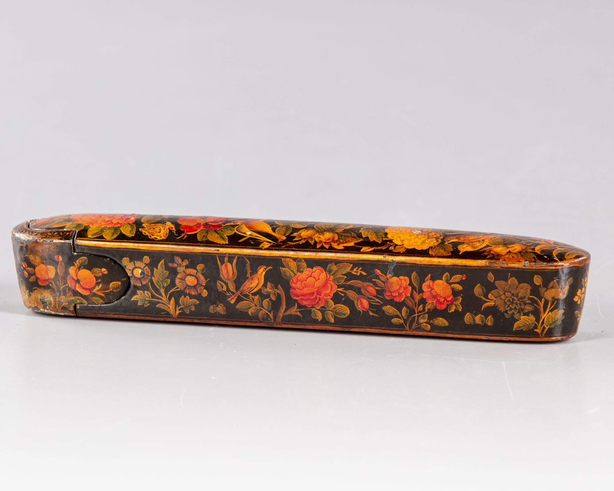 A Qajar lacquer paper mâché pen case, Of typical elongated from, the polychrome and gilt painted decoration with a birds perched amongst flowers and foliage.