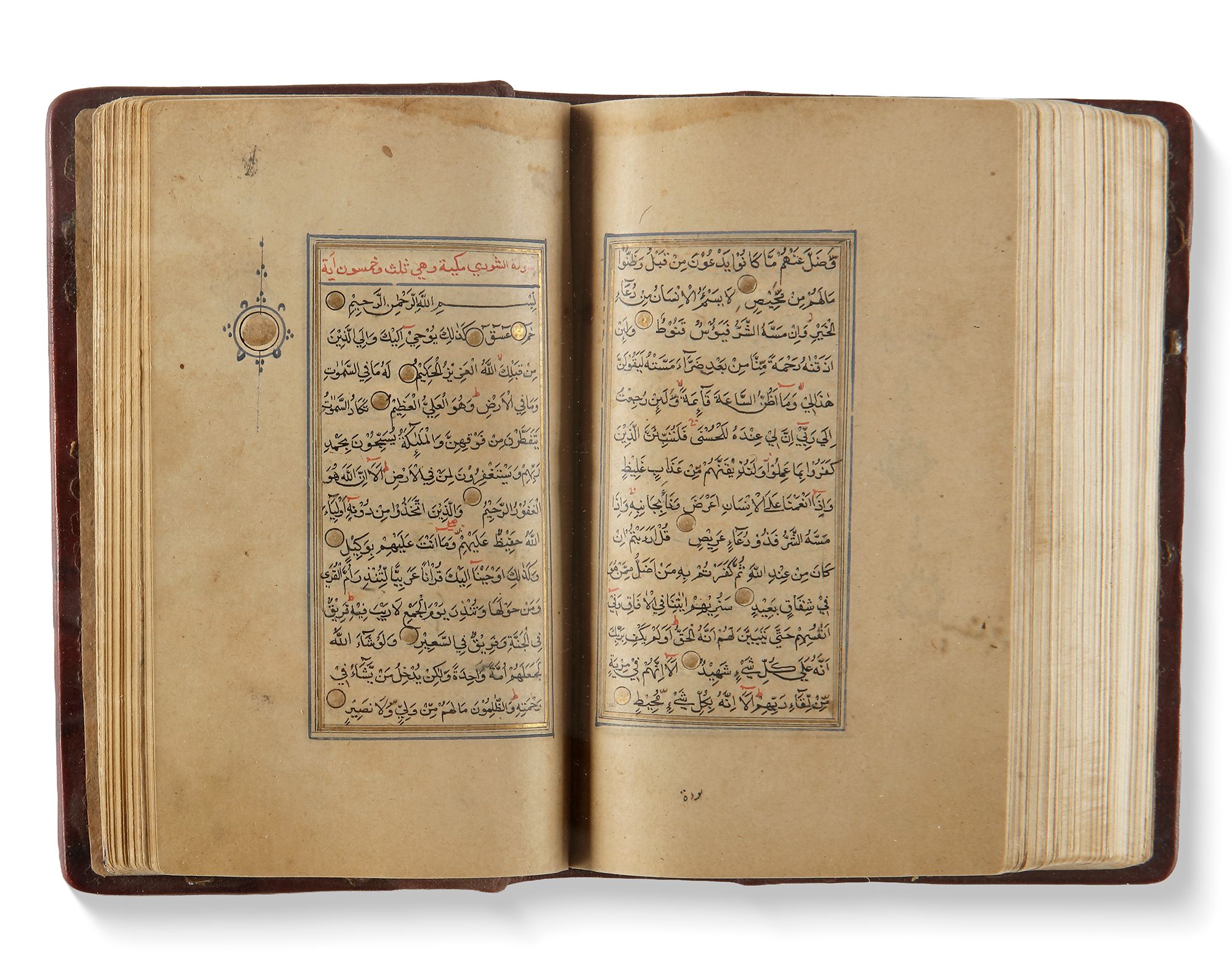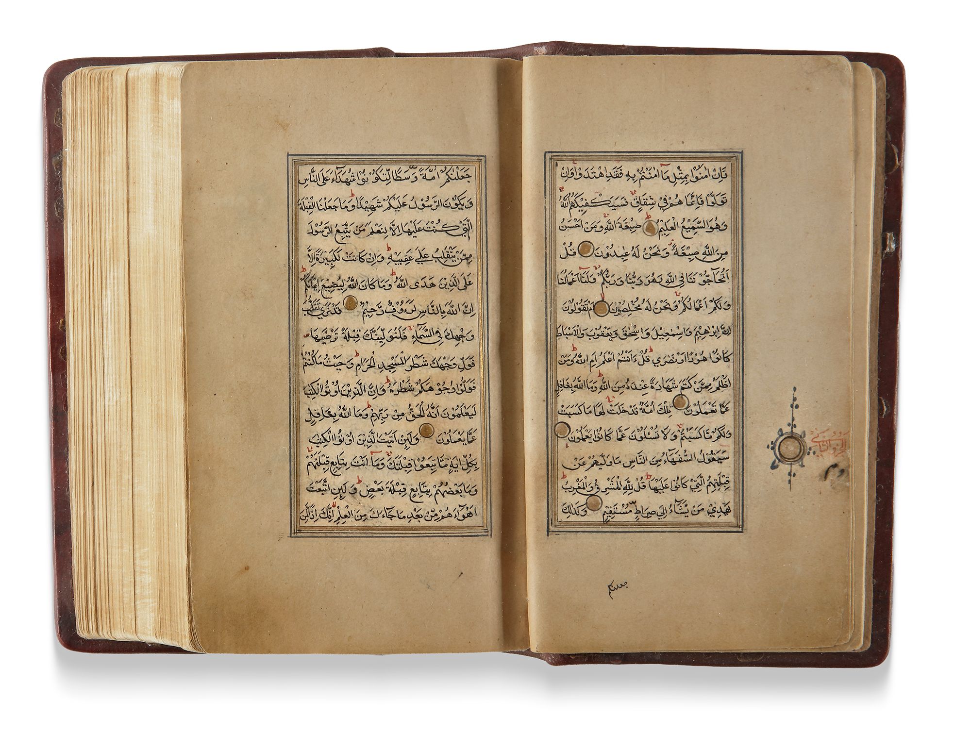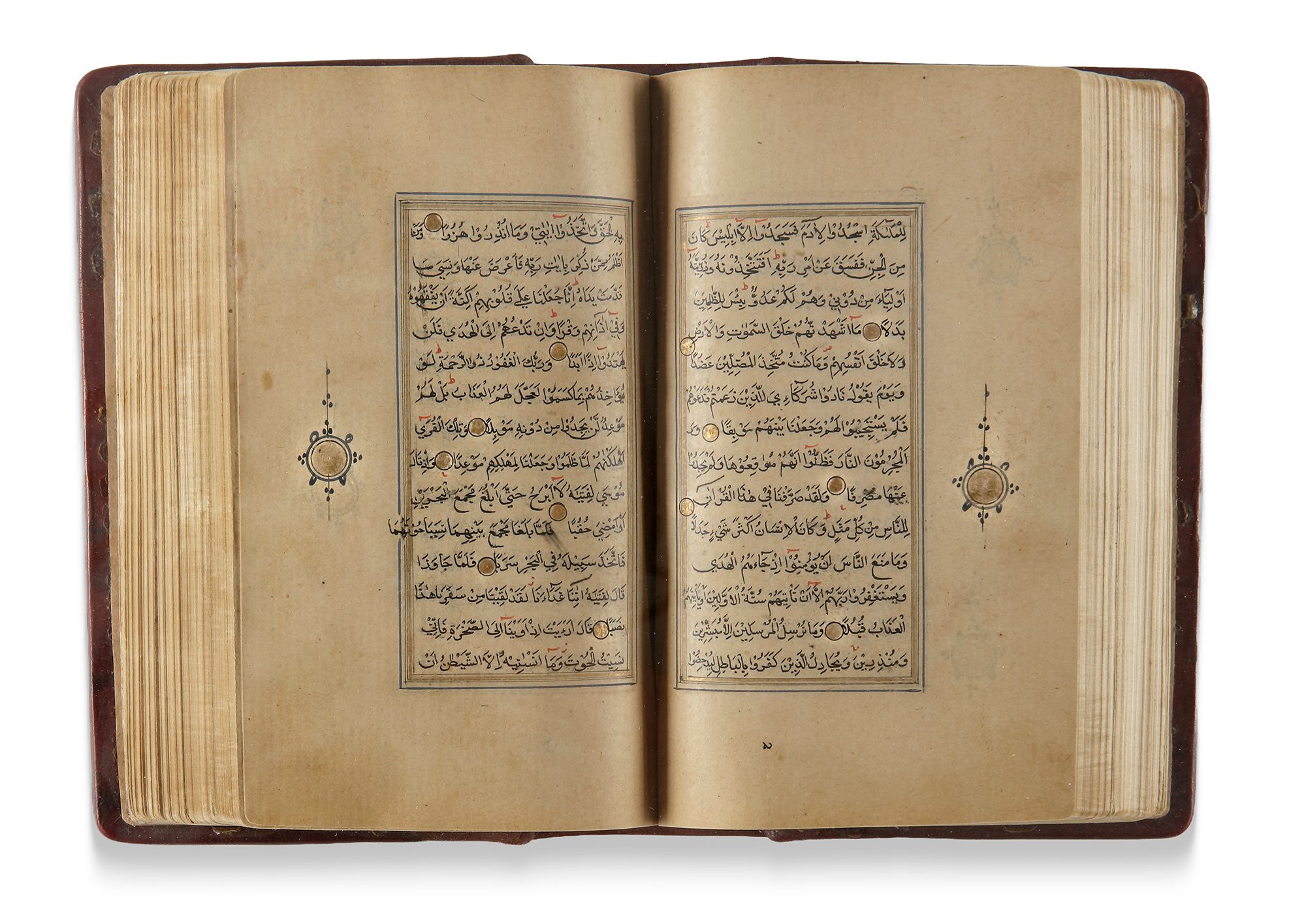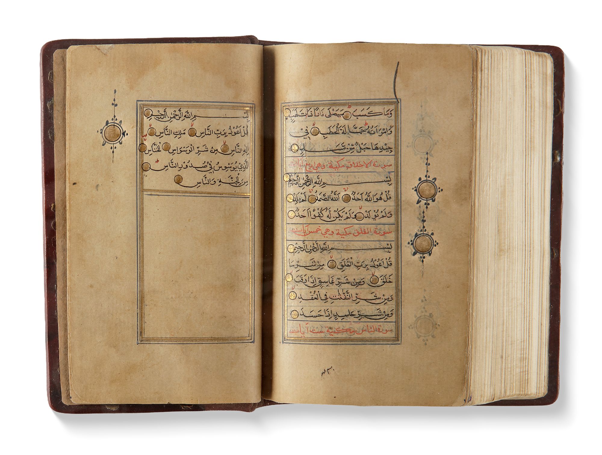 A complete Quran, Arabic manuscript on cream paper, each page with 14 lines written in black naskh script within gold and blue rules, gold roundel verse markers outlined in black, tajwid and diactries in red. Surah headings in red ink, gold and polychrome marginal floral roundels indicating the 'Juz and Hizb'. Two opening biofolia heavily with gilt and polychrome decoration framing 9 lines of black naskh script in clouds reserved against a sprinkled gold ground.