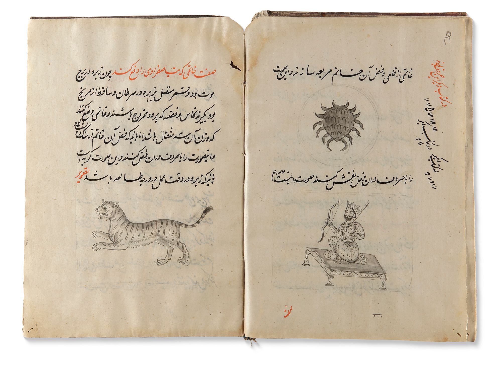 The work is identified as Dhakhirat al-Iskandar al-Malik ibn Filiqs Dhi al-Qarnayn, a richly illustrated astrological and talismanic compendium. Traditionally attributed to Aristotle and said to have been composed for his illustrious pupil Alexander the Great, the text is believed to have been translated into Arabic at the behest of the Abbasid Caliph al-Mu'tasim.