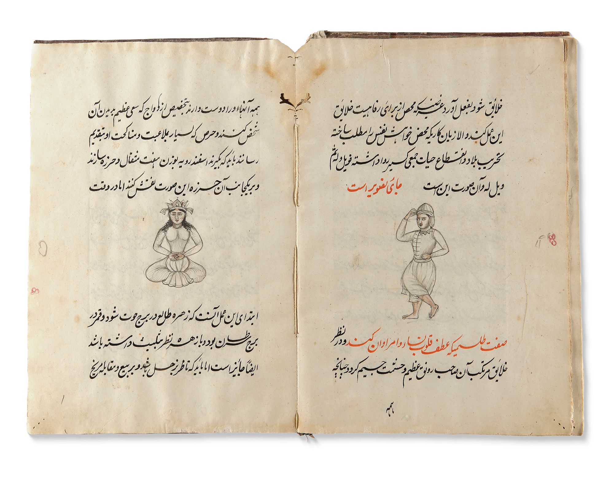 It is richly illustrated with 32 miniature paintings, reflecting a vibrant visual tradition. The illustrations depict a fascinating array of subjects, including mythical creatures, astrological signs, and animals. Among these are birds, bulls, and serpents; one striking image portrays a female rider mounted upon the Capricorn sea-goat, while another shows a woman endowed with a scorpion’s tail. The most unusual composition presents a man and a woman adorned respectively with phallic and vulvar motifs, contributing to the manuscript’s vivid, eclectic, and symbolic visual language.
