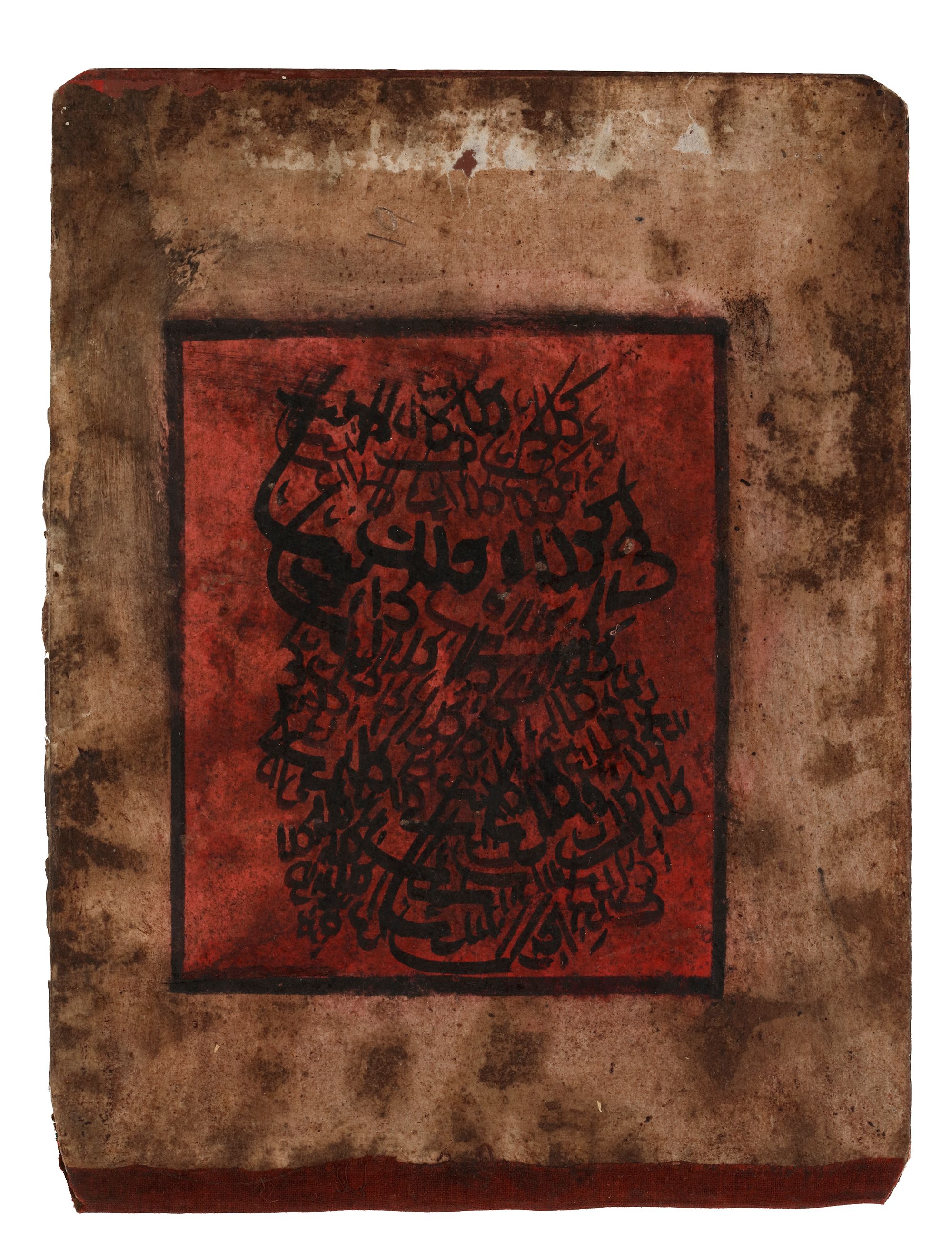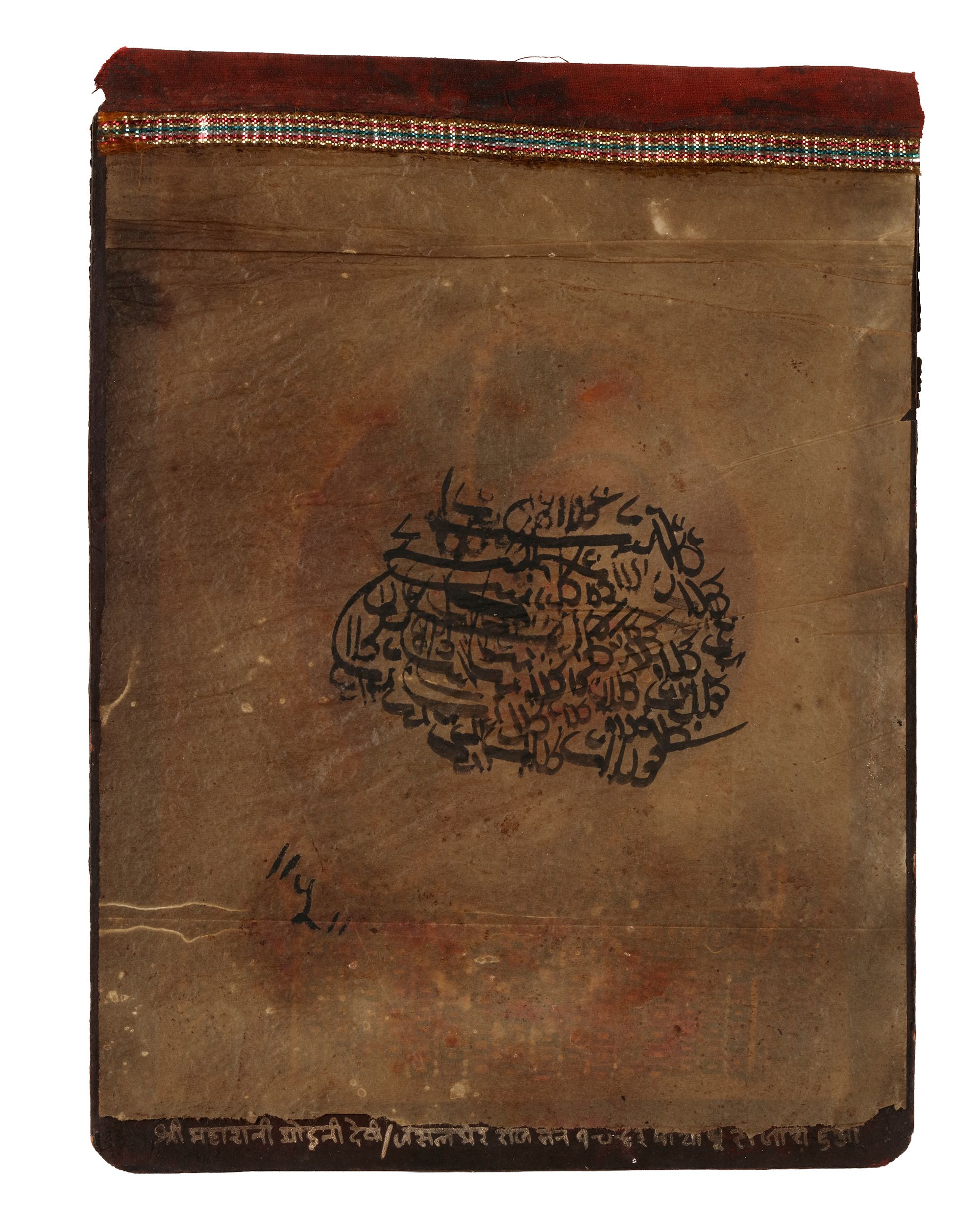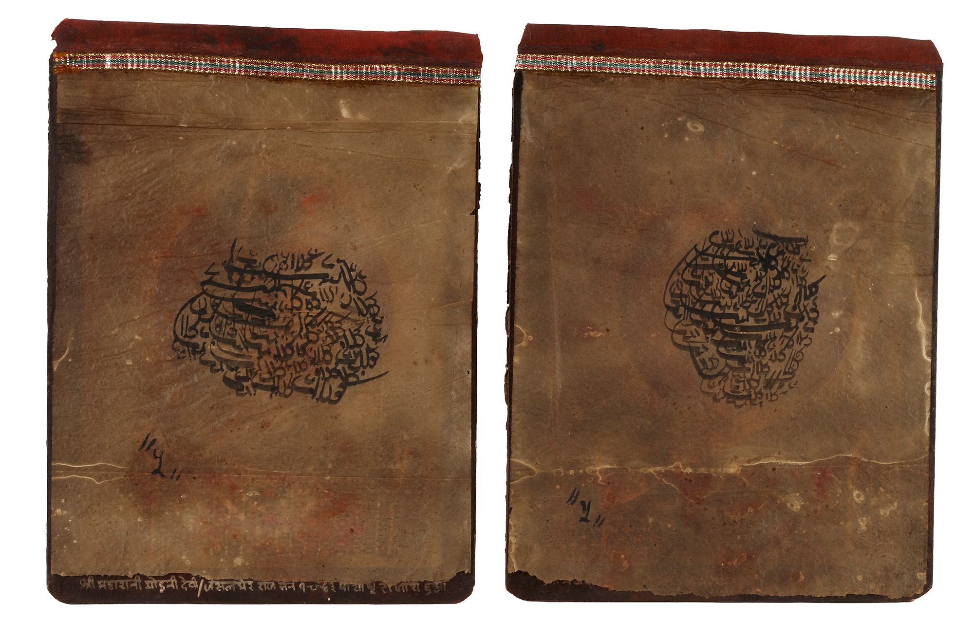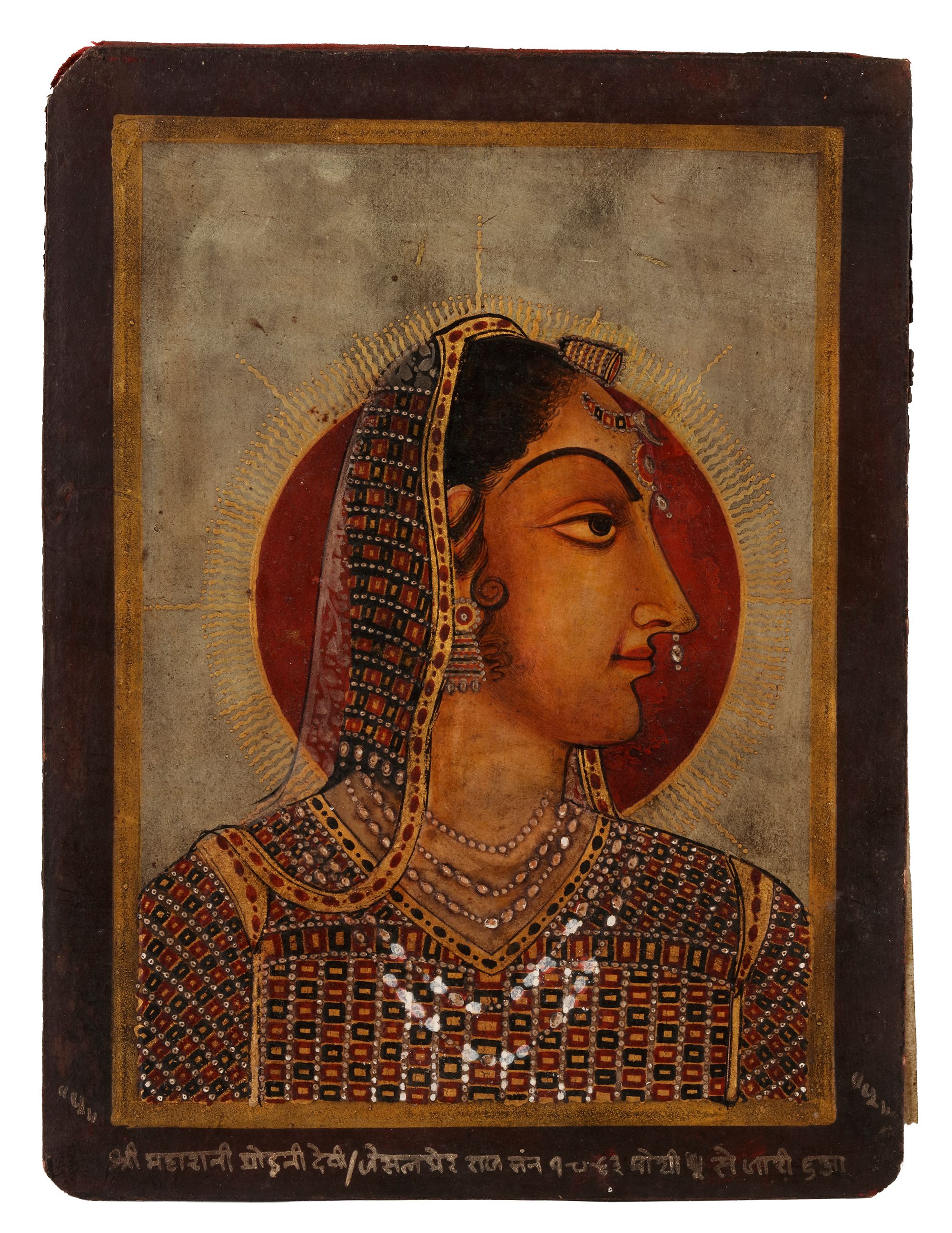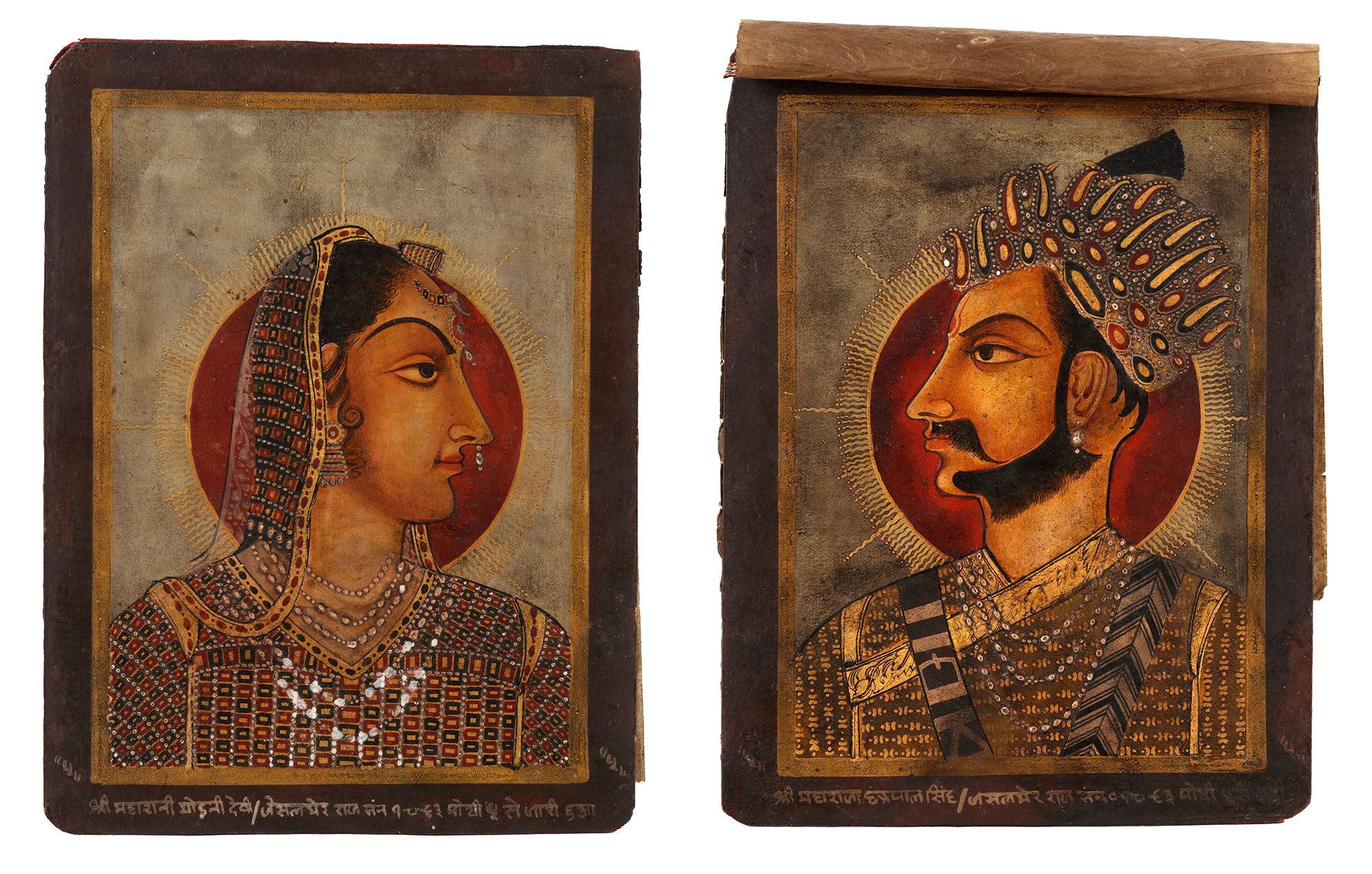 A fine pair of 19th-century Indian portrait paintings depicting a noble lady and a bearded man in profile, executed in the traditional Rajput / North Indian miniature style. Each figure is shown with a radiant halo against a muted background, emphasizing their noble or royal status. The lady wears an elaborate beaded headdress, jewelry, and richly patterned garments, while the man is portrayed with a decorated turban, beard, and ornate attire typical of aristocratic portraiture of the period. 20 by 15 cm.