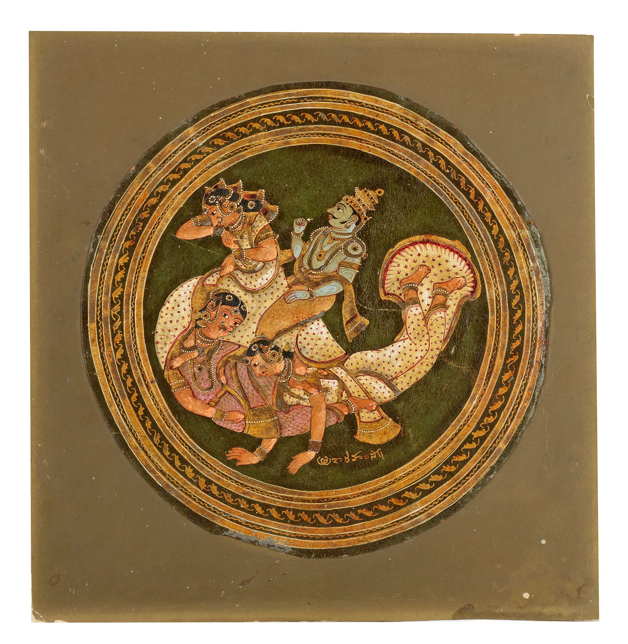 Indian miniature painting depicting richly adorned figures in a dynamic and intimate composition within a circular medallion. Surrounded by an ornate border with gold detailing,