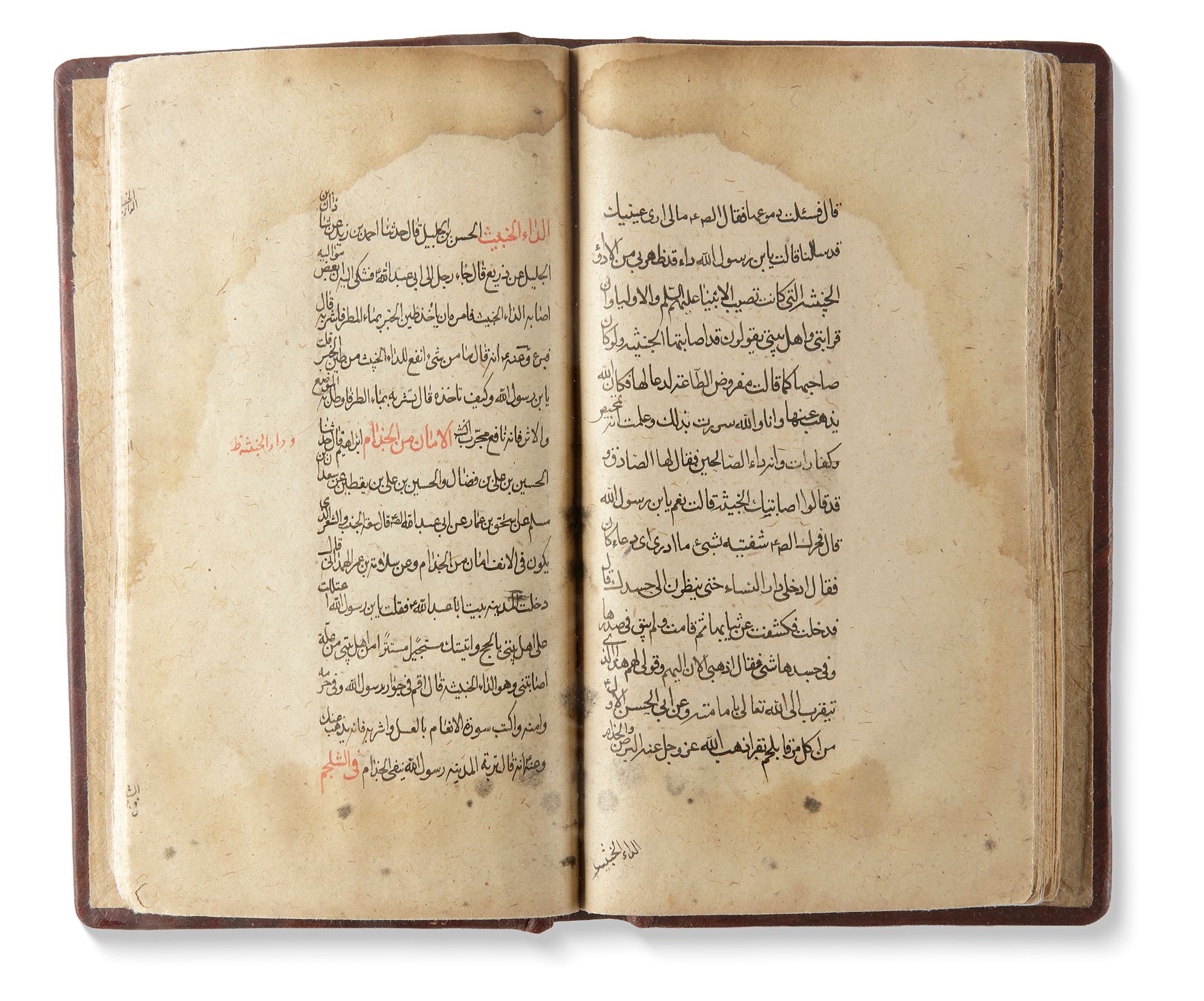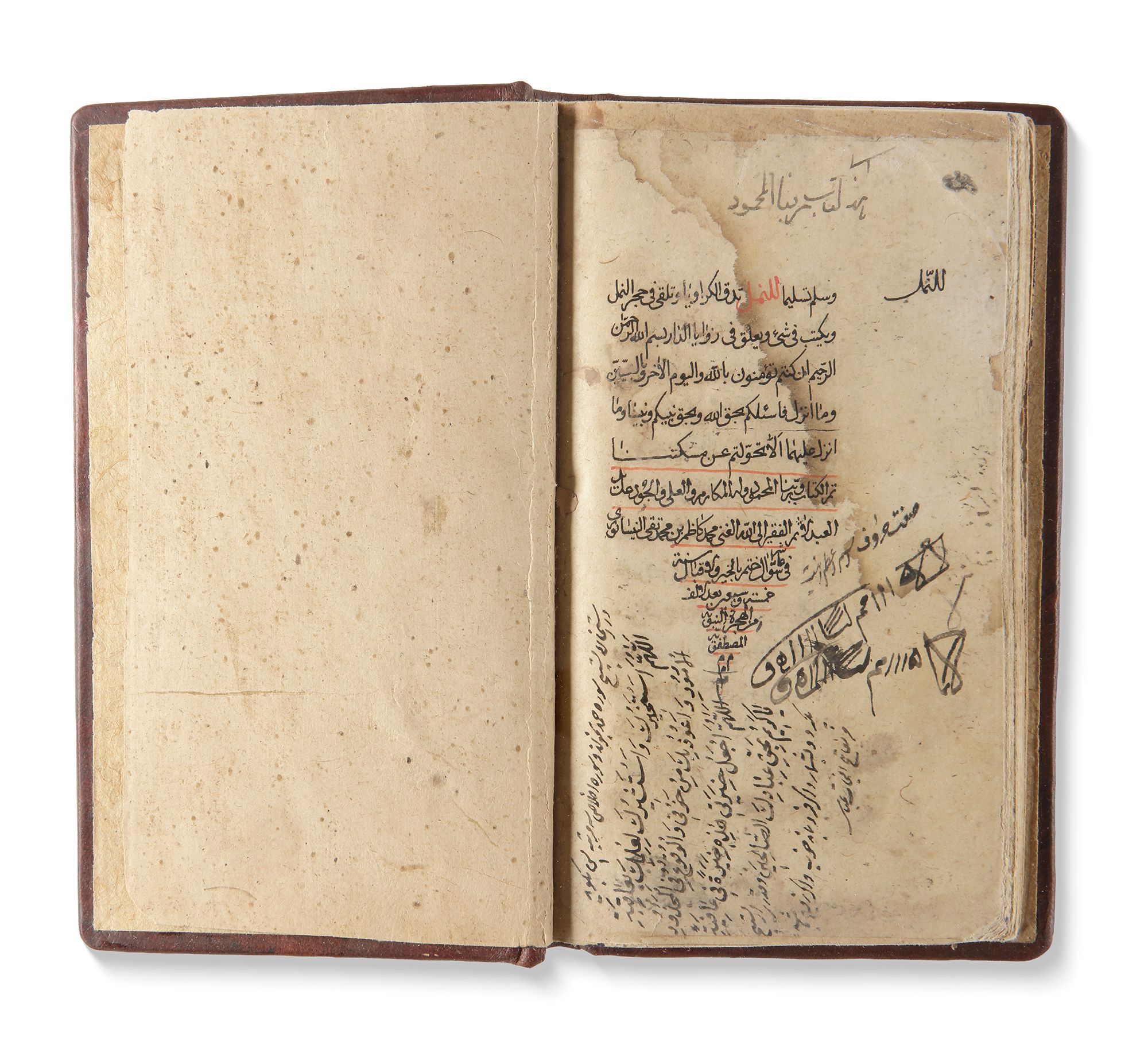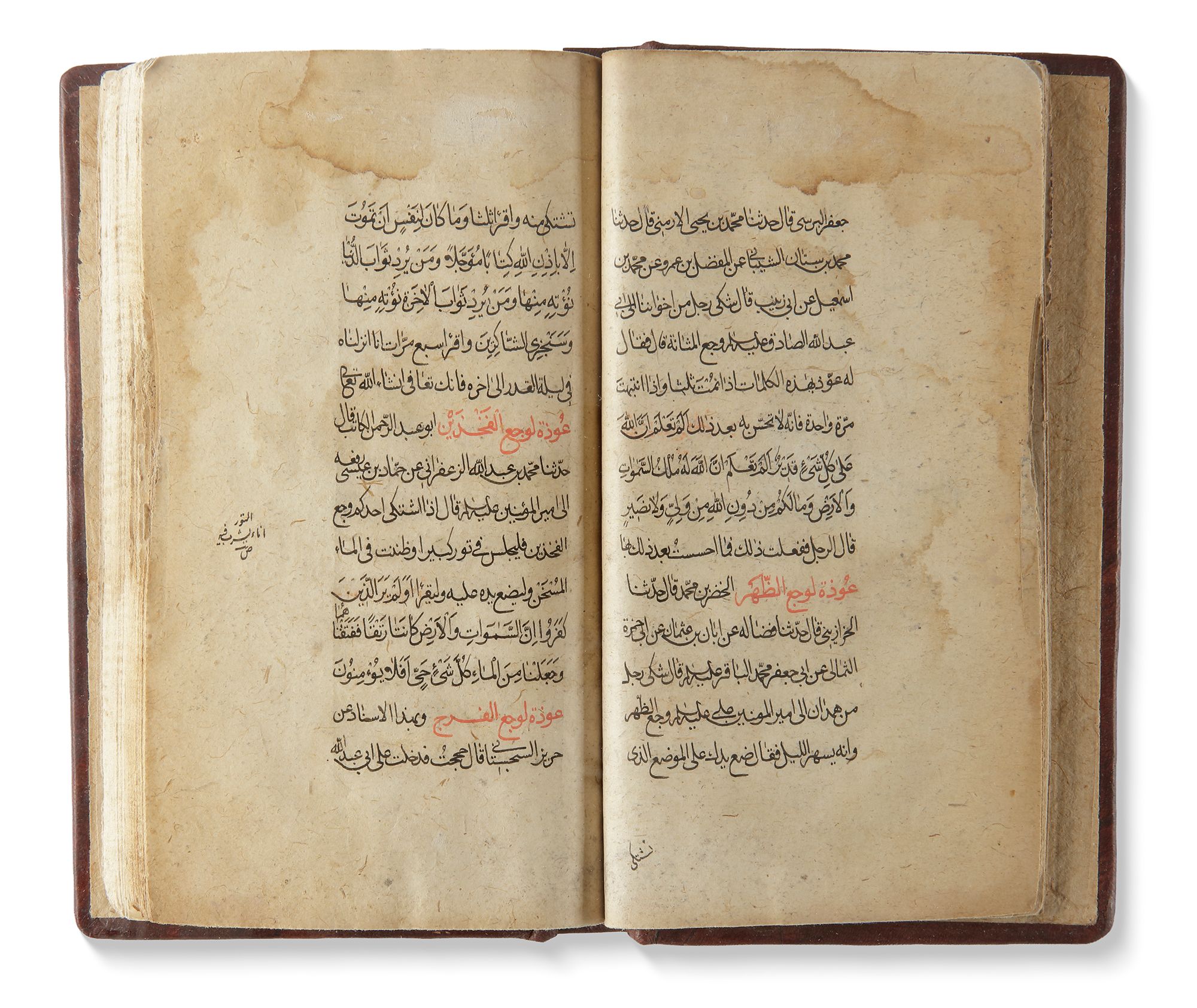 It is bound in a deep brown leather cover, indicative of traditional Islamic manuscript craftsmanship.