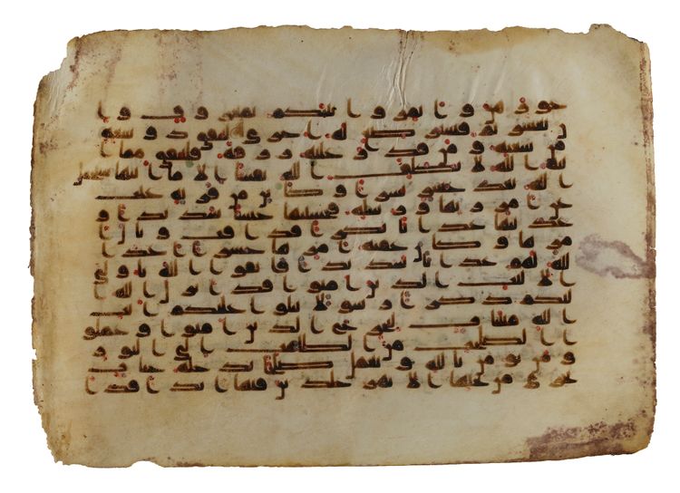 The folio exemplifies the austere elegance of early Kufic calligraphy, in which clarity, balance, and visual authority take precedence over later ornamental excess. The illumination remains minimal yet purposeful, underscoring the sacred nature of the text without distracting from its legibility. A related folio from the same manuscript is preserved in the Aga Khan Museum under the accession number AKM293. The script and decorative program of this leaf are closely comparable to two folios in the Khalili Collection (inv. nos. KFQ13 and KFQ14), published by François Déroche (1992, pp. 54–55, no. 9). These parallels reinforce the attribution and dating of the manuscript and situate it firmly within the early tradition of Qur’anic production in the Islamic world.
