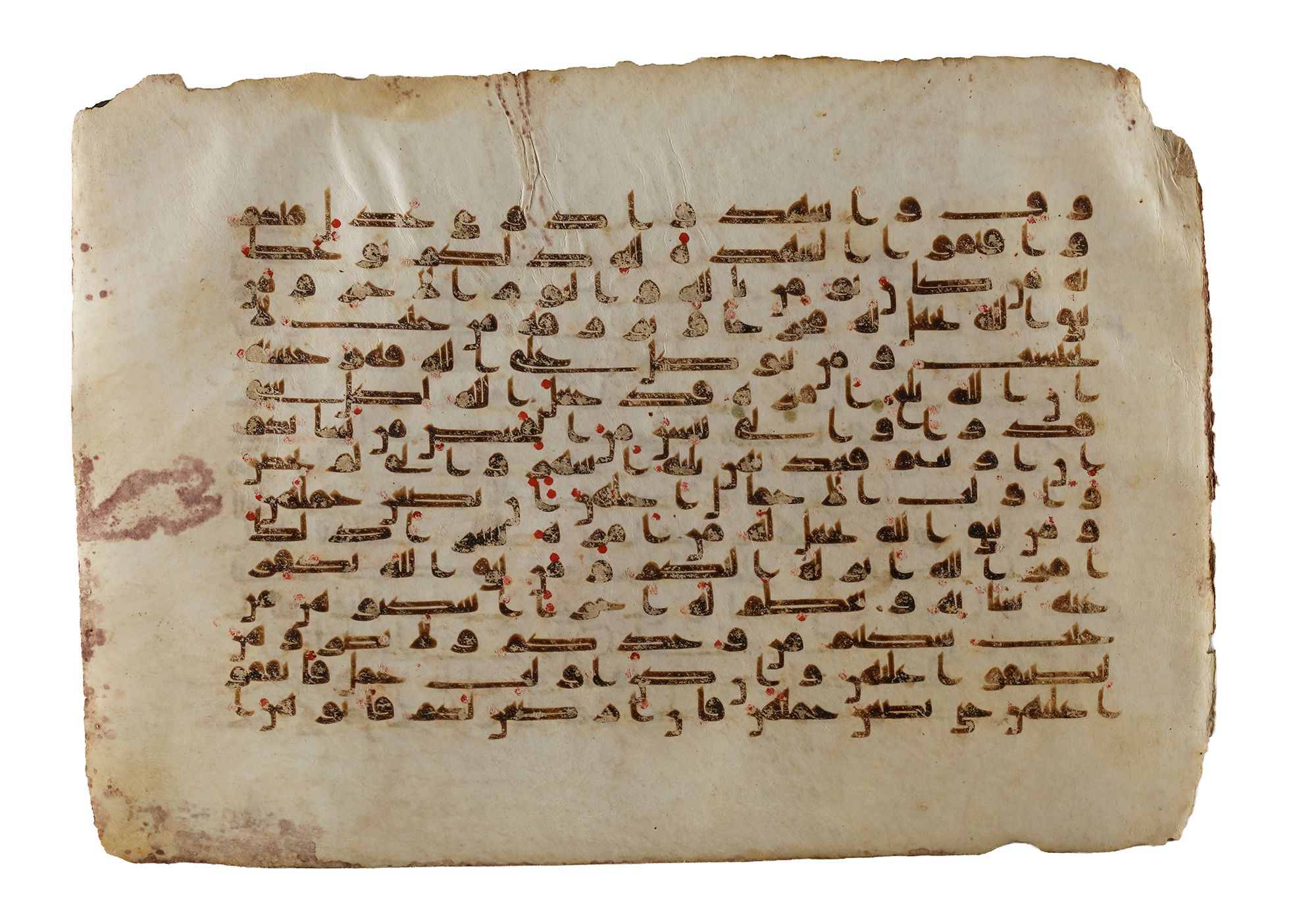 Arabic manuscript on vellum, 15 lines to the page written in elongated Kufic in dark brown ink, vocalization in the form of red dots, verses separated by small triangular clusters of three gold dots. Inscription: v.2 till v.11 from surah al-Talaq 18.5 by 26 cm