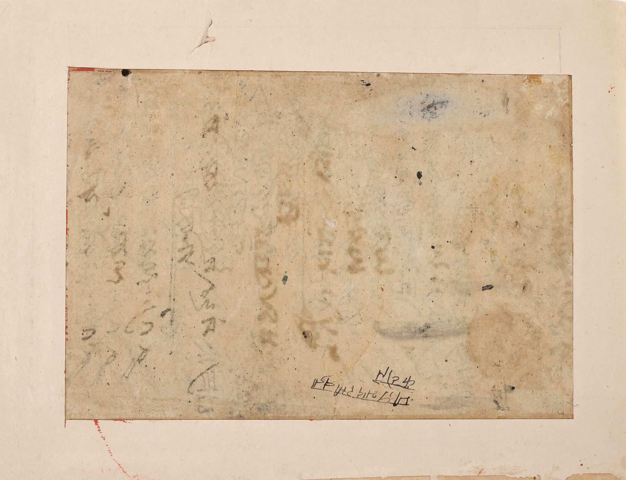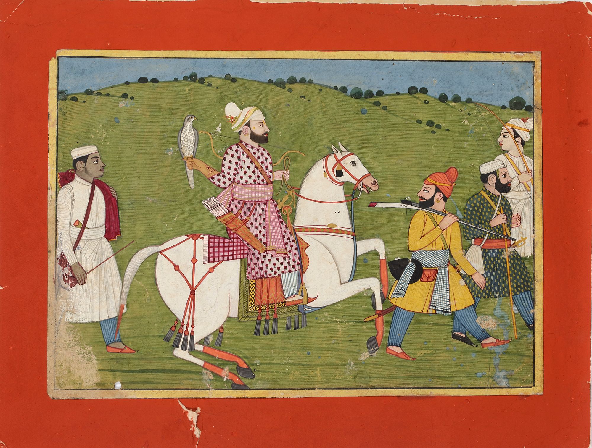 A 19th-century Indian miniature painting depicting a nobleman riding a white horse while holding a falcon, accompanied by attendants carrying weapons and equipment. Set against a rolling landscape, the scene reflects themes of royal hunting and aristocratic life common in traditional Indian miniature painting. 33 by 25 cm.