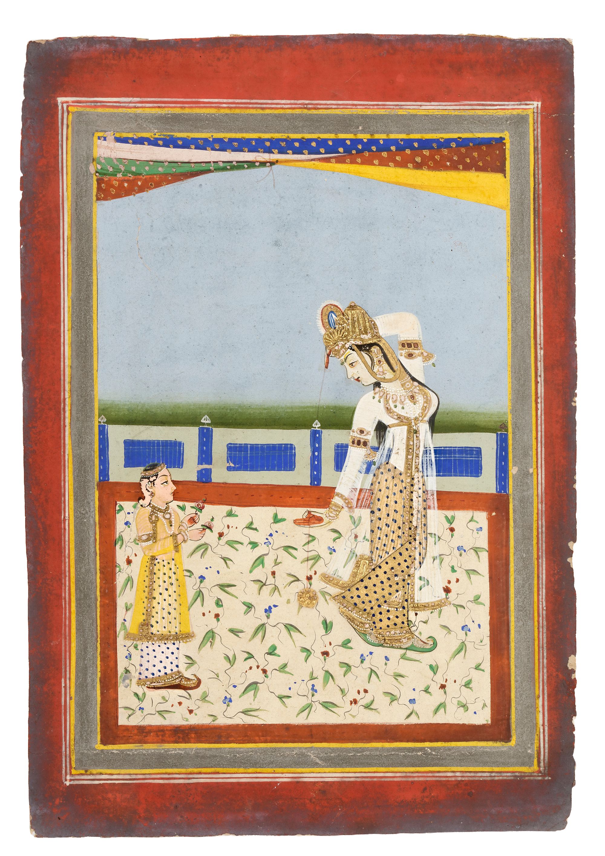 A 19th-century Indian miniature painting depicting an elegantly dressed noblewoman standing on a palace terrace attended by a young companion. The refined garments, jewelry, and delicate floral ground reflect the grace and decorative beauty characteristic of Indian courtly miniature painting. 23 by 16 cm.