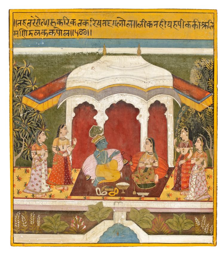 Indian miniature painting depicting the blue-skinned deity Krishna seated with a noble lady beneath a palace pavilion, attended by female companions. The elegant garden setting and delicate figures reflect the poetic and devotional themes characteristic of traditional Indian miniature painting.
