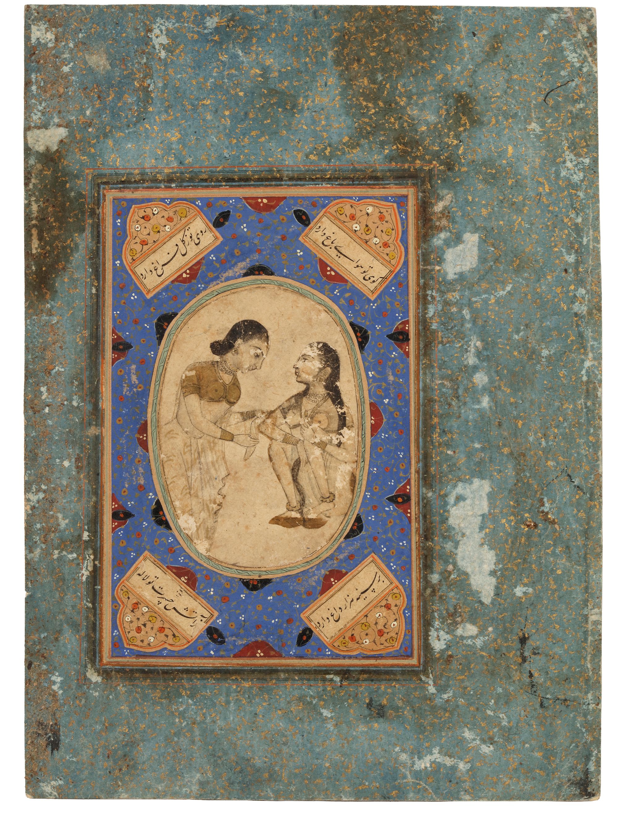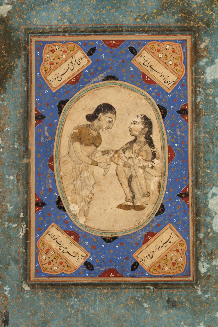 Indian miniature painting showing two elegantly dressed women in a tender interaction within an oval medallion. Surrounded by a richly decorated blue border with floral motifs and calligraphy.