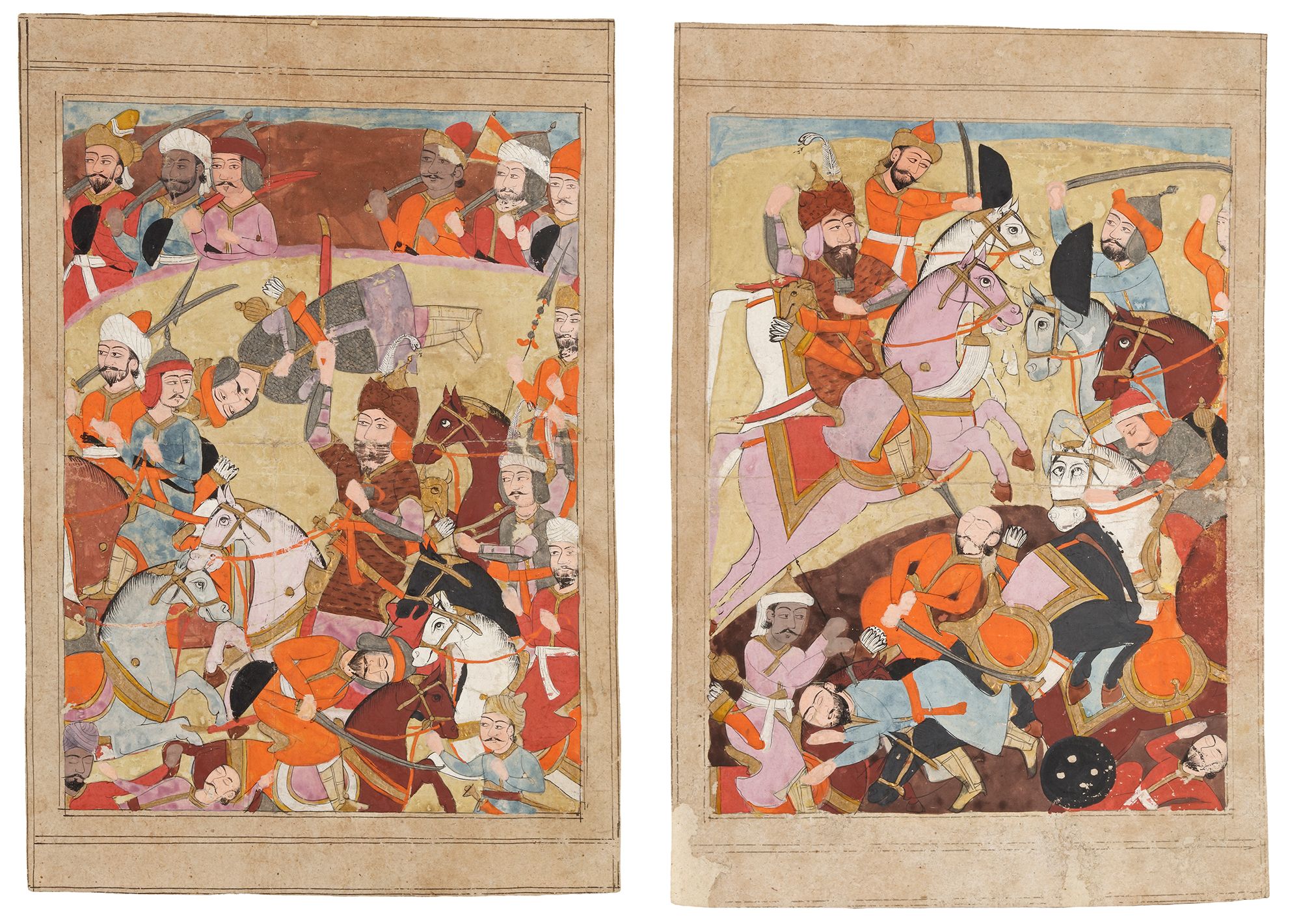 A pair of miniature paintings illustrating intense mounted battles filled with warriors, horses, and weapons in dynamic movement. The crowded compositions and vivid colors convey the drama of historical combat.