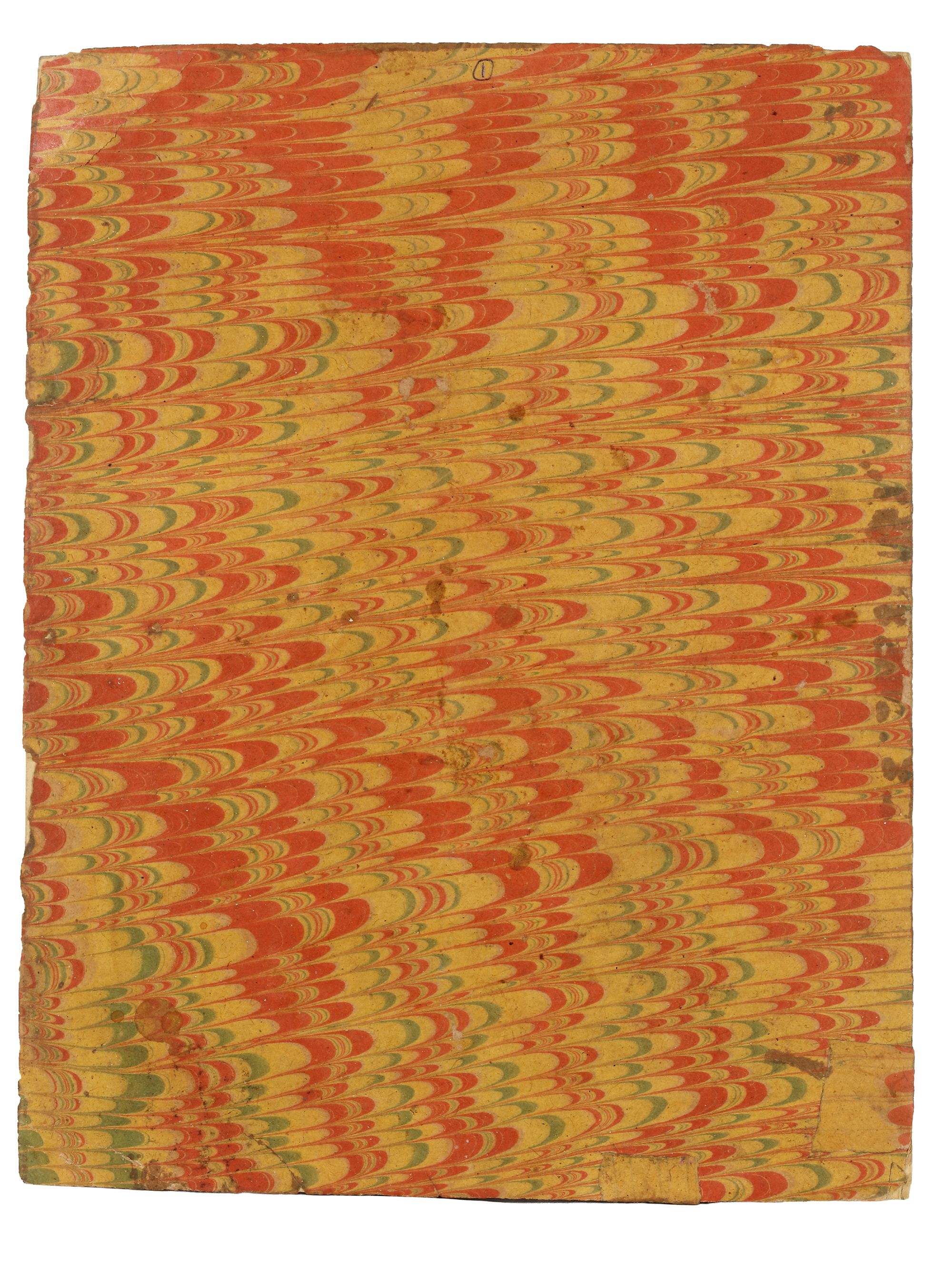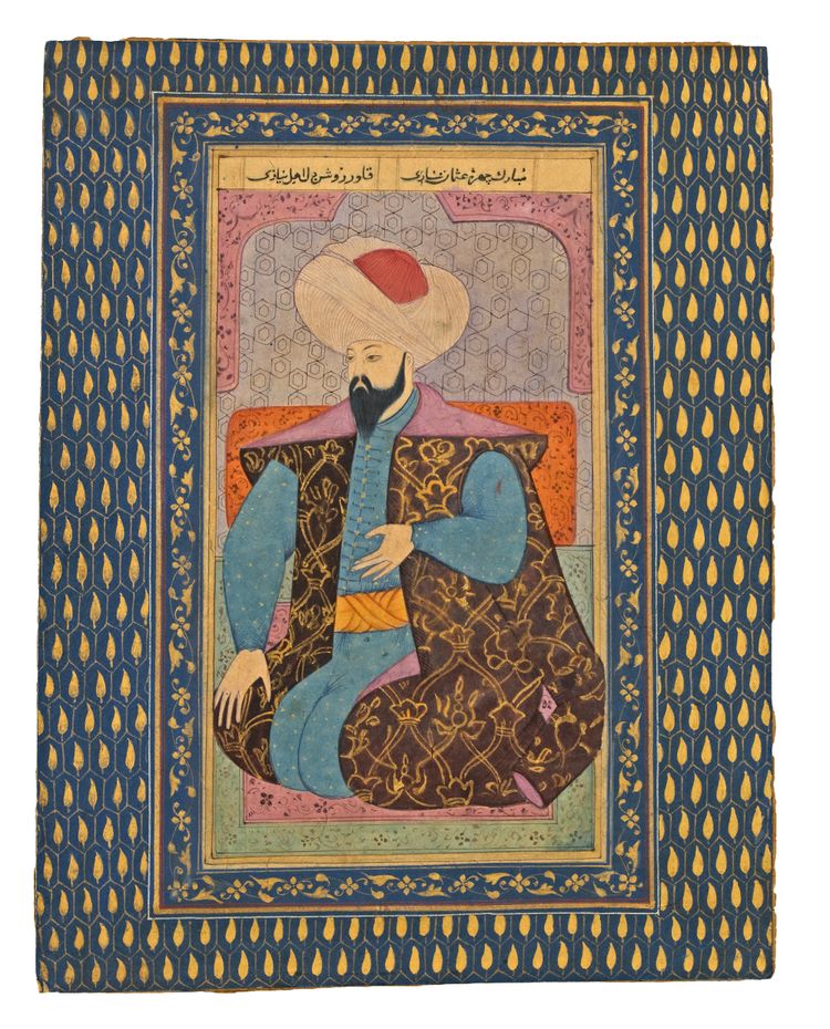 Gouache pigments heightened with gold on paper, laid down on album page, depicting a seated important person, wearing a large white turban decorated in gold with large flower heads, dressed in an elegant gilt purple coat. All ruled in gold and polychrome borders. 25 by 19,5 cm.