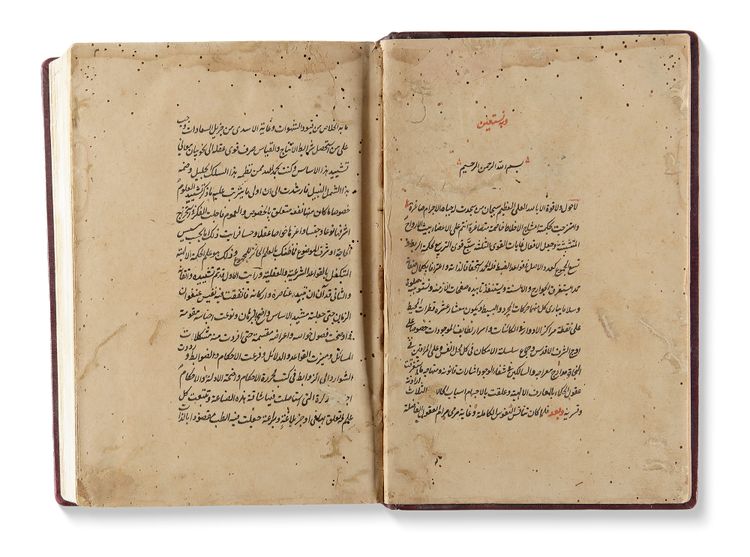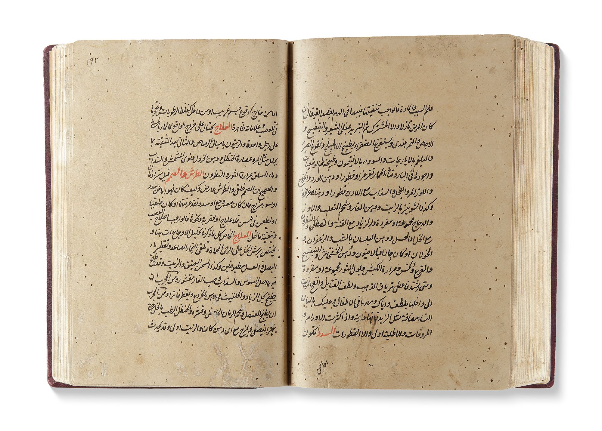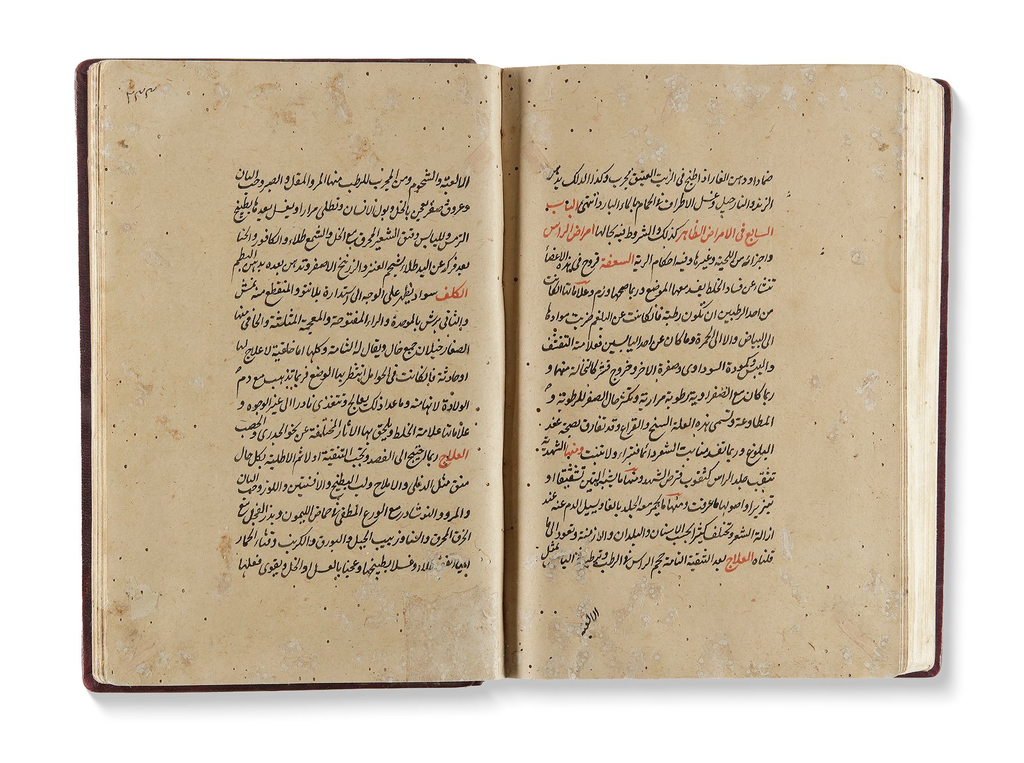 Arabic manuscript on paper, 375 leaves., each page with 15 lines, written in a neat naskh script; catchwords and important words in red ink; housed in a deep brown leather binding. 15.5 by 23 cm A classical Arabic medical compendium that unites philosophy and practice, this work traces the order of knowledge from first principles to the care of the human body. It examines temperament, environment, and anatomy before turning to the causes of health and disease across all stages of life. Refined in its diagnostic art, it analyses signs, the pulse, and the critical moments of illness to guide prognosis. Concluding with practical rules of treatment and regimen, it presents medicine as a balanced discipline—at once rational, observational, and deeply attuned to the harmony of the human condition. The Author Al-Antaki emerges as a true polymath—physician, philosopher, man of letters, poet, astronomer, and historian—whose prolific output spans multiple disciplines, reflecting both breadth of learning and sound critical judgment. The following titles, though likely incomplete due to gaps in the sources, are among his known works: a treatise on the use of astrology in medicine; Istiqṣāʾ al-ʿilal wa-shifāʾ al-amrāḍ; and a medical alfiyya (didactic poem). Literature The work survives in several manuscript copies: A copy in Istanbul (Arabic section, no. 5186), 157 folios, in naskh script, copied by Yusuf in 1177 AH. Copies are also recorded in Iraq, Tunisia, and Egypt. The Iraqi copy is preserved in the Iraqi Museum (no. 3411), with another in its collection of medical manuscripts. A Tunisian copy, written in Maghrebi script, comprises approximately 250 folios, with 11 lines per page.