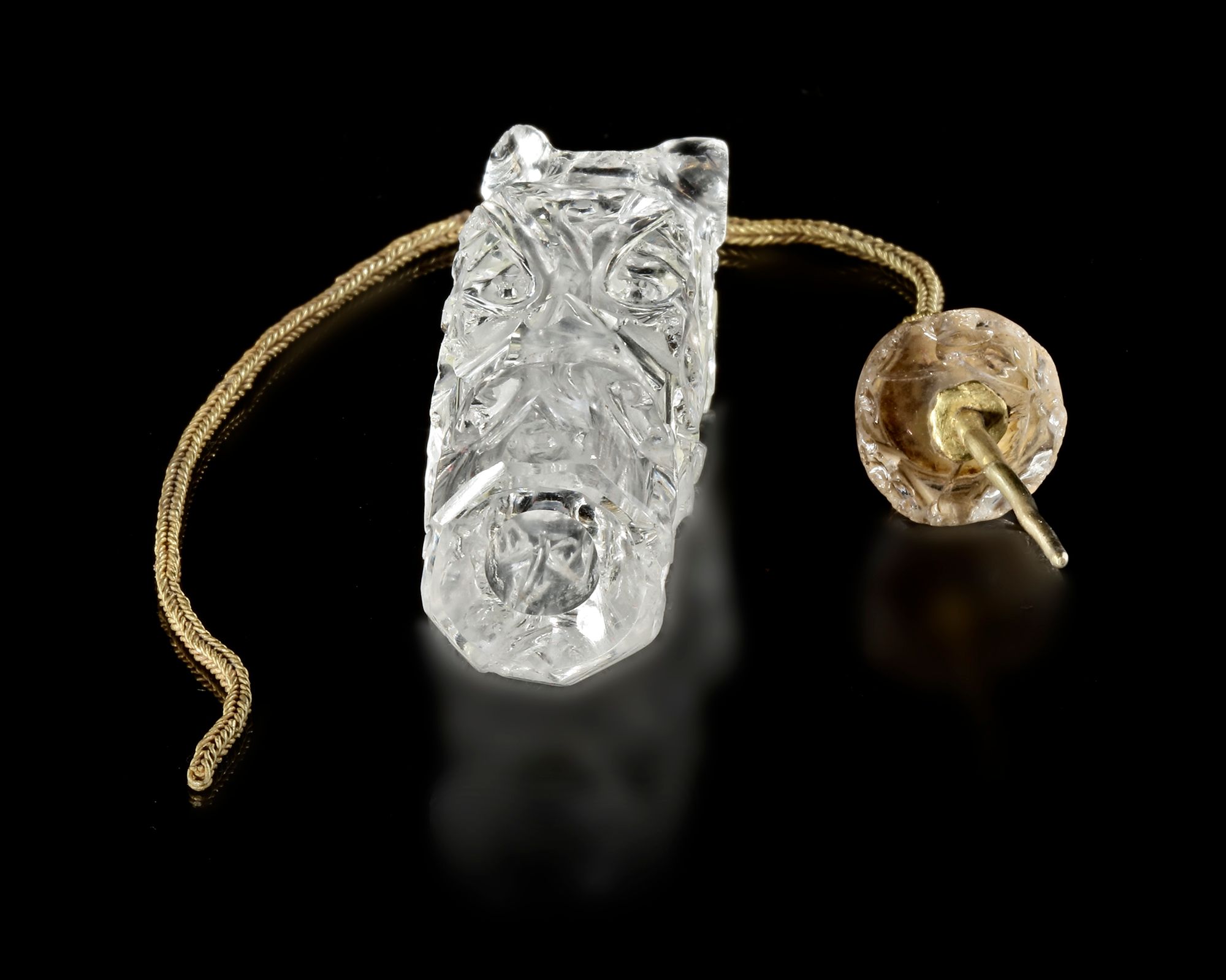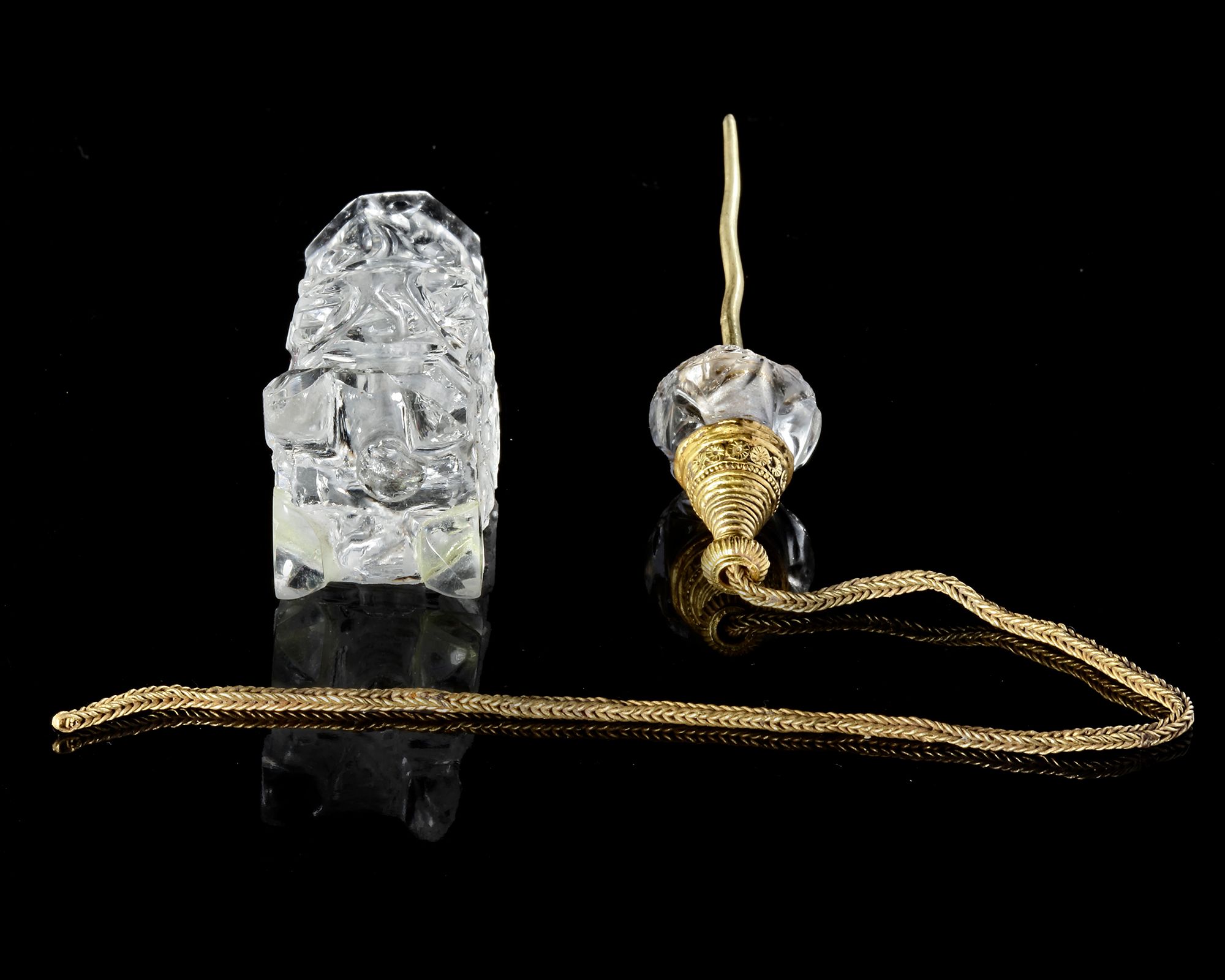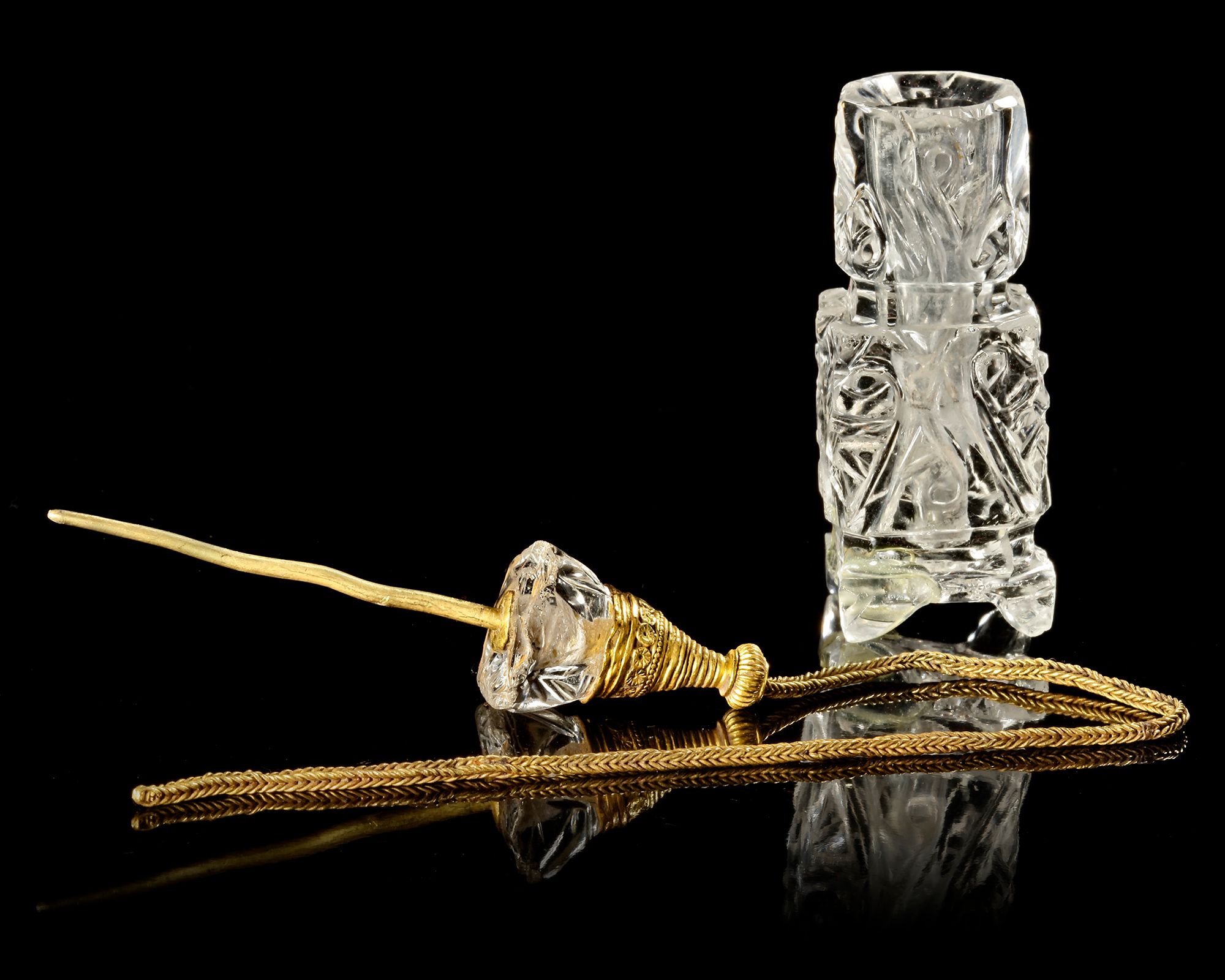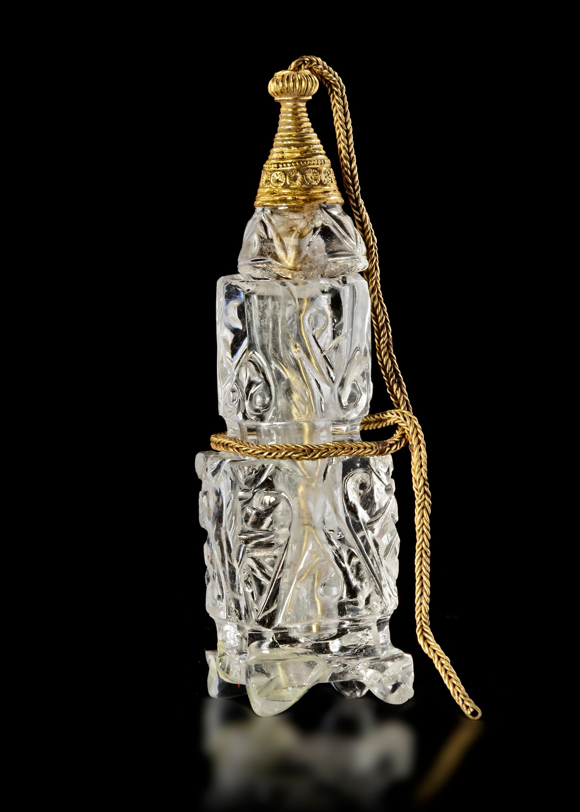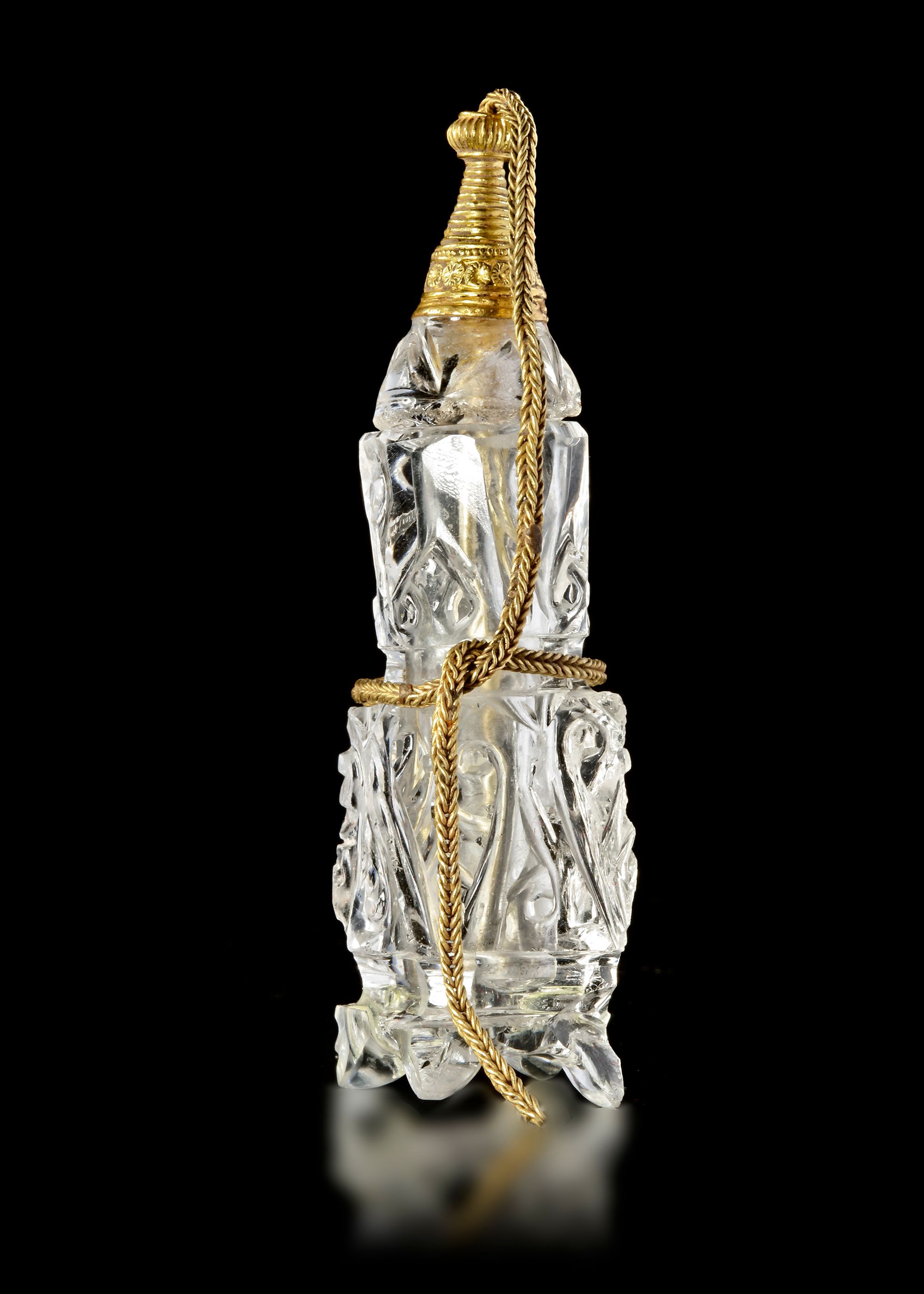 The stopper, also carved from crystal, is crowned with an ornate gold finial enriched with delicate granulation and filigree-like detailing. A fine gold chain secures it to the vessel, ensuring both practicality and continuity of form.