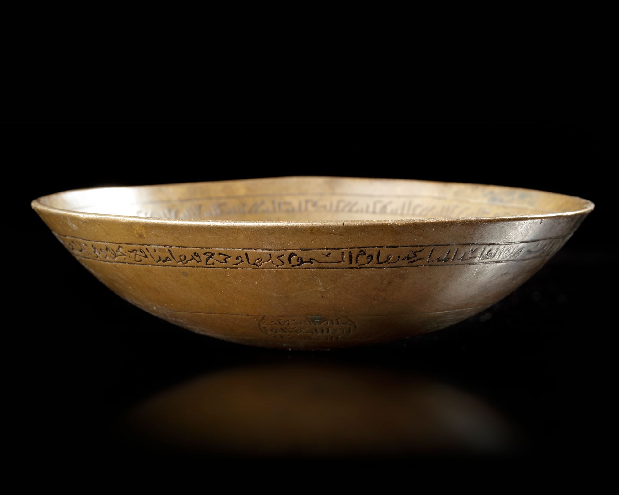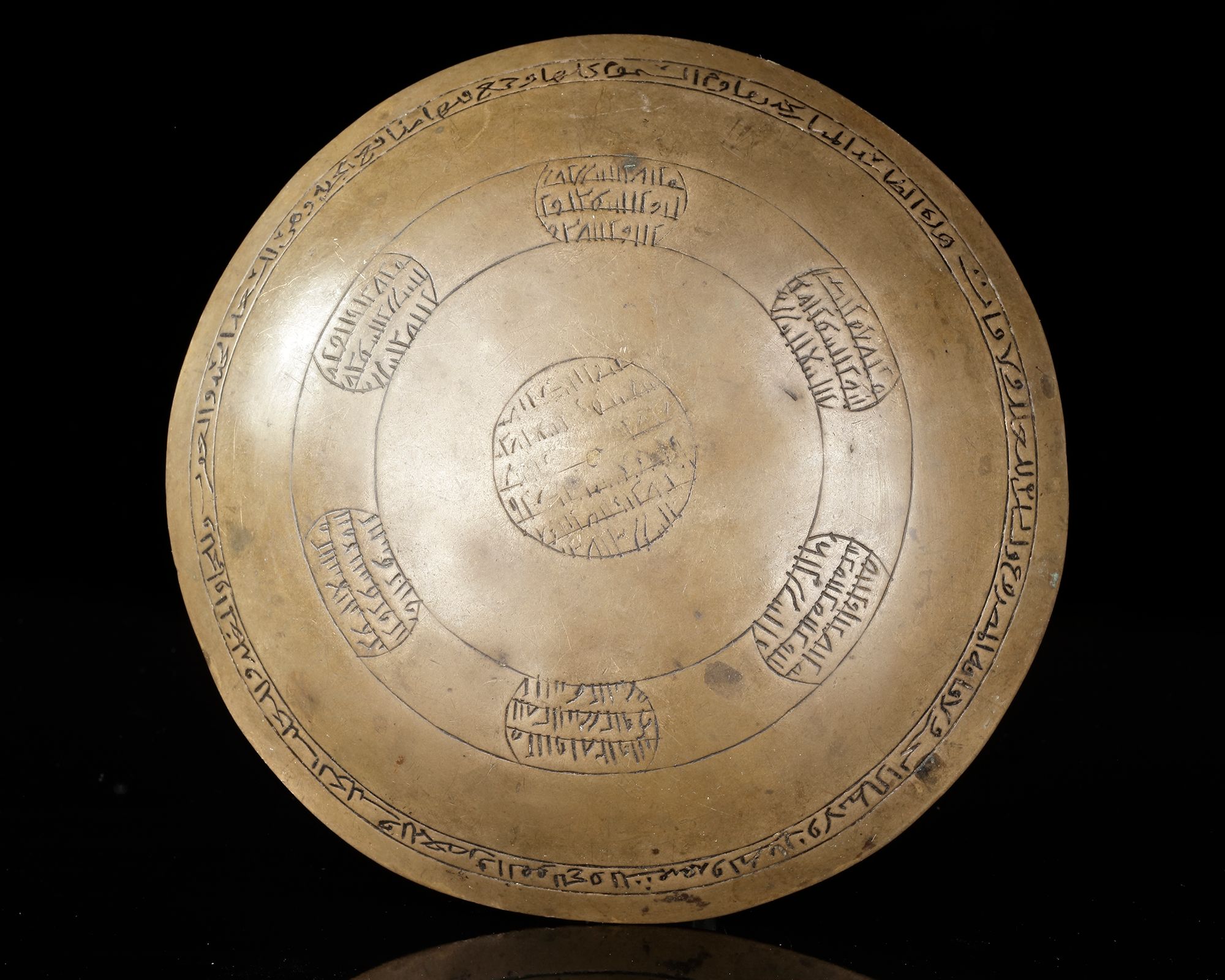 Of shallow rounded form, the well engraved with an intertwining ten-pointed star, the cavetto with a pattern of calligraphic and figurative panels depicting a spider, a snake, a quadruped and two stylised human forms, the rim with two bands of inscriptions, the exterior with a narrow calligraphic frieze over alternating medallions and trapezoids containing inscriptions, the base with a calligraphic roundel.