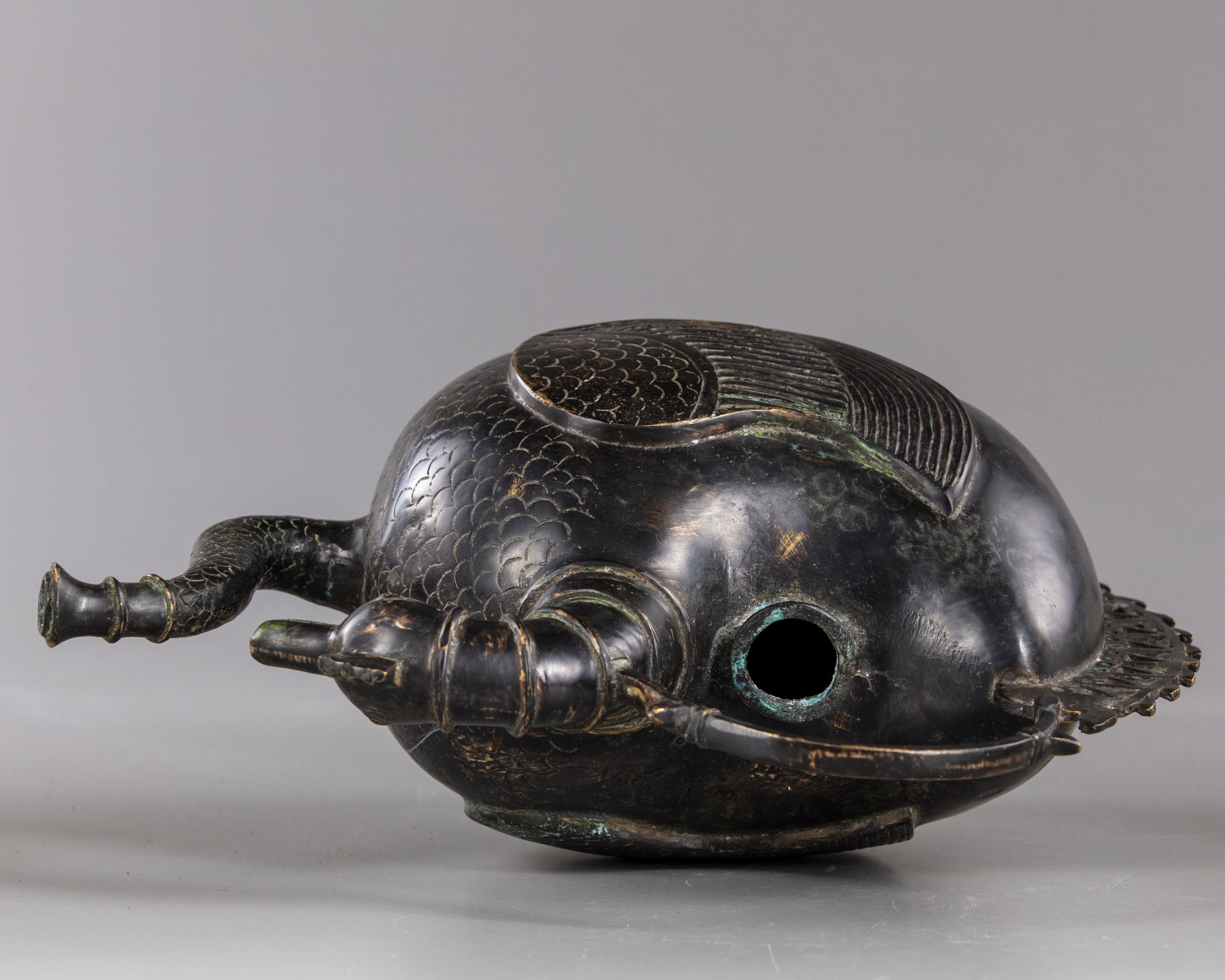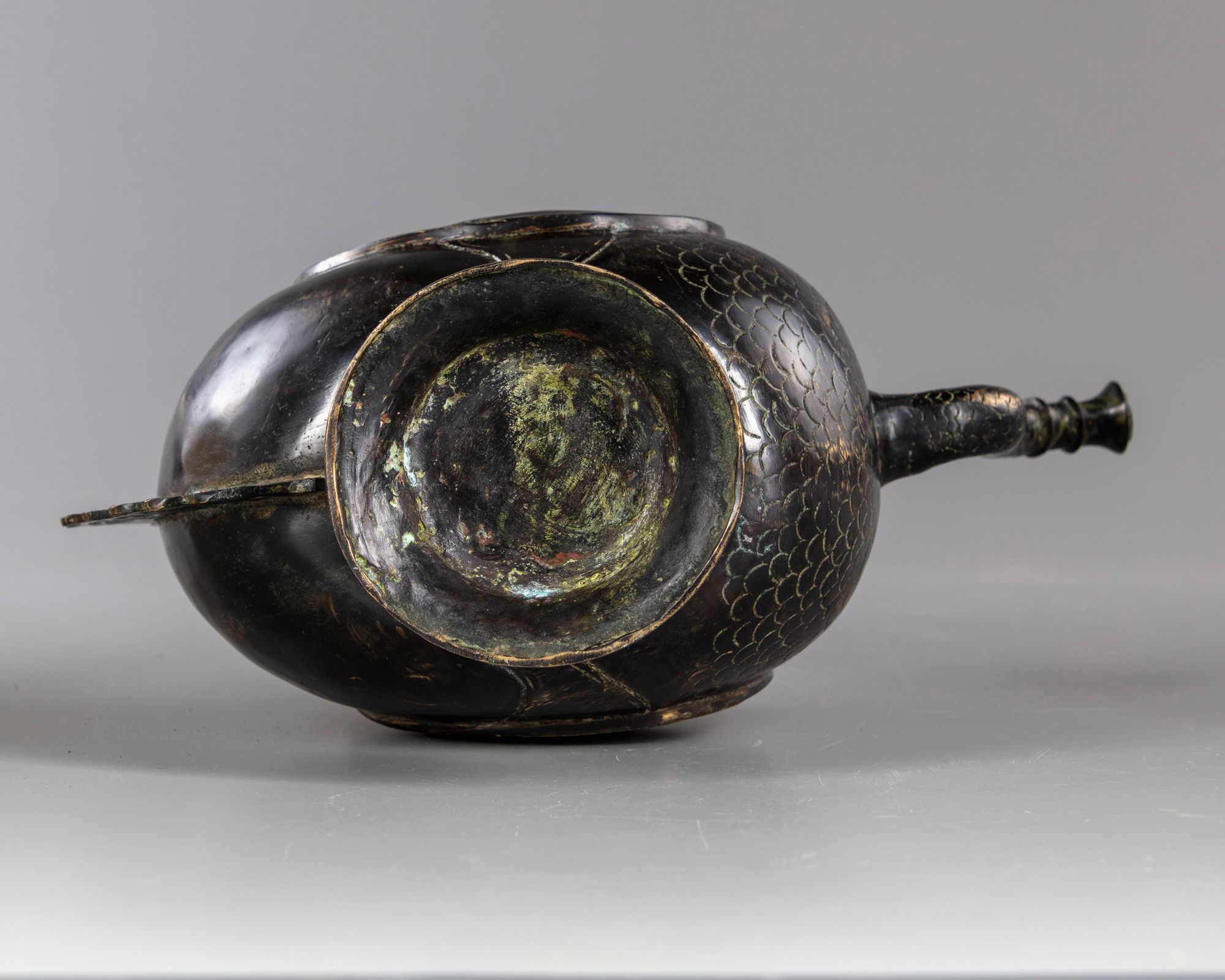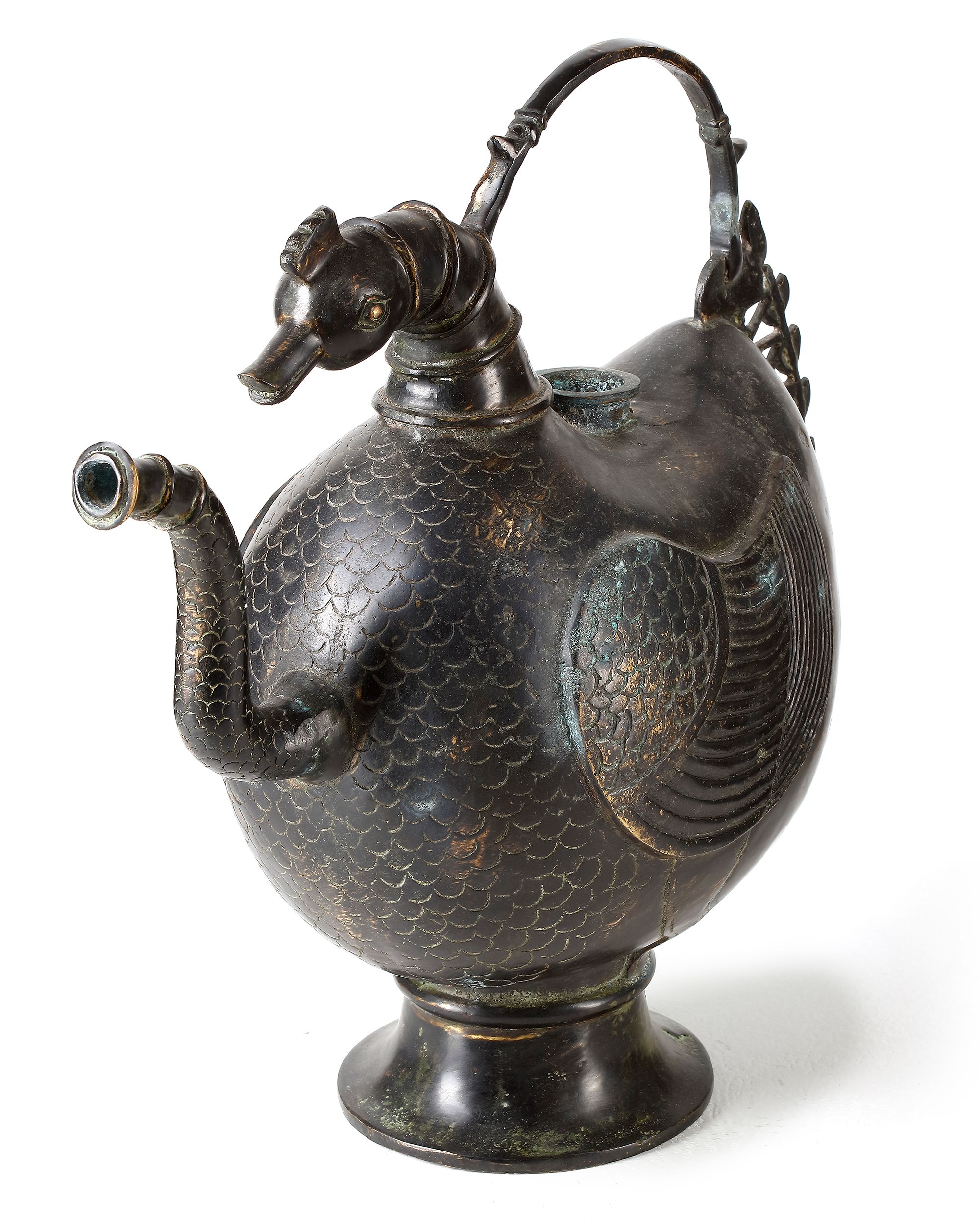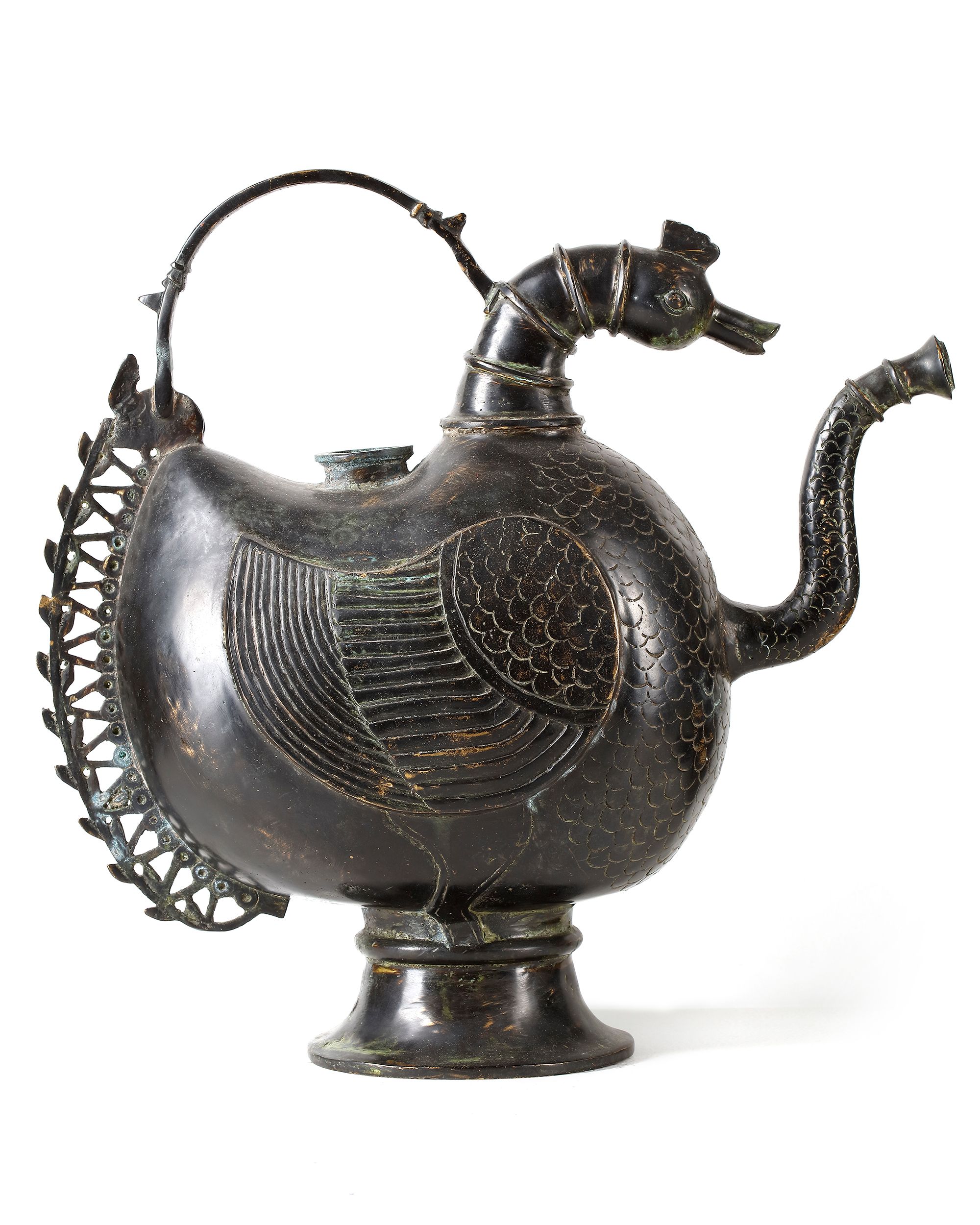 A 'cockerel' ewer, moulded standing on a spreading foot-ring with an S-shaped spout and a handle connecting the bird head shaped mouth with the tail feathers.