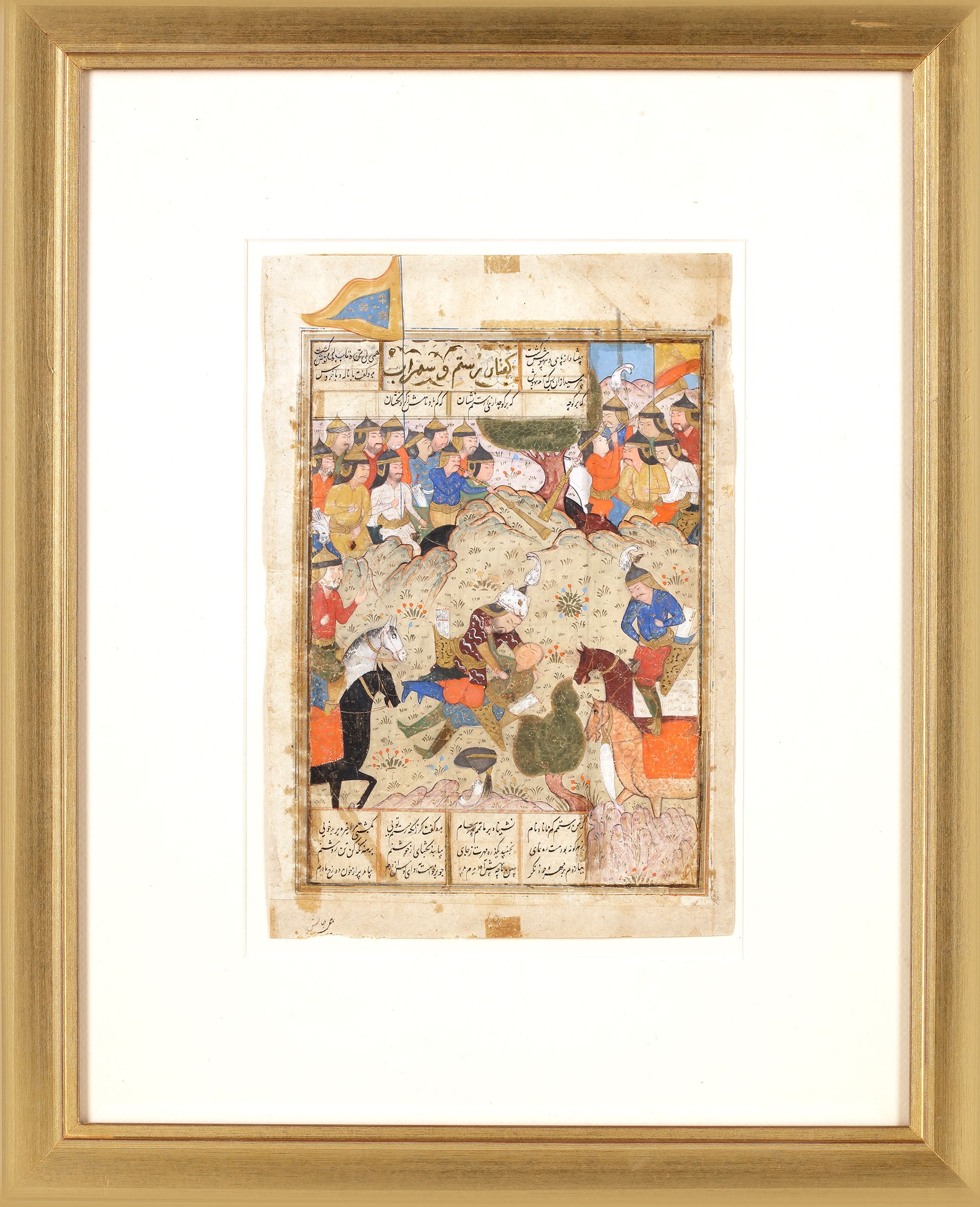 This poignant scene illustrates one of the most tragic episodes from Firdawsī’s Shāhnāma. The great hero Rustam, unaware that he had fathered a son with Princess Tahmina, encounters Suhrab on the battlefield, each fighting for opposing sides. Engaged in single combat, they struggle fiercely until Rustam delivers a fatal blow.