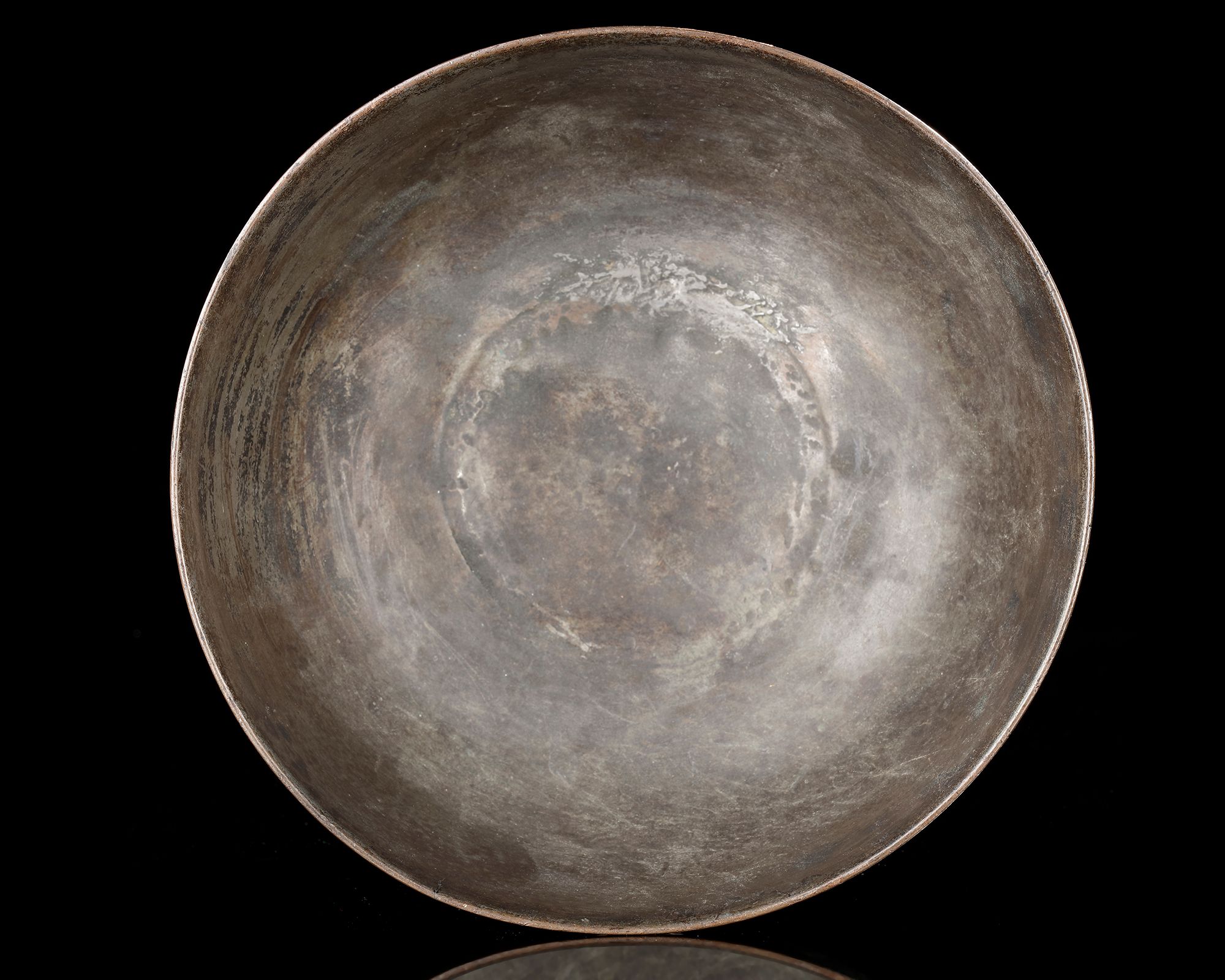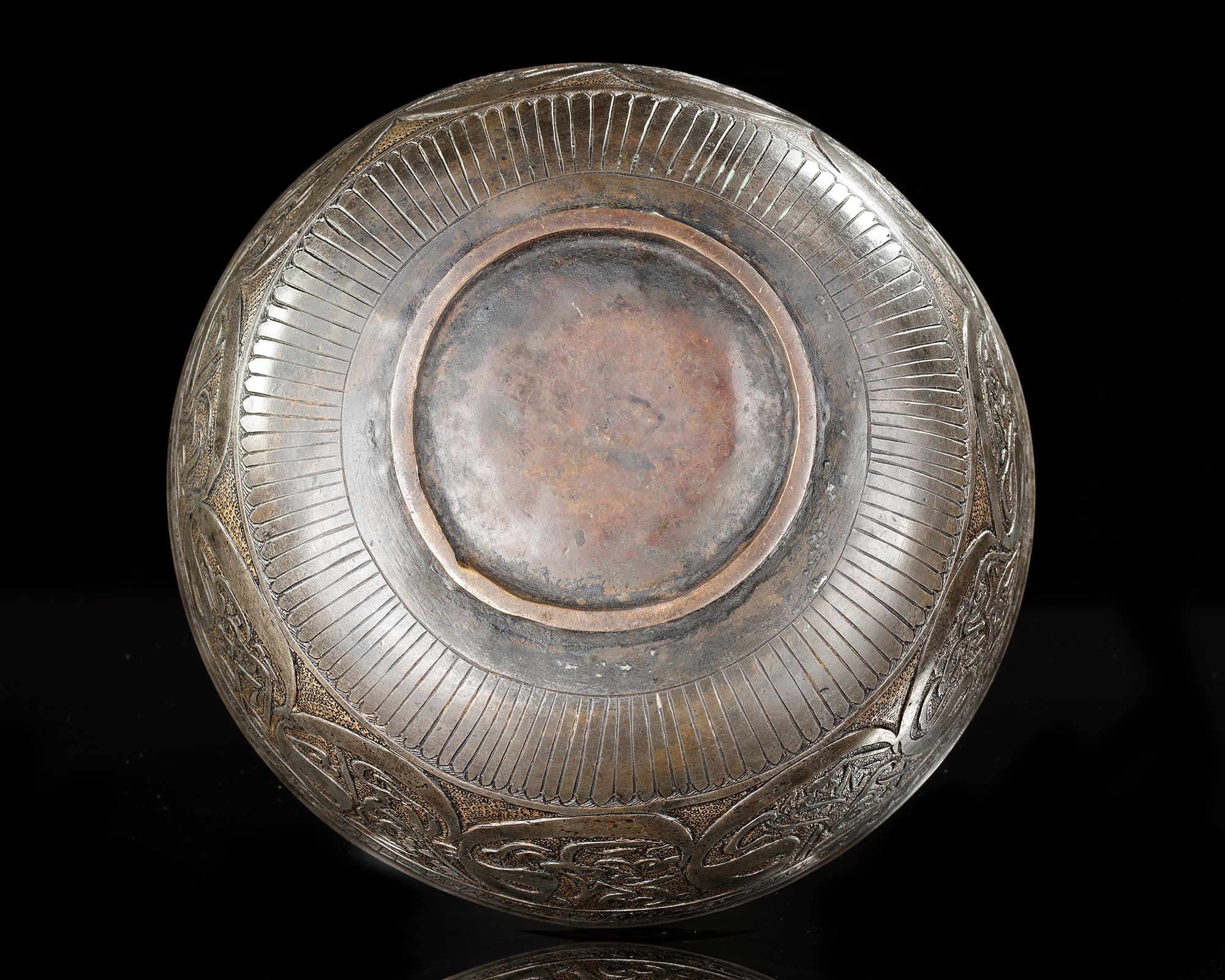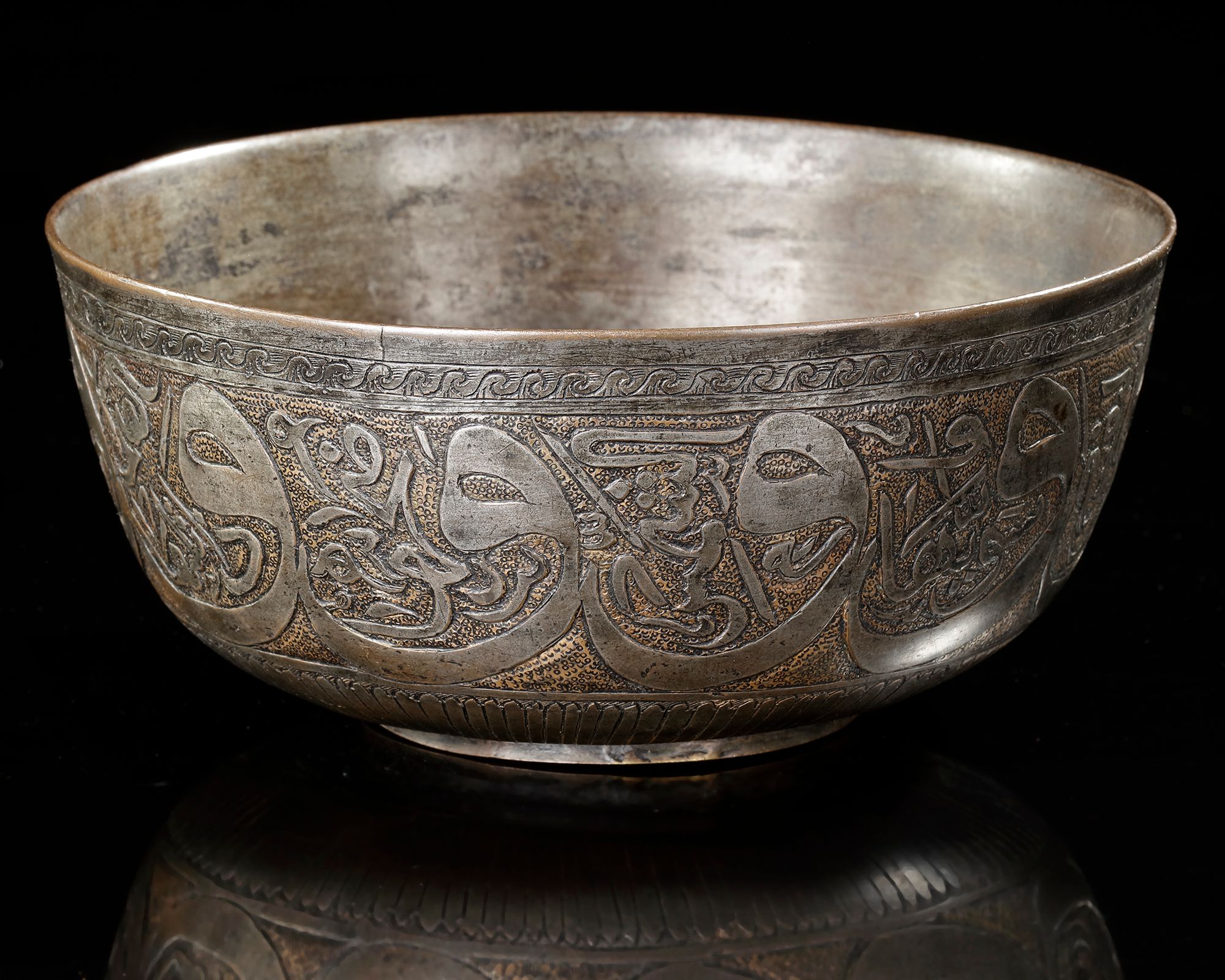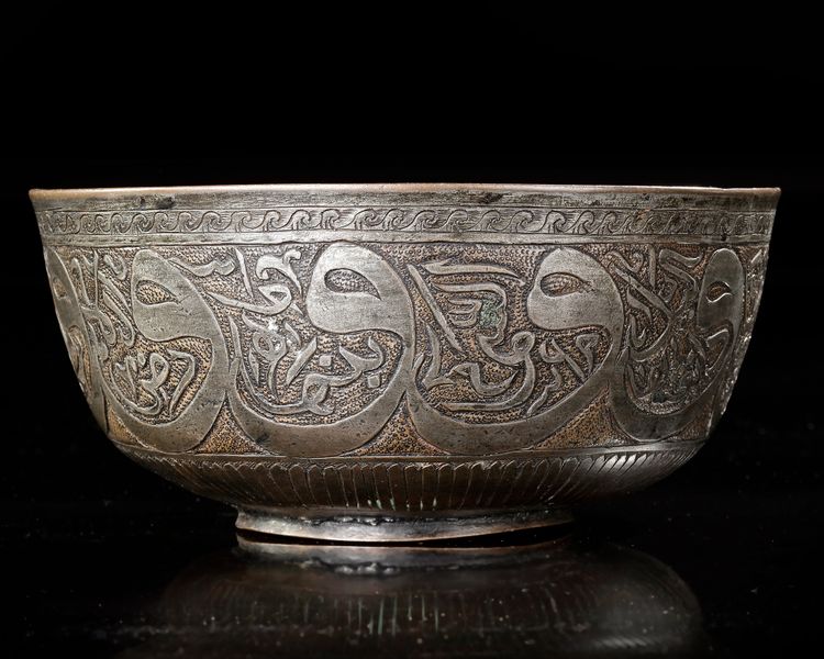 A finely engraved copper alloy bowl from Safavid Persia, dating to the 17th century. The exterior is adorned with a continuous band of elegant calligraphic cartouches, likely in nastaʿlīq script, set against a textured ground and framed by delicate scrollwork. The shallow rounded form rests on a small foot, typical of Safavid metal vessels. Such bowls were often decorated with poetic or religious inscriptions.