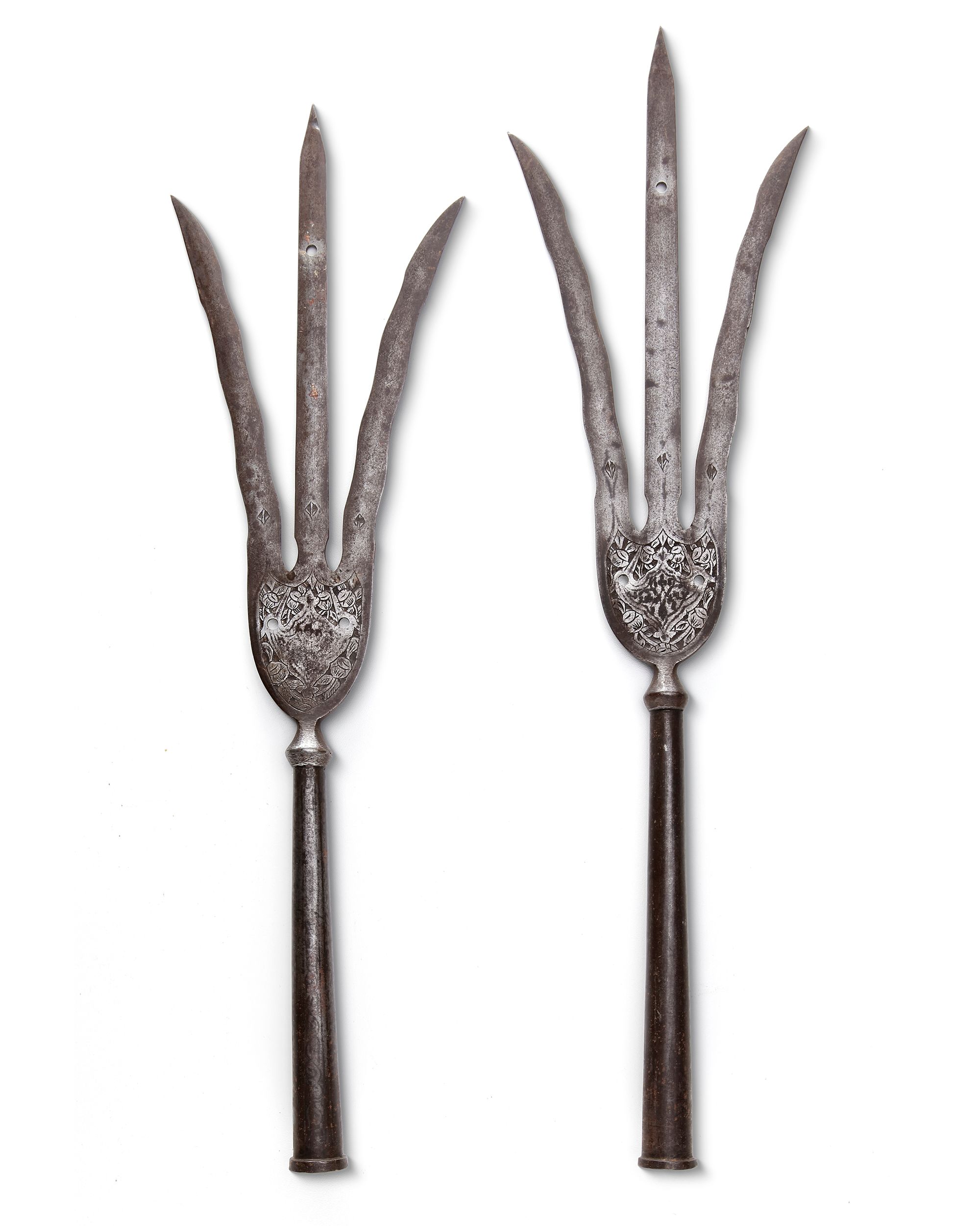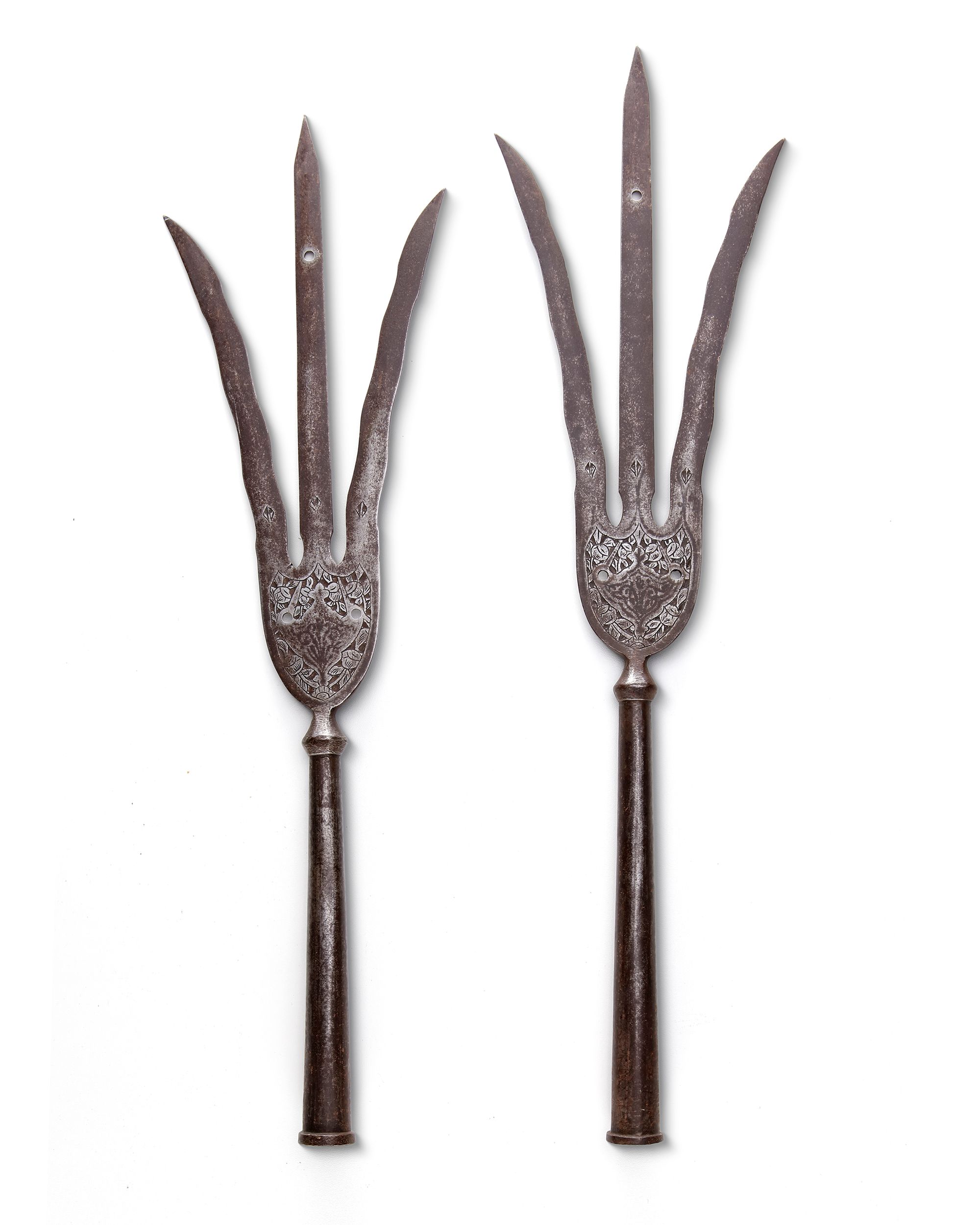 A dense triangular midsection and a slender head terminating in a straight central prong flanked by two gently undulating prongs. At the base of each prong appears a small etched floral motif, while the main body is richly decorated with densely engraved foliate designs surrounding an abstract cruciform emblem at the center. The trident, or trishula, is an ancient and powerful symbol in Hindu mythology, representing divine authority and cosmic power. It is most famously associated with the god Shiva and, according to certain traditions, is also believed to have been the weapon used to sever the original head of the elephant-headed god Ganesha.
