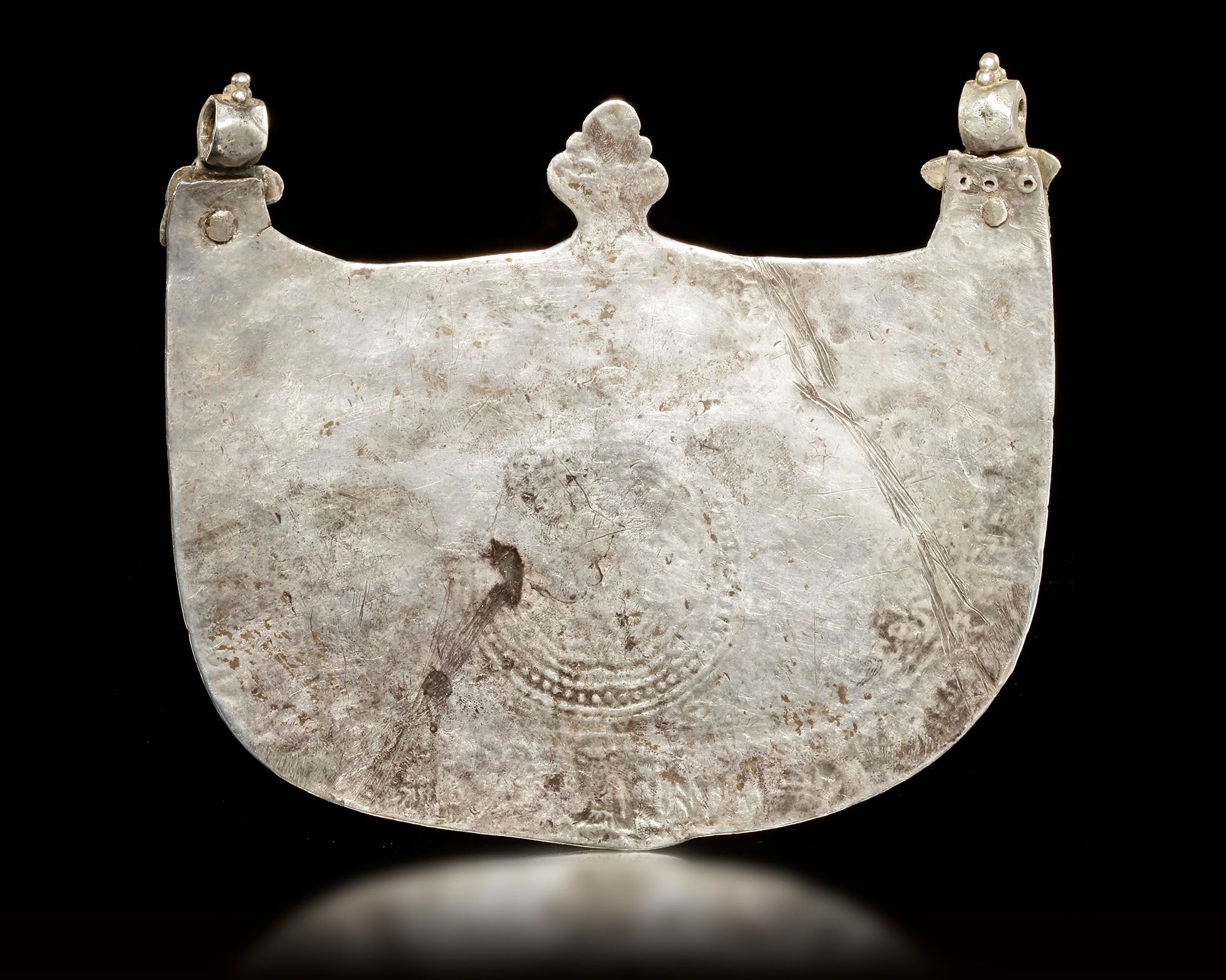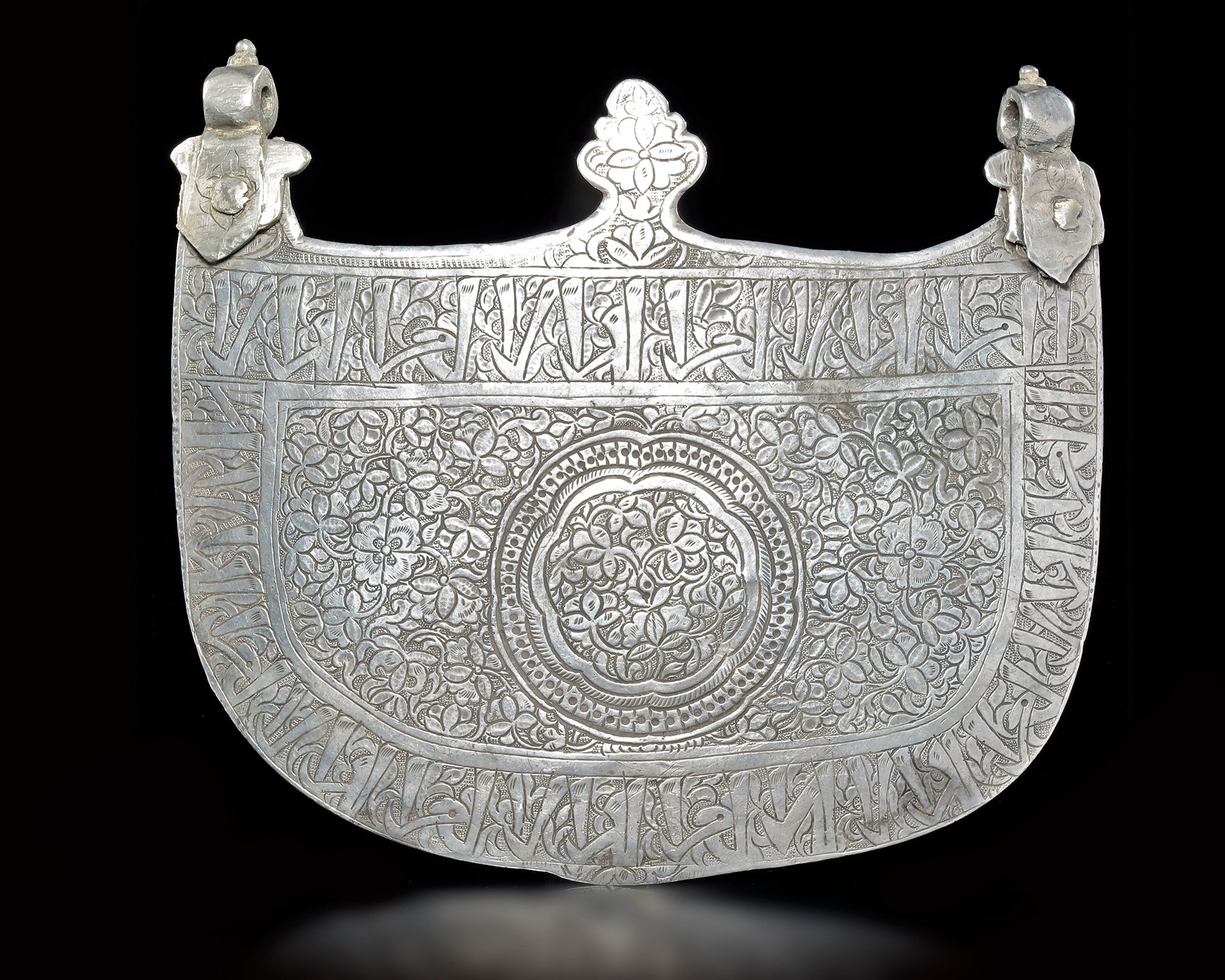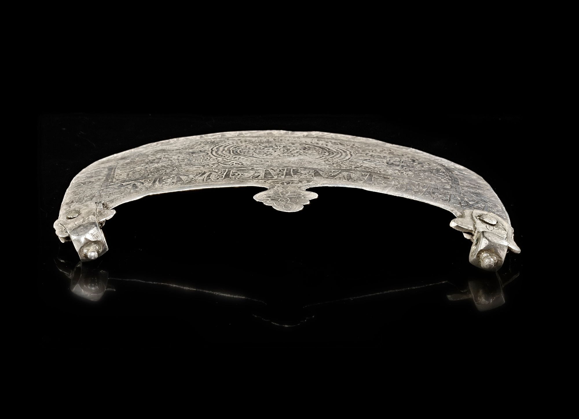 Curved form with horn-like finials, each with a lobed a finely engraved Timurid silver pectoral of curved form, terminating in horn-like finials with suspension loops. the surface is richly decorated with dense floral arabesques centered on a circular medallion of interlacing vegetal motifs.